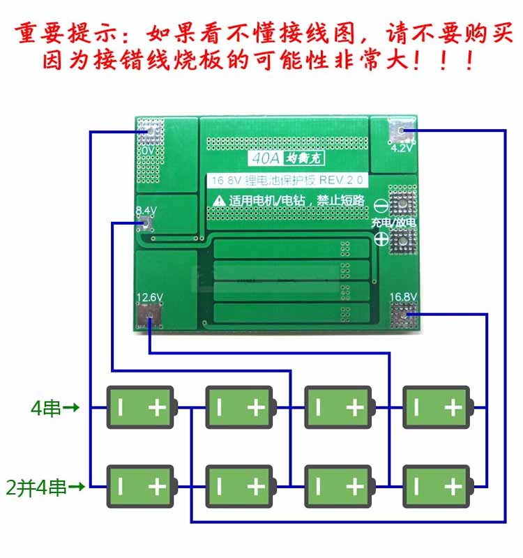 注意事项2:严格按图接线0V、4.2V、8.4V、12.6V、16.8V,不要故意短路。