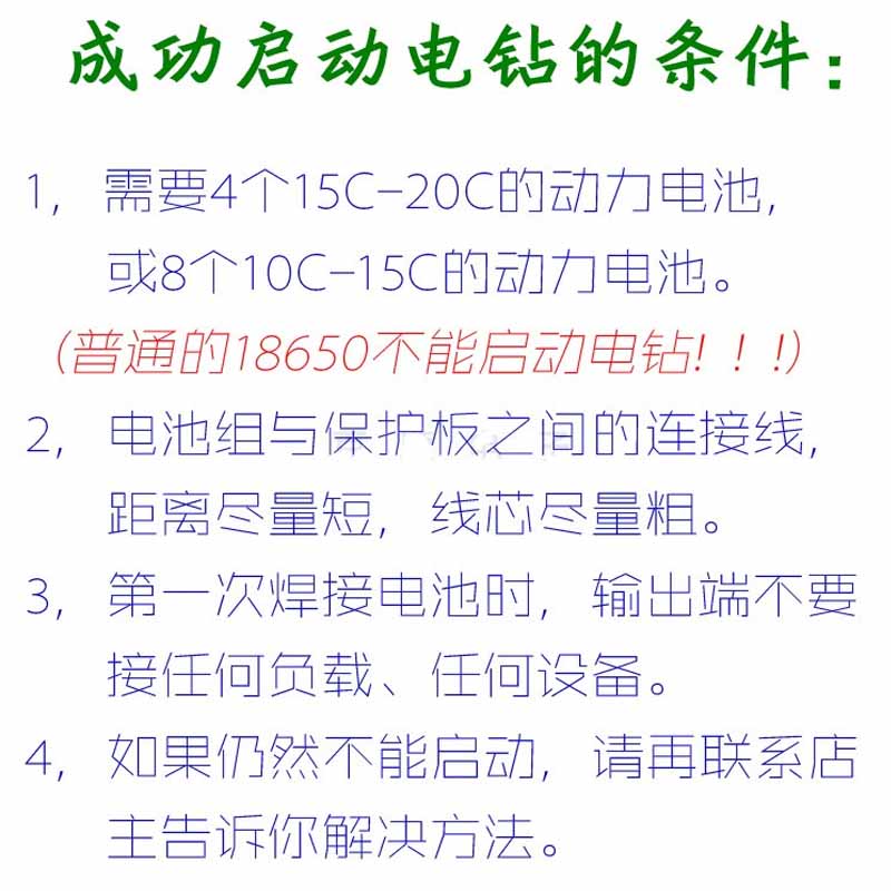 注意事项1:成功启动电钻需要4个15C-20C的动力电池,或8个10C-15C的动力电池(普通的18650不能启动电钻! ! !)。
