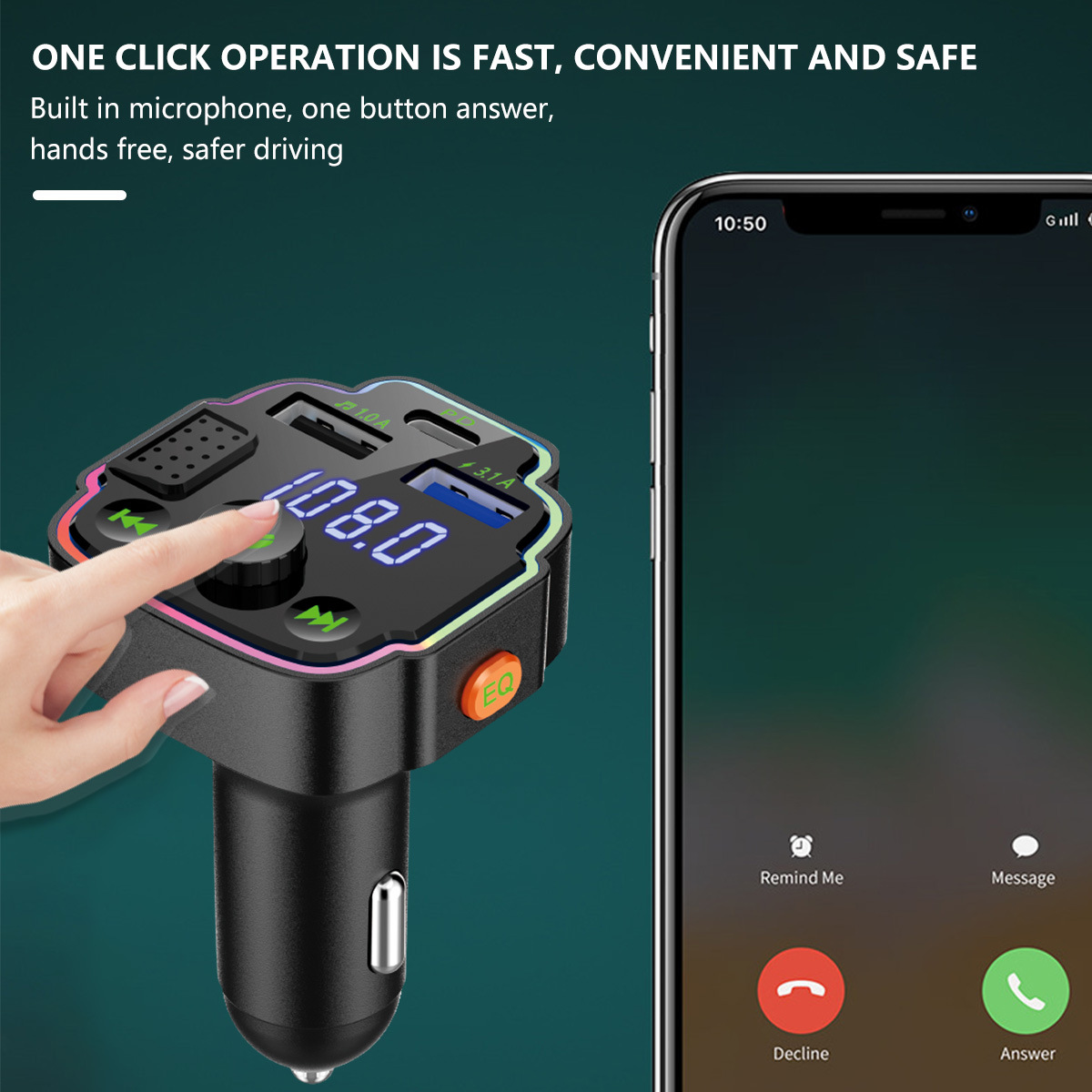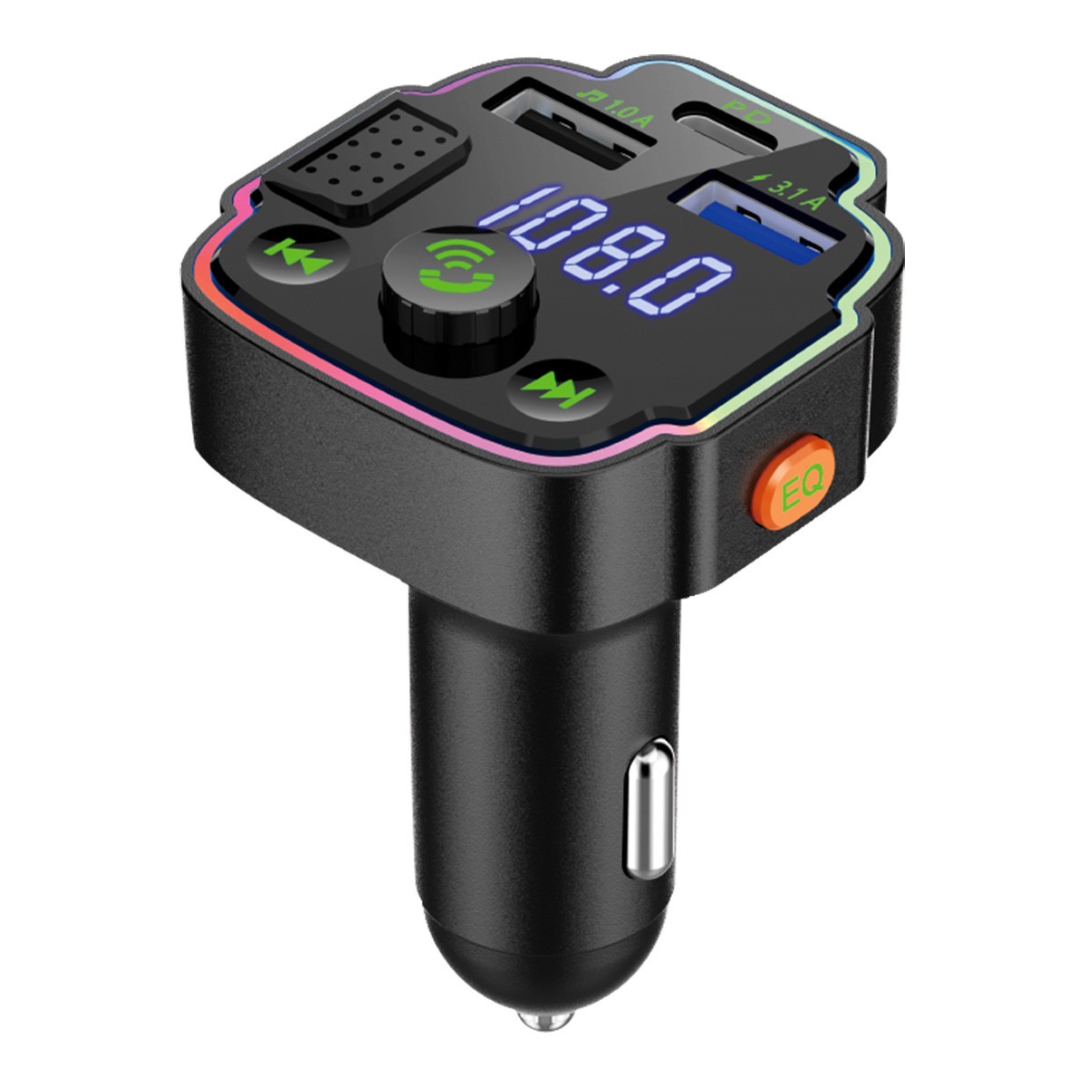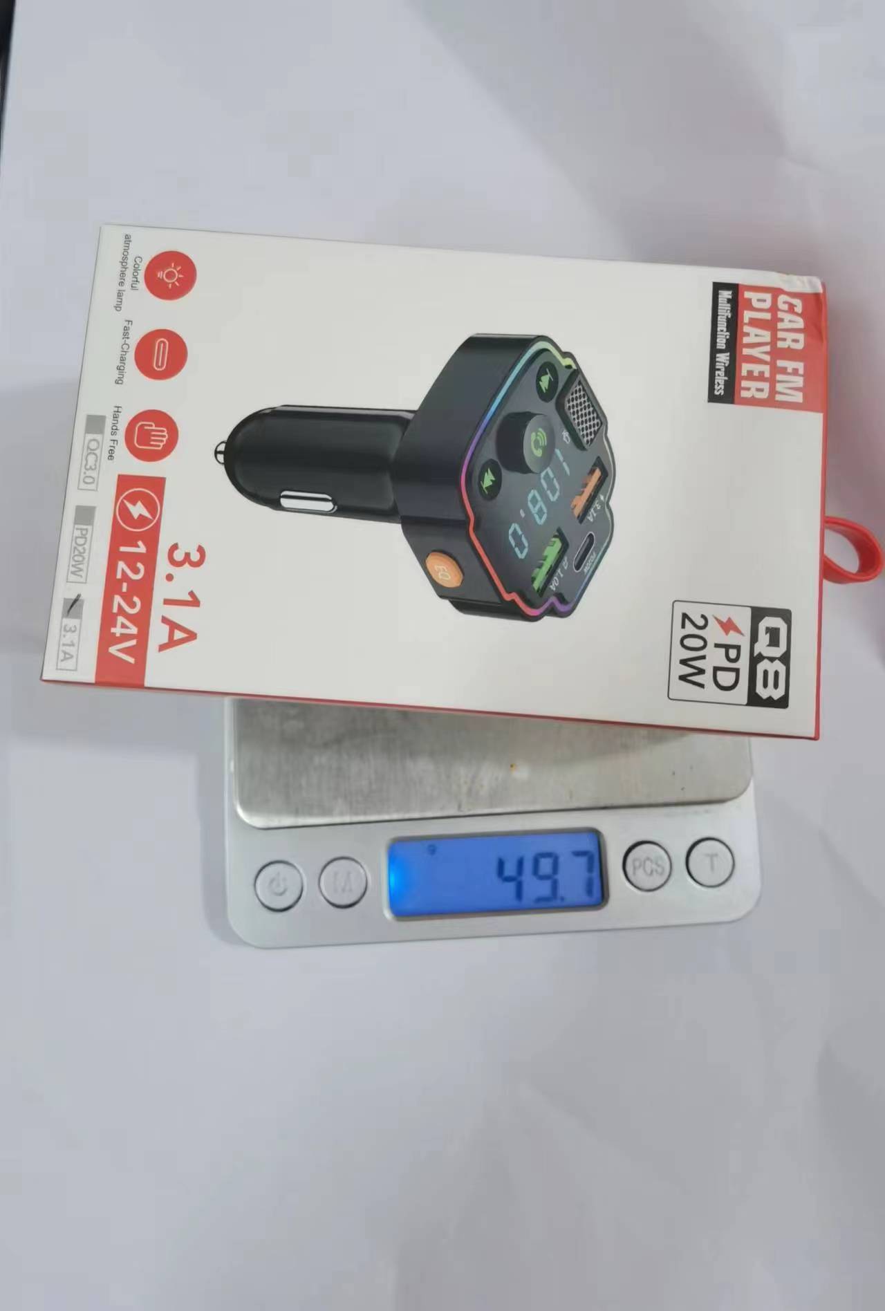 [Con dos puertos USB y PD]El transmisor FM tiene 2 puertos de carga USB y una interfaz PD 20W, y el voltaje de salida es de 5V 1.5A o 5V 3.1A; El voltaje de entrada es de 12-24V,. Que puede cargar varios teléfonos móviles al mismo tiempo.