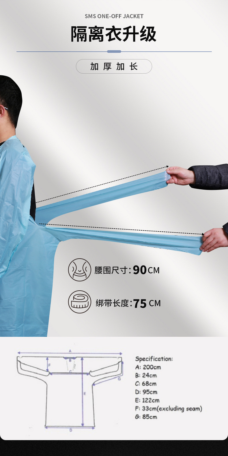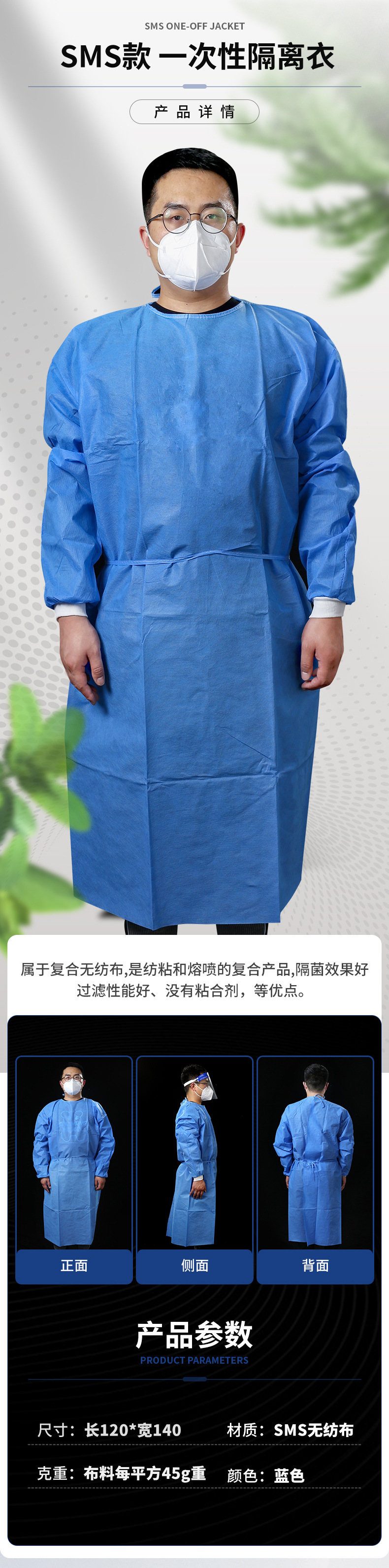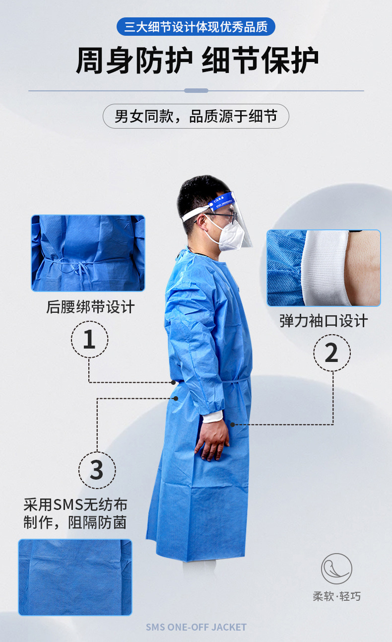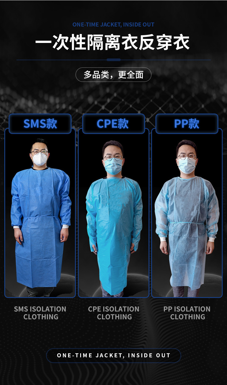 Одноразовое изолирующее платье sms Дышащий пыленепроницаемый нетканый материал Защитная одежда SMS Обратный туалетный чехол Вязаная манжета Платье CPE