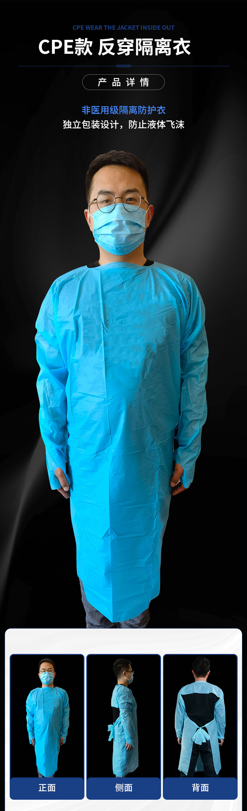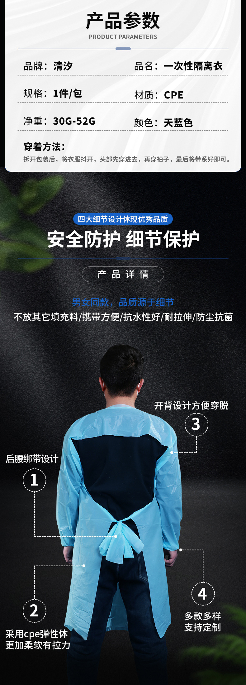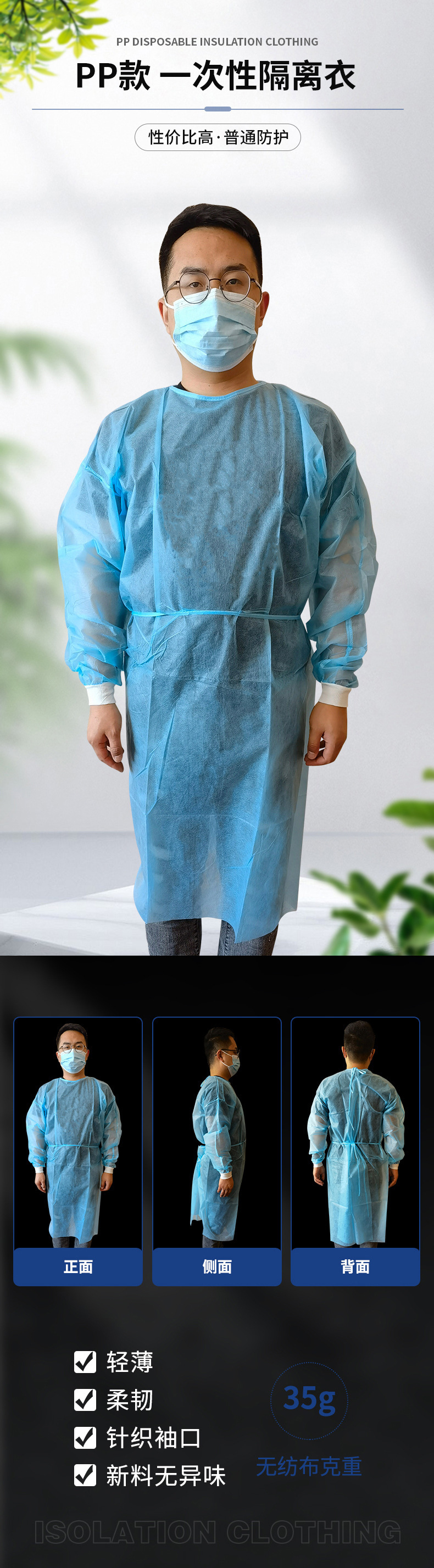 Одноразовое изолирующее платье sms Дышащий пыленепроницаемый нетканый материал Защитная одежда SMS Обратный туалетный чехол Вязаная манжета Платье CPE