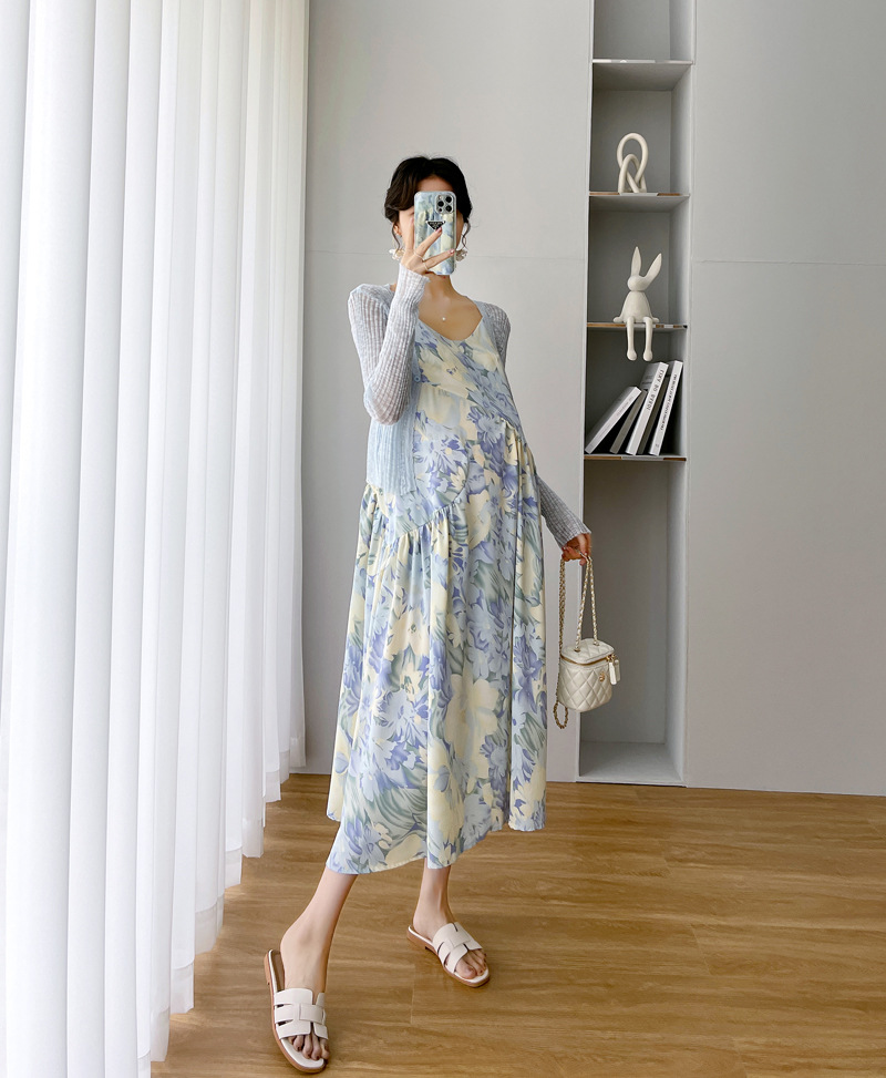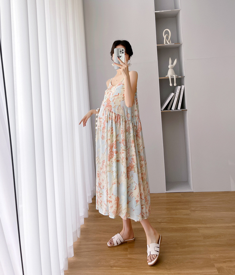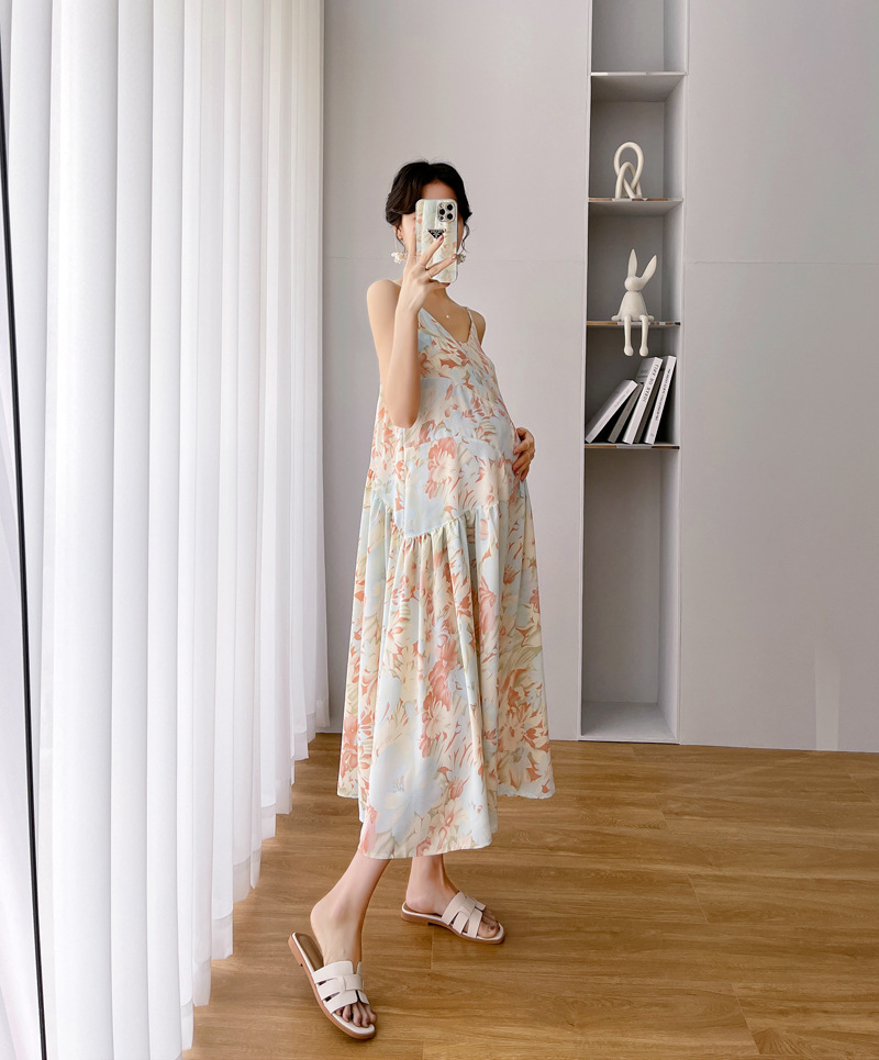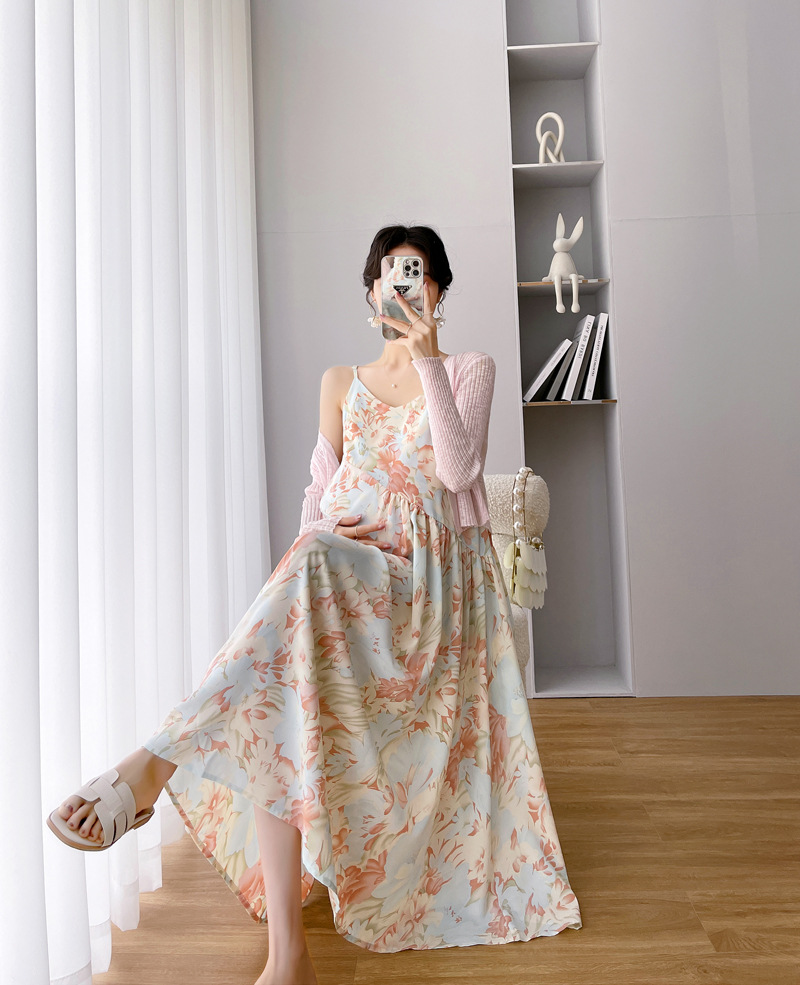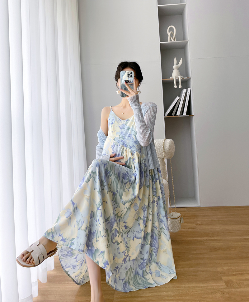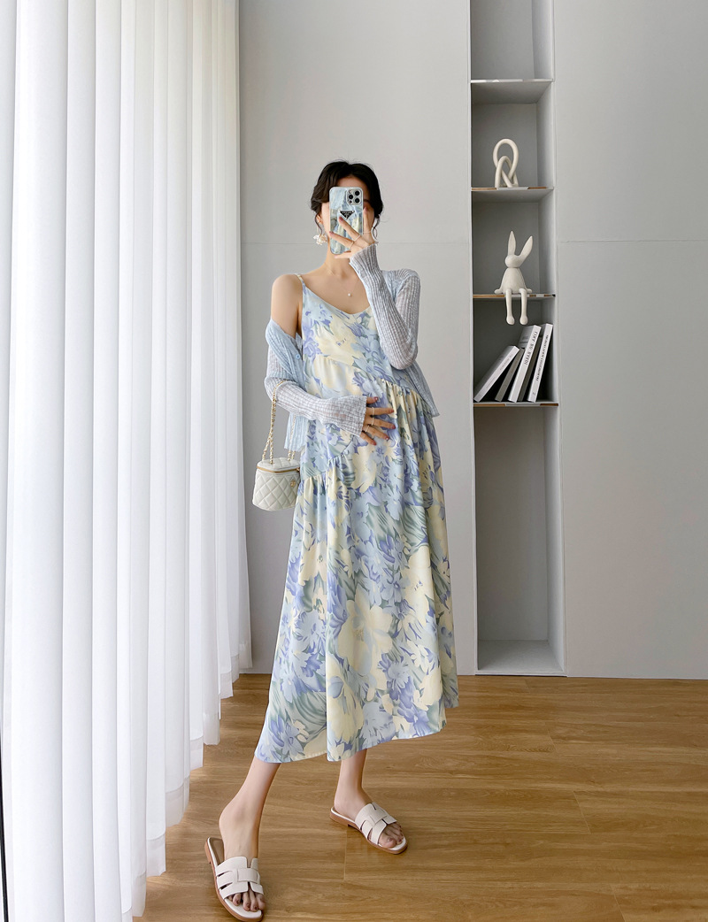 Костюм для беременных, летнее тонкое шифоновое платье с цветочным принтом, уменьшающее Возраст платье + солнцезащитный топ из двух предметов