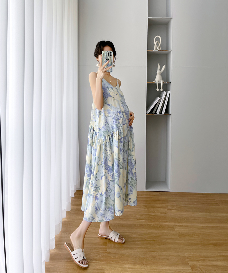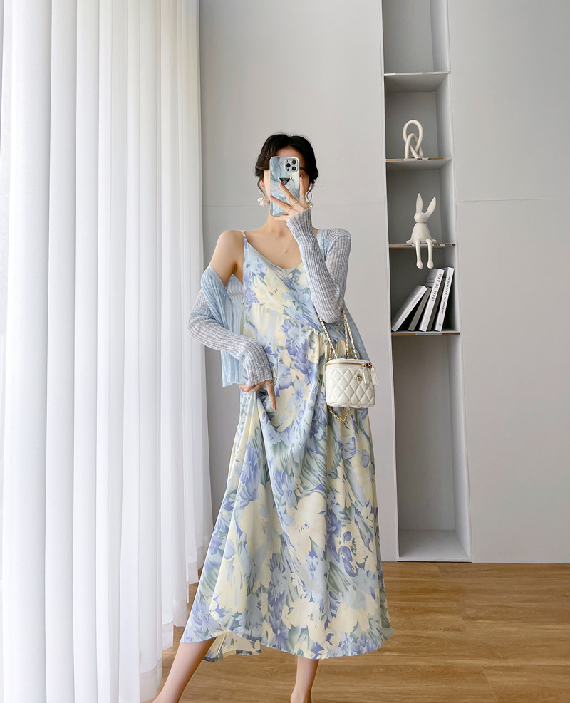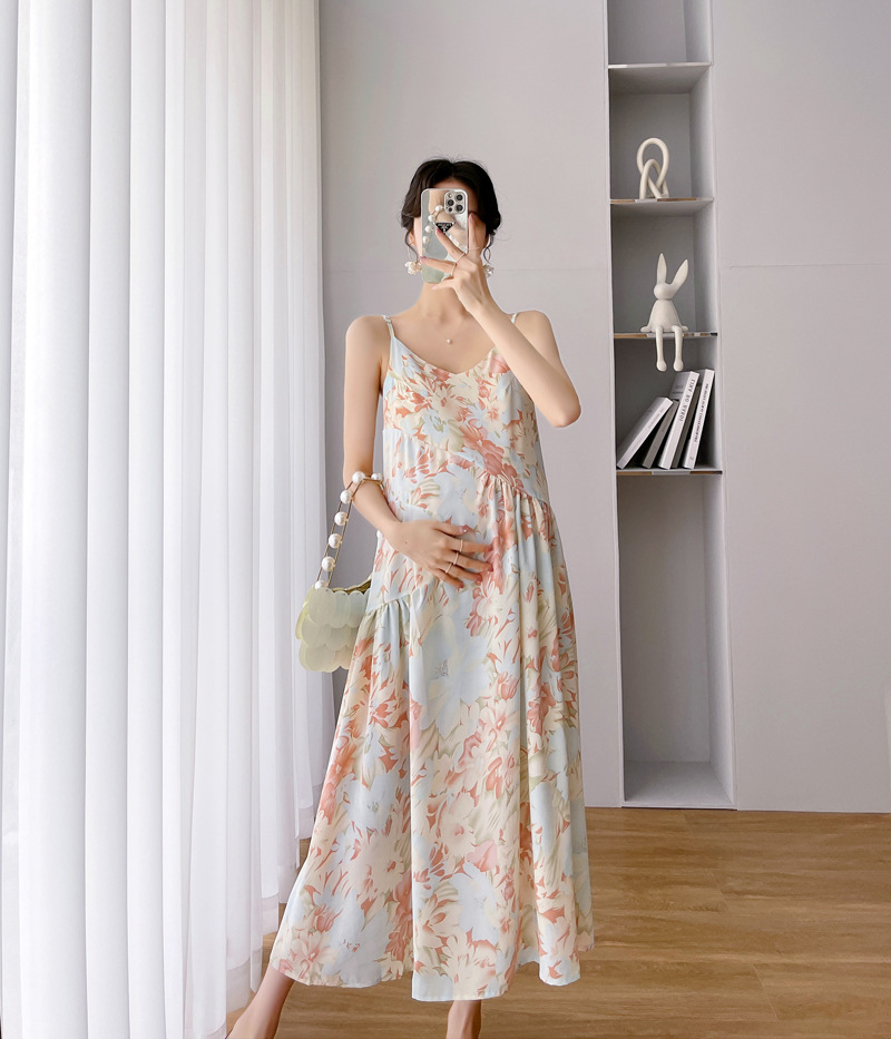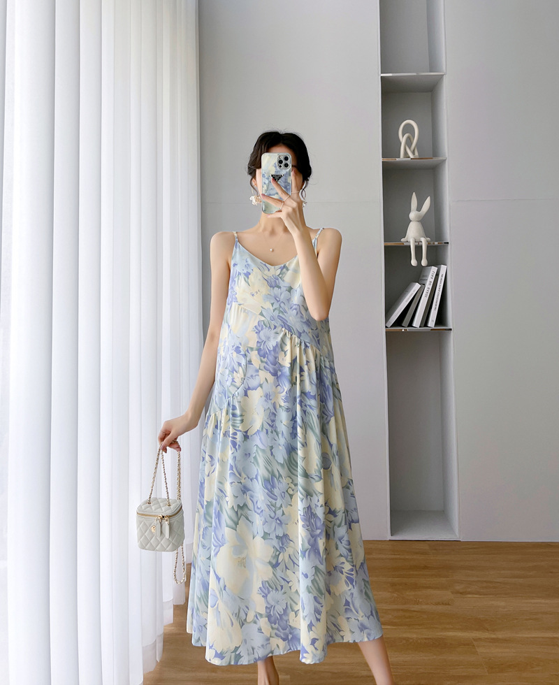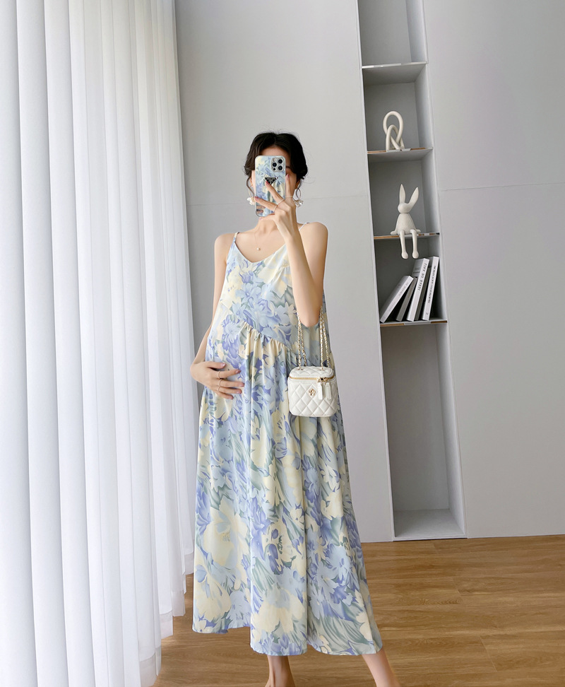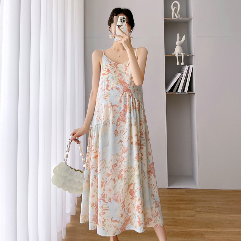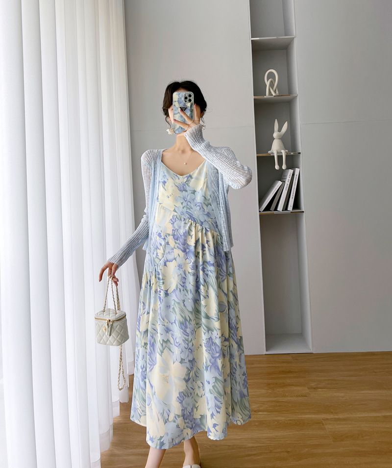 Костюм для беременных, летнее тонкое шифоновое платье с цветочным принтом, уменьшающее Возраст платье + солнцезащитный топ из двух предметов