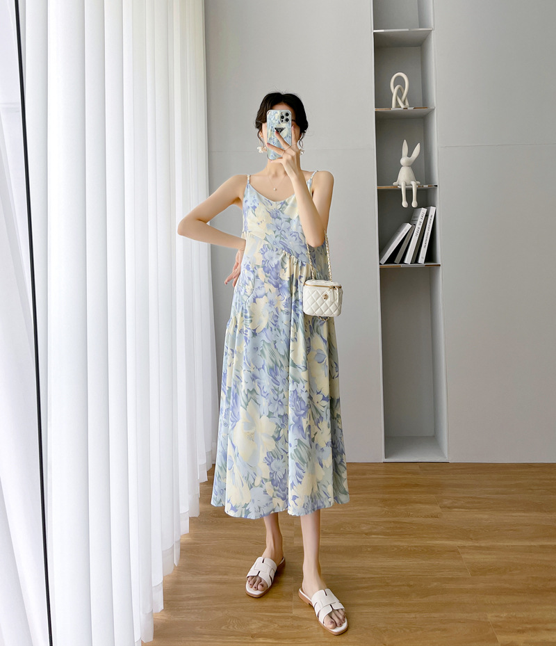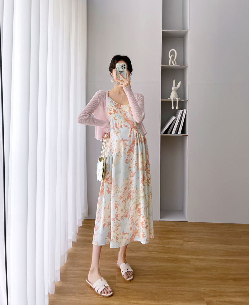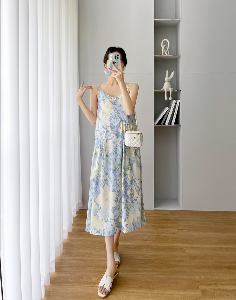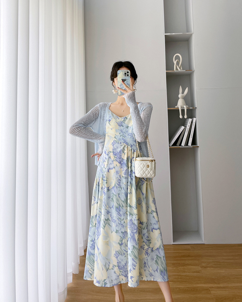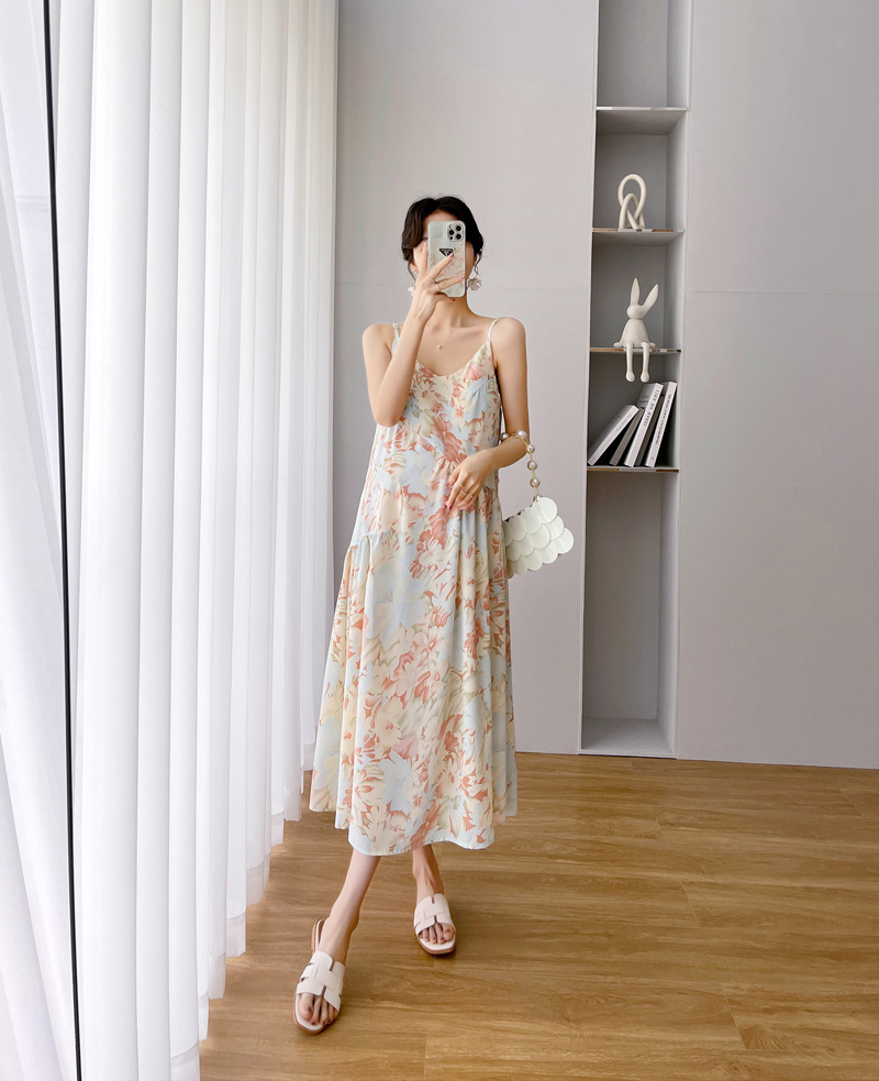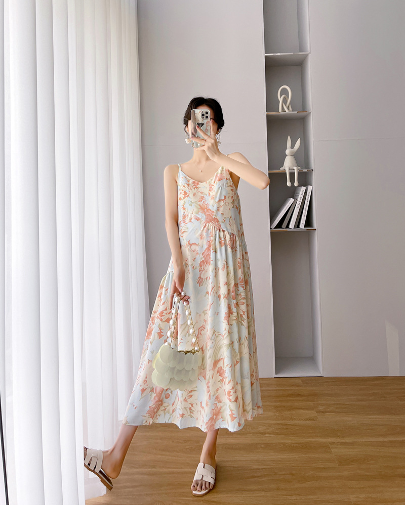 Костюм для беременных, летнее тонкое шифоновое платье с цветочным принтом, уменьшающее Возраст платье + солнцезащитный топ из двух предметов