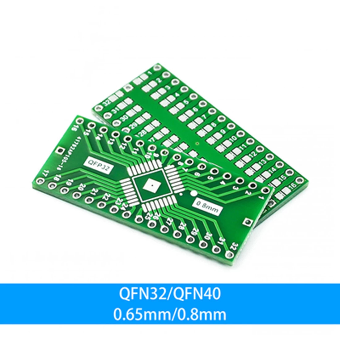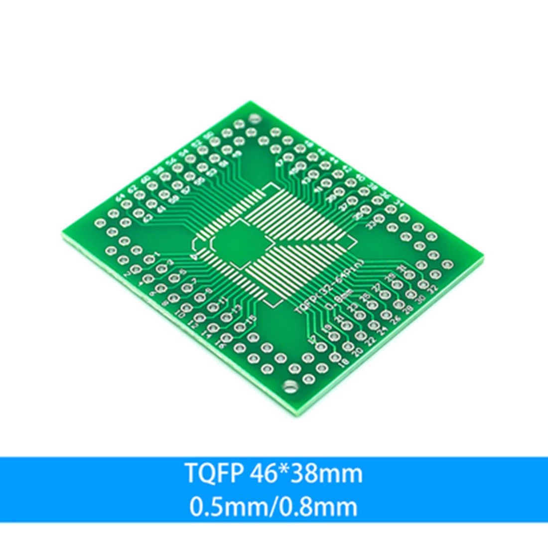 引脚间距0.8mm,适用于将常用QFP、TQFP、LQFP、FQFP等兼容32pin~64pin的封装转接成DIP直插。