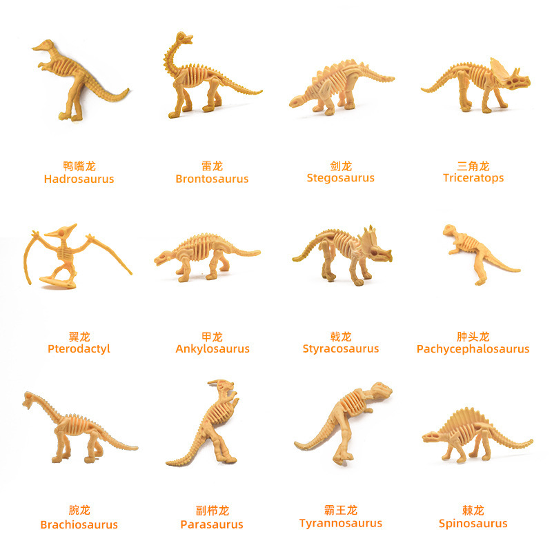 Скелет тираннозавра Рекс; Скелет Стегозавра; Скелет трицератопса; Скелет аллигатора; Скелет Верхнего Дракона; Скелет птерозавра; Набор землеройных инструментов из трех частей; 12 миниатюрных скелетов динозавров (смешанные волосы); Скелет серебристого тираннозавра Рекс; Светящийся скелет Стегозавра; Скелет нотилука трицератопса; Скелет крокозавра ноктилука; Серебристый Скелет дракона; Серебристый Скелет птерозавра