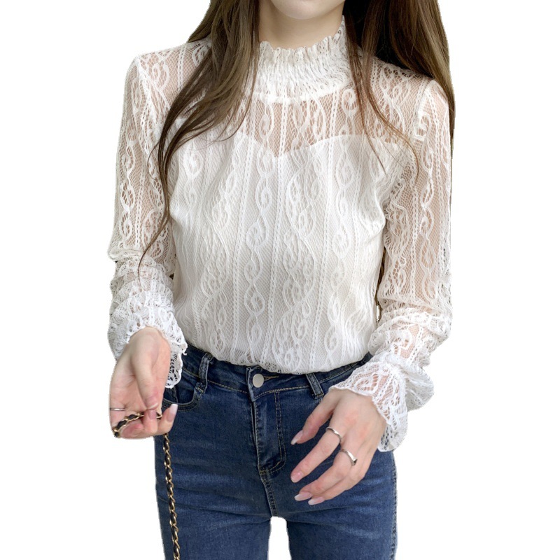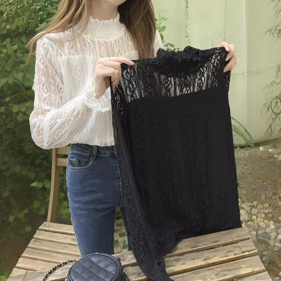 Новинка осени и зимы, Женская кружевная Базовая рубашка с высоким воротником, Женский Стильный двухслойный длинный сетчатый топ с длинными рукавами и внутренней частью