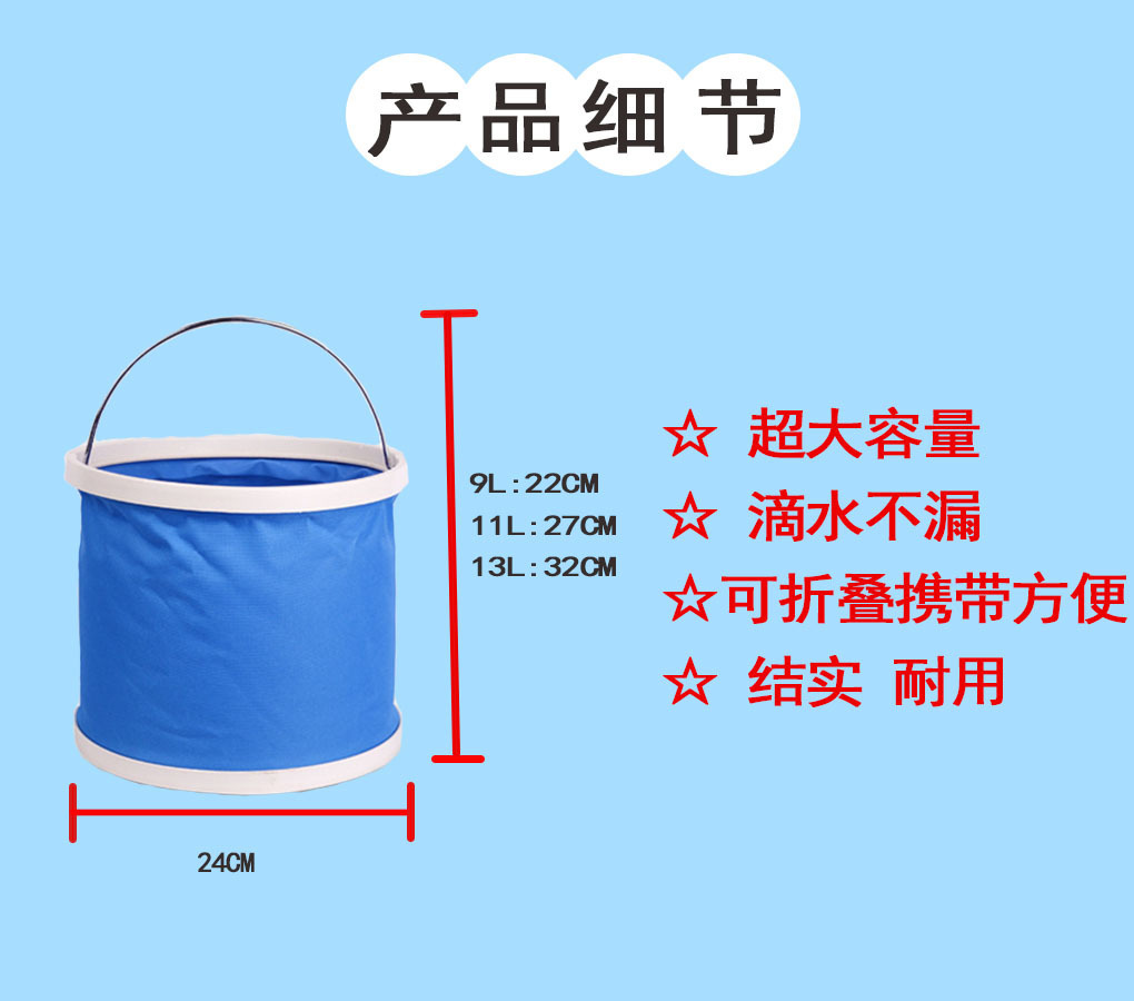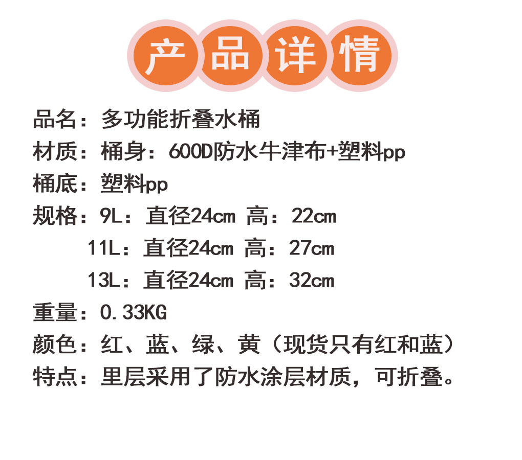 水桶桶身:由牛津布加上塑料(聚缘乙稀)涂层,合成防水布材料制造。