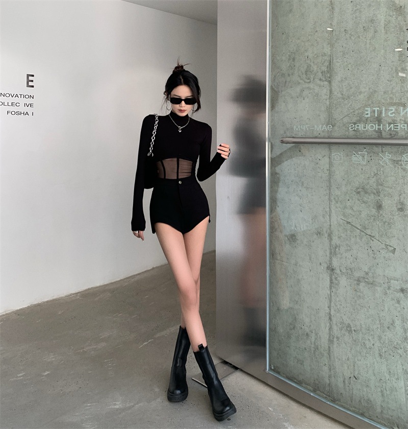 Весенне-осенняя облегающая короткая дизайнерская футболка в чистом стиле с сетчатой отстрочкой и длинным рукавом, Базовая рубашка, женская модная рубашка