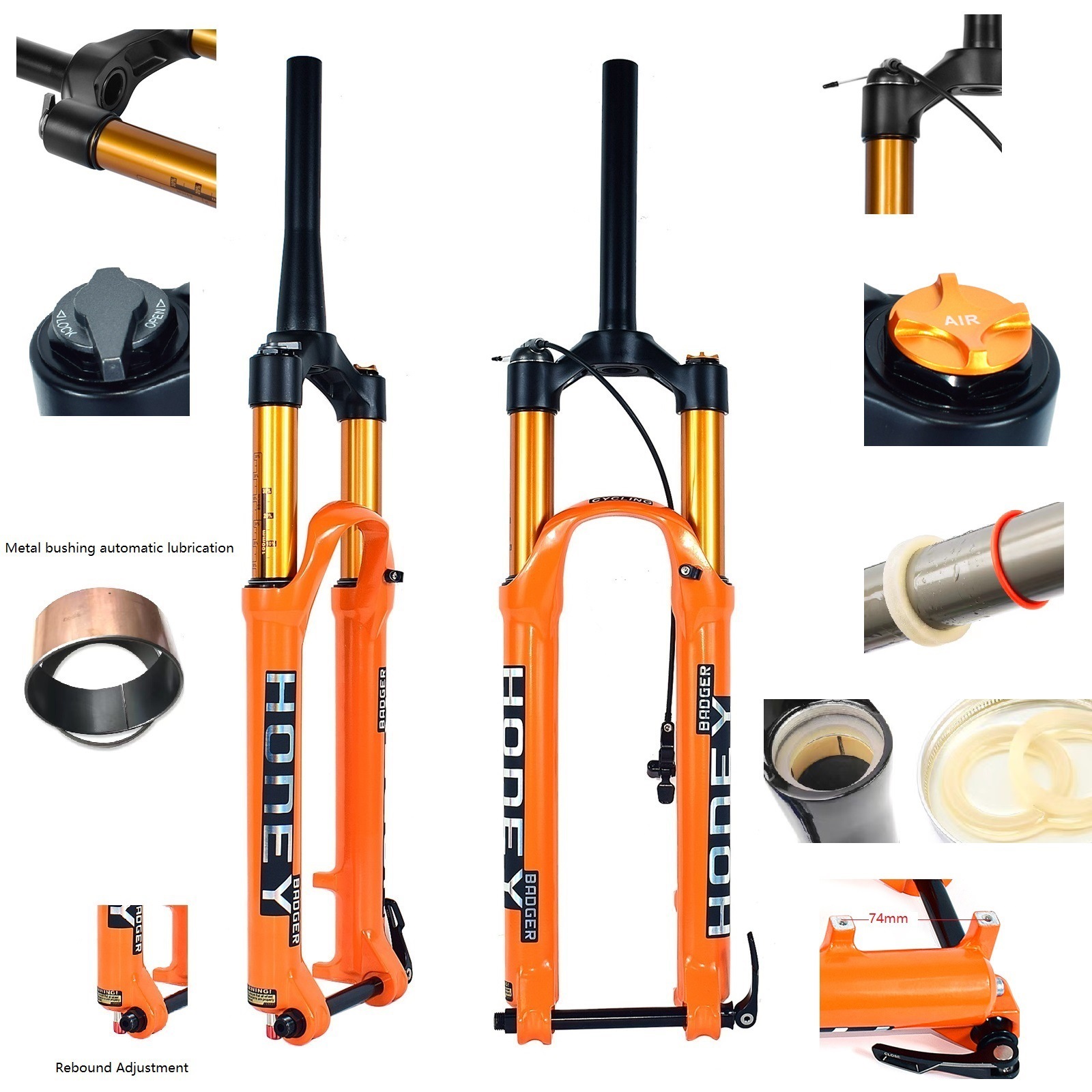 【卓越性能与材質】HONEY BADGER 山地自行车空气叉采用镁合金生产叉腿部件,所以更轻强度更好,内部使用金属衬套,优点是加强叉子的坚固性并更加润滑,金属衬套也称为不需要润滑油的轴承,这将更好的保护支柱管并且不会磨损,叉子不会因为使用时间长而松旷,这是非常好的体验,支柱管使用了海棉圈浸油润滑处理,保护了支柱管和油封的润滑,不会造成磨损退色,还使的叉子更灵敏。