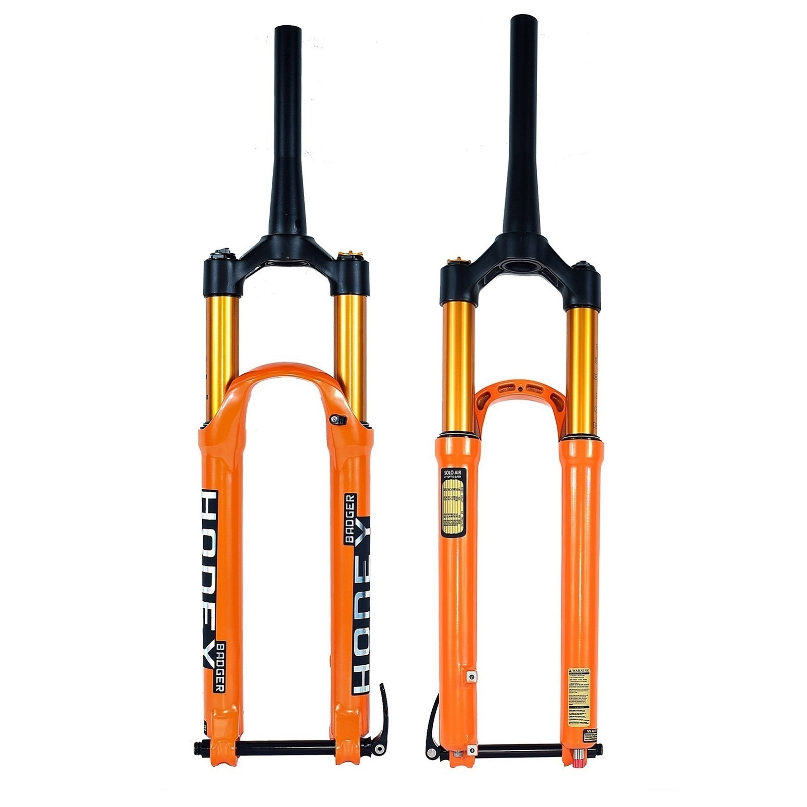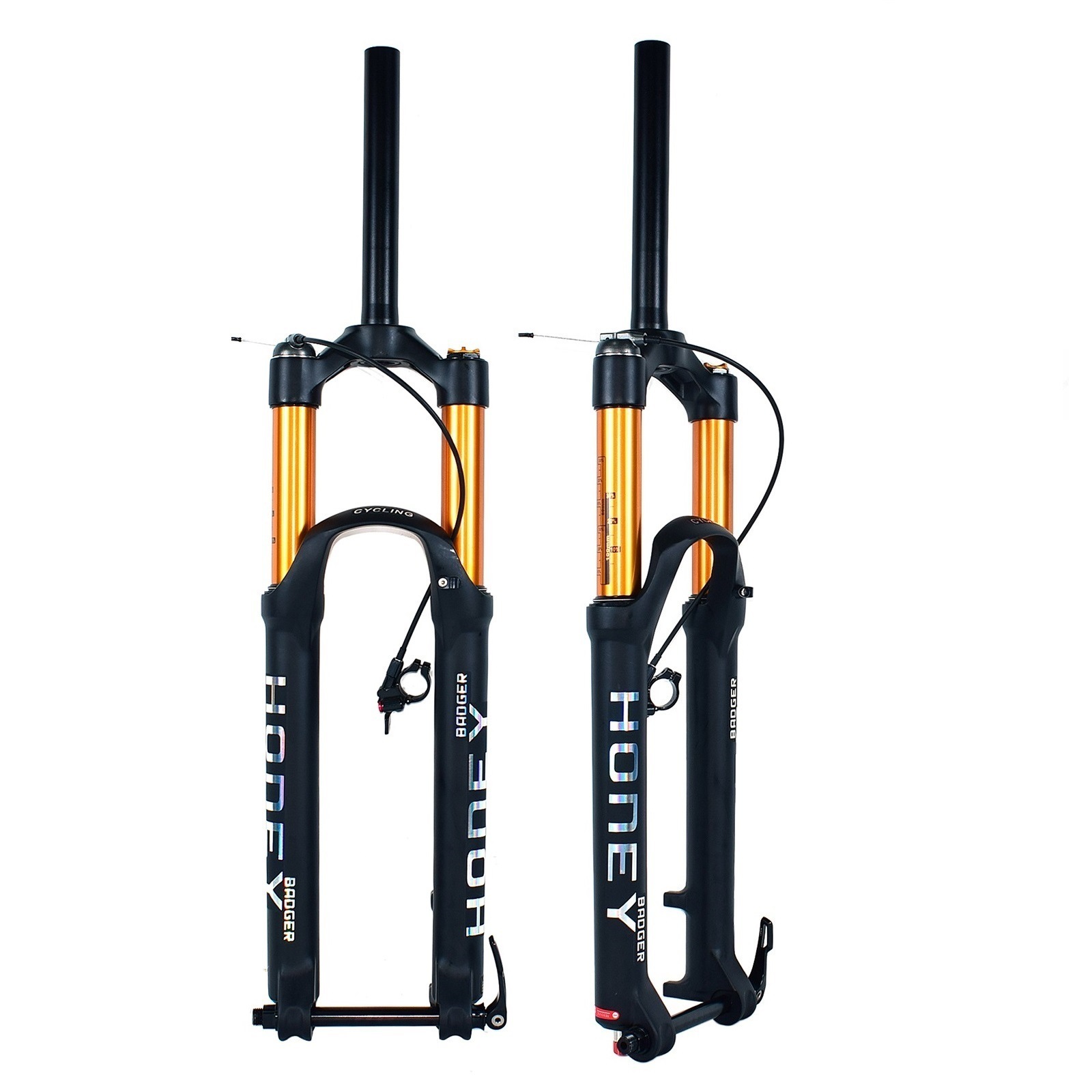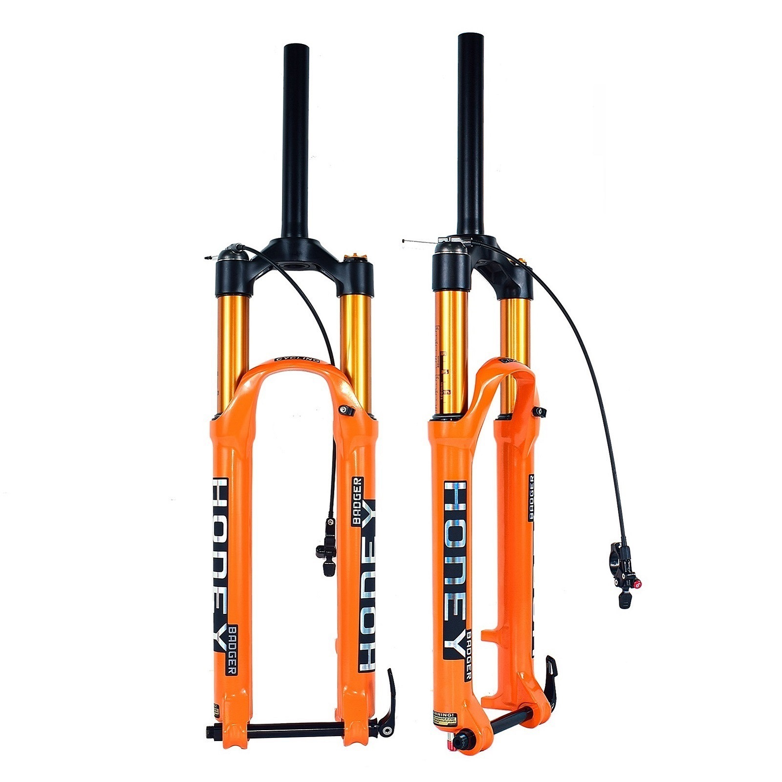 HONEY BADGER空气叉采用了和世界知名品牌相同的空气弹簧系统,开放式的空气泵增加了空气的容量,这使的叉子的弹性得到了加强,支撑力和灵敏度更好,轻微的振动被轻易的吸收,也能适应更加复杂不平的道路,反弹调节的功能让你可以从容应对挑战,只需要轻轻调节反弹开关,你便可以让叉子更好的为您工作!当然你还不能使用这个叉子做极限运动,骑行还需要注意安全!