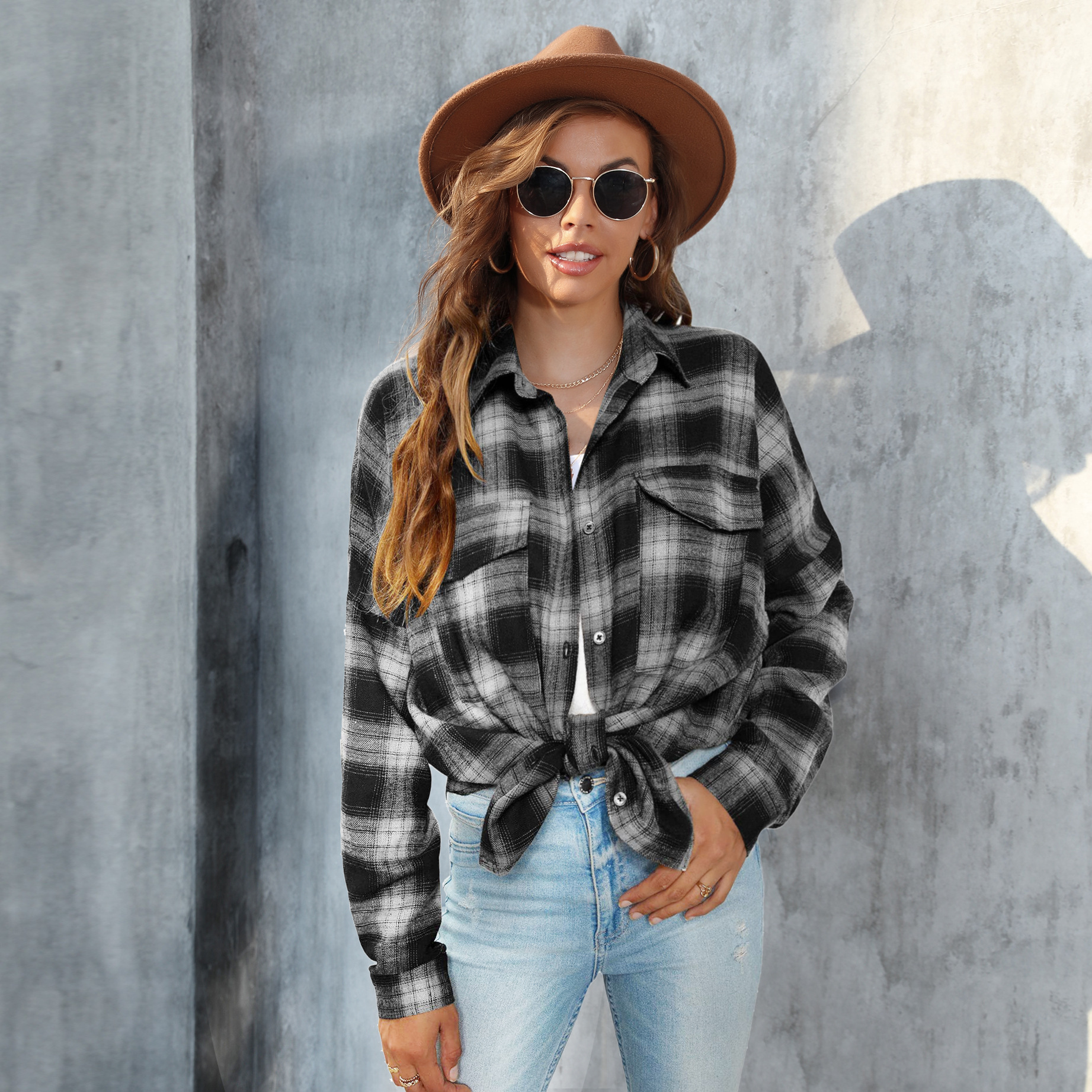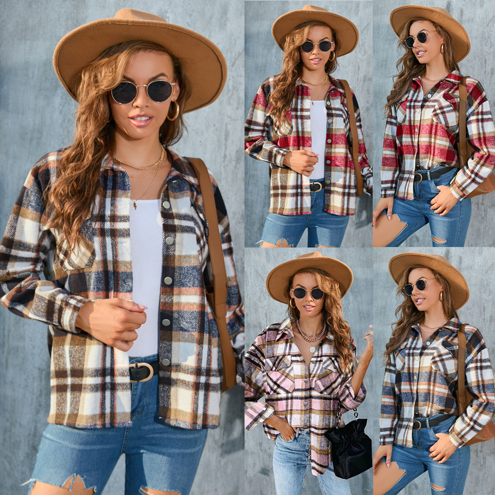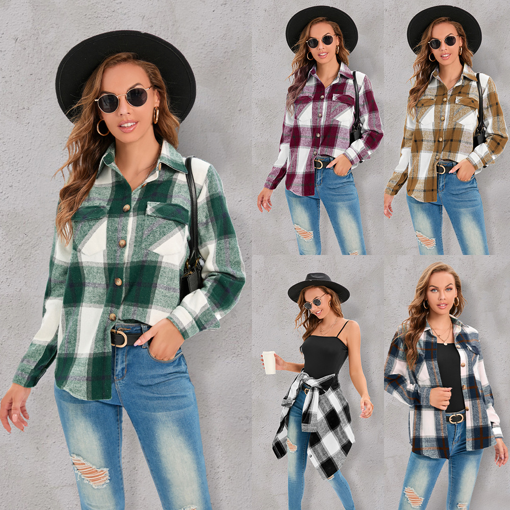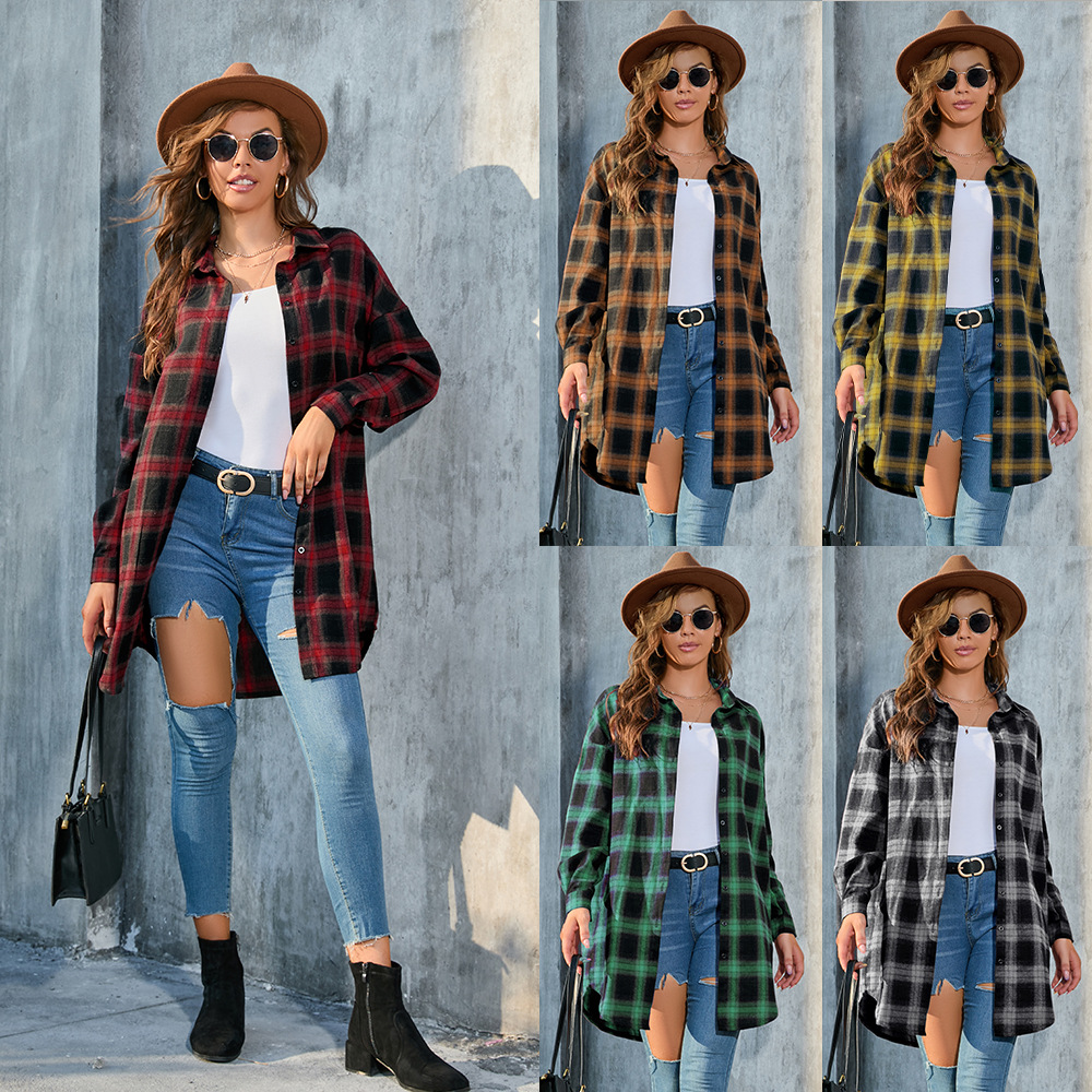 Amazon трансграничная женская новая клетчатая рубашка на пуговицах с длинными рукавами, однотонная и размерная верхняя куртка