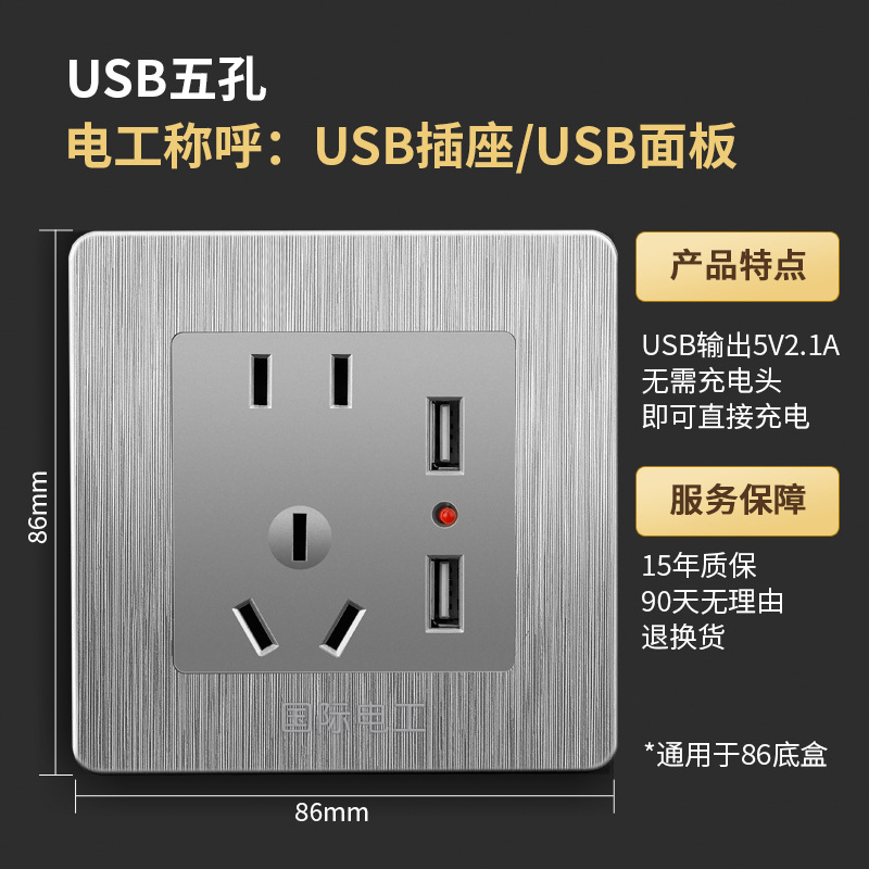 Международная электрическая скрытая настенная выключательная панель, матовая серая, 10А, с двойным управлением, пятигнездная, бытовая, с USB-розеткой