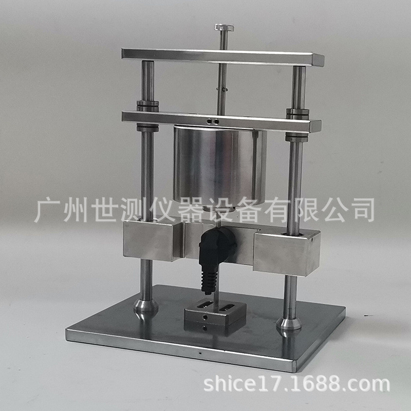 2. 依标准要求:使用图示的装置在35℃±2℃的环境温度下做试验,试验时施加50N力168小时,试验装置的作用点必须位于插头完全插入时旁侧接地插套建立连接的位置。撤去力后30S测量接地插套。接地插套的尺寸的总改变不得与第九条测定的实际值相差1mm以上。