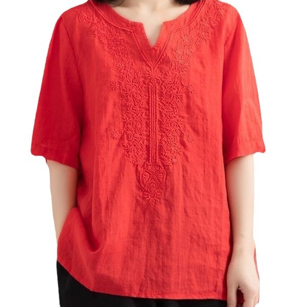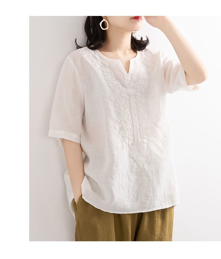 Хлопковая летняя новая рубашка из хлопка и льна с v-образным вырезом, женский литературный свободный пуловер, футболка с короткими рукавами и вышивкой, женский модный топ с вышивкой