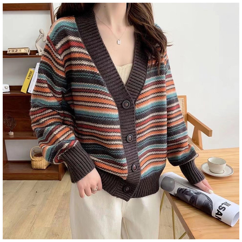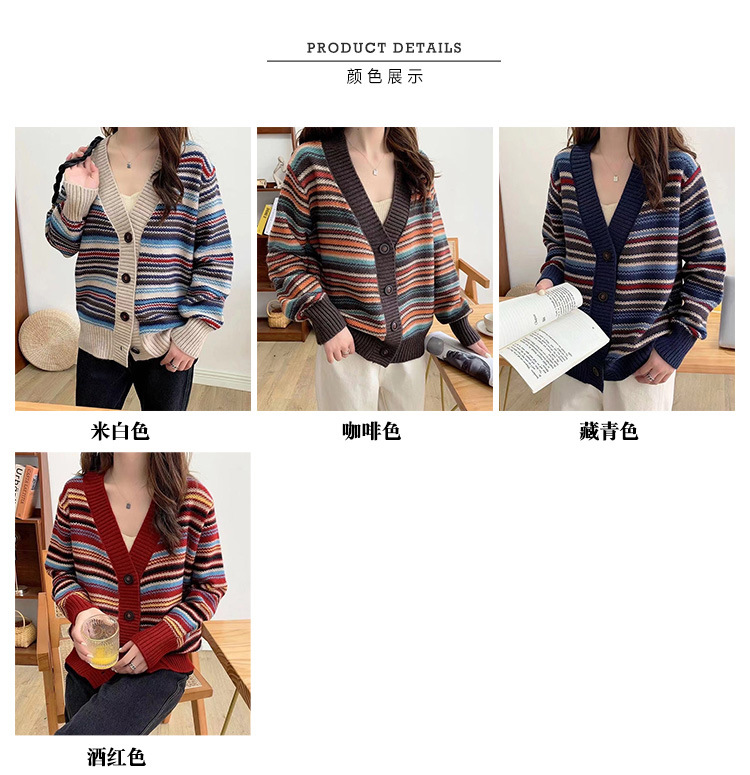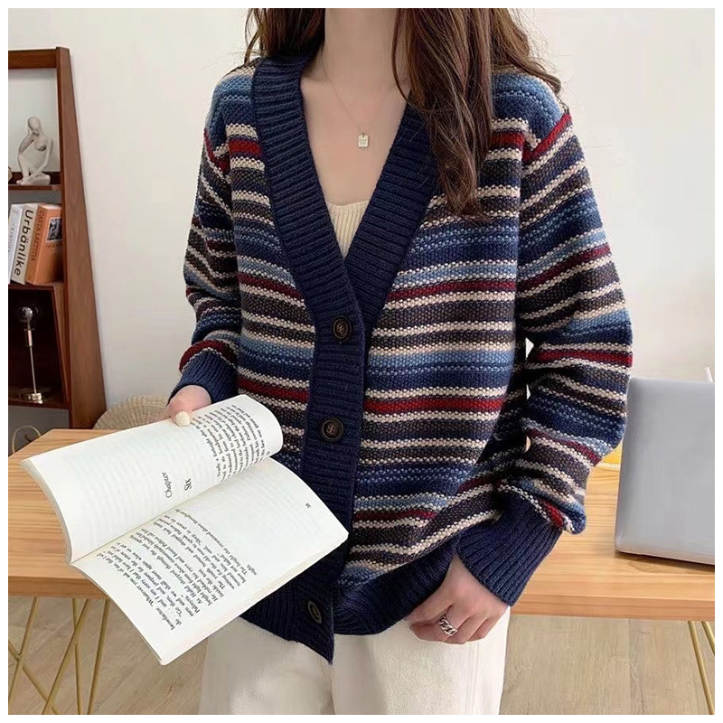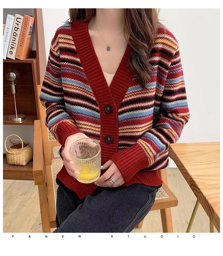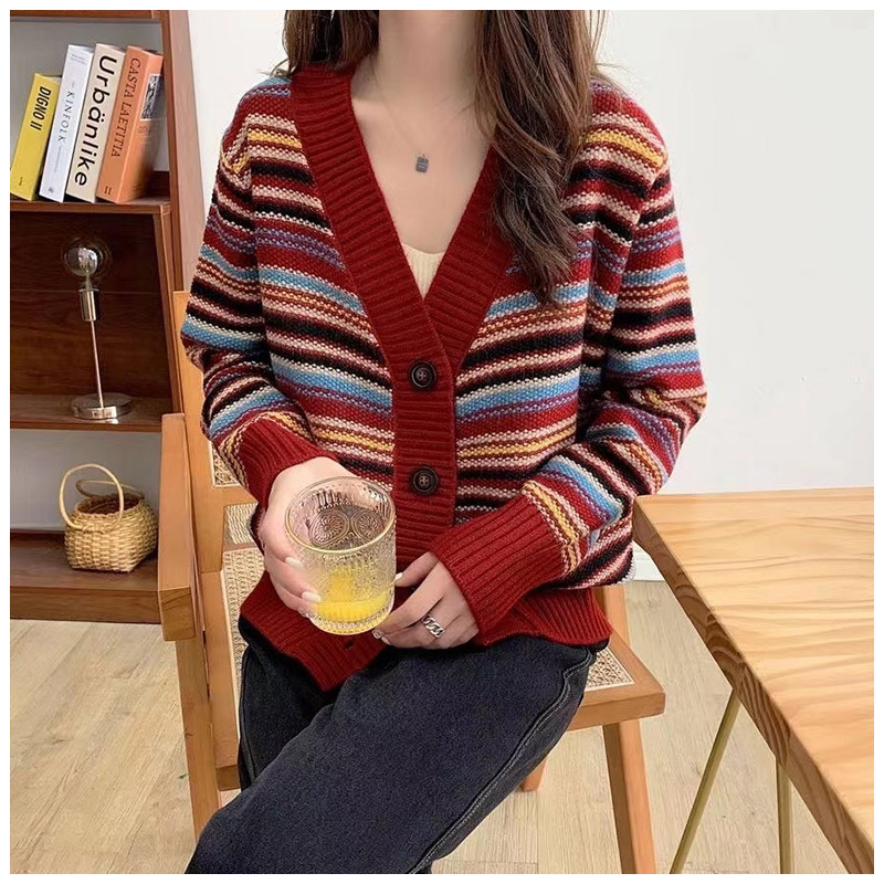 Новинка осени 2022, корейский стиль, универсальный свободный v-образный вырез, красочный полосатый трикотаж, кардиган, трикотаж, куртка, топ для женщин