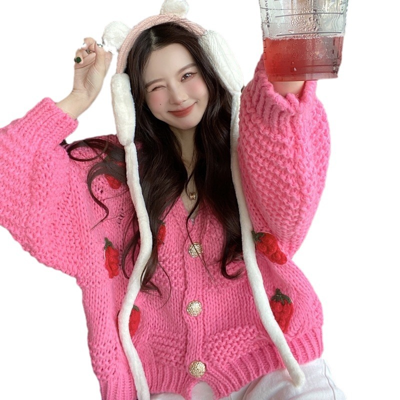 Кардиган 925, верхняя одежда, весенне-осенний свободный и сладкий клубничный свитер, мягкий и восковой женский толстый шерстяной вязаный топ с v-образным вырезом