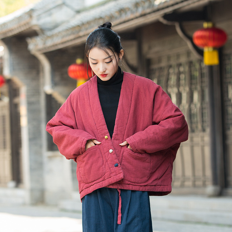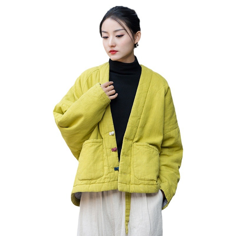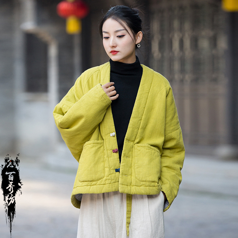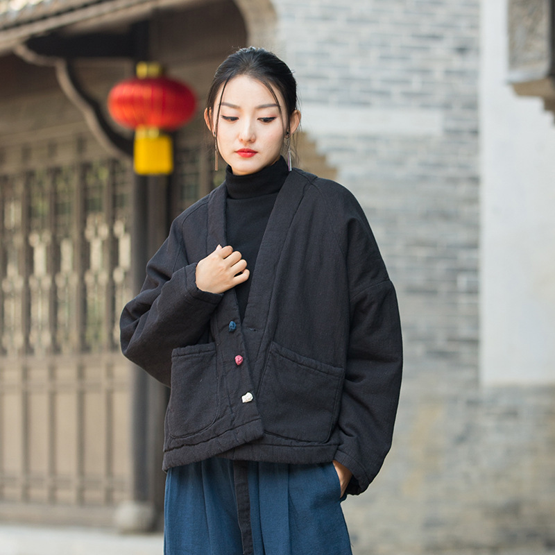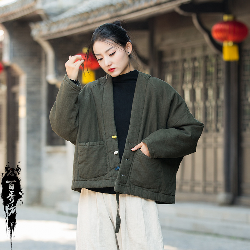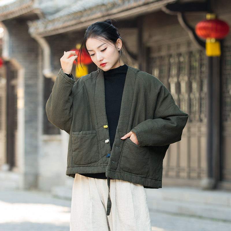 Новая зимняя коллекция 2025: Женская одежда из хлопка и льна, художественный ретро-топ на пуговицах с подкладкой, женское теплое короткое пальто из рами и хлопка