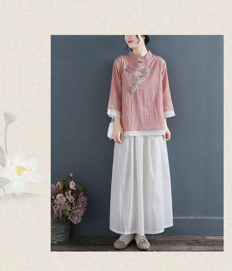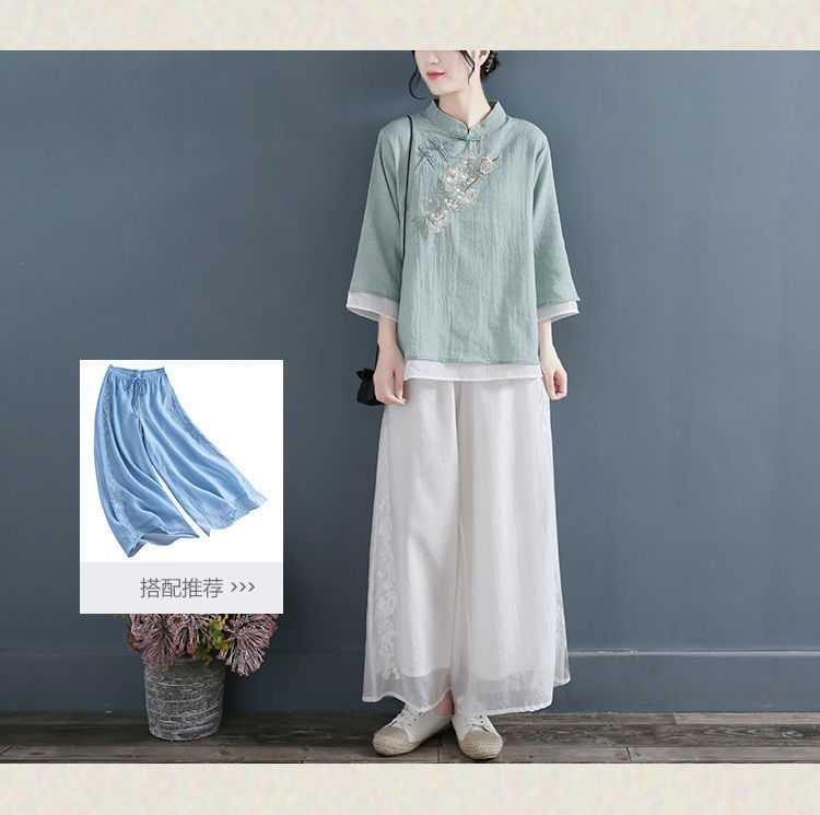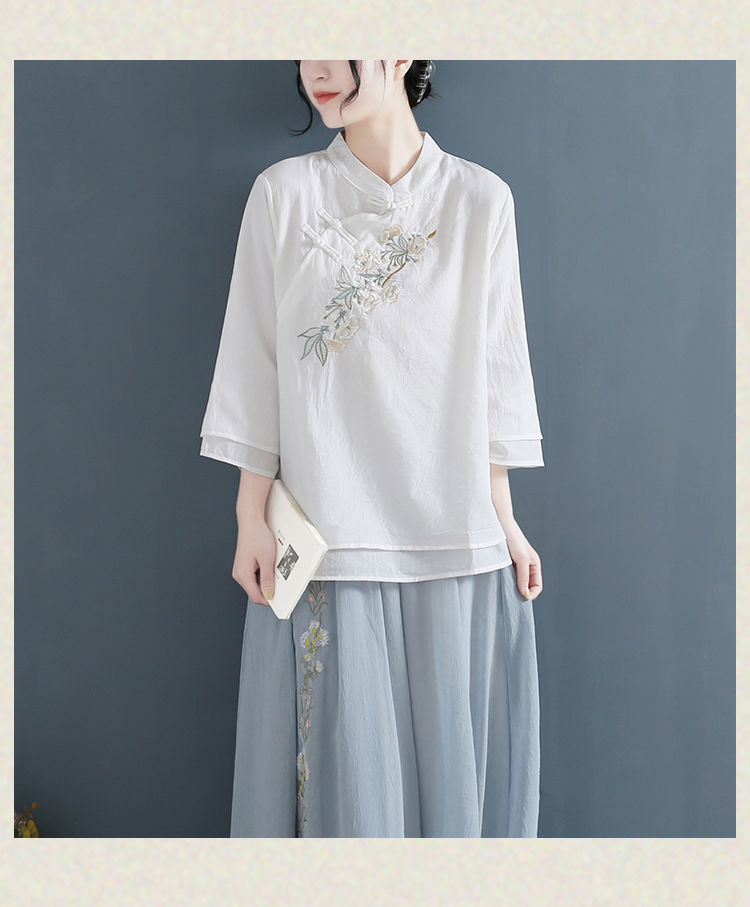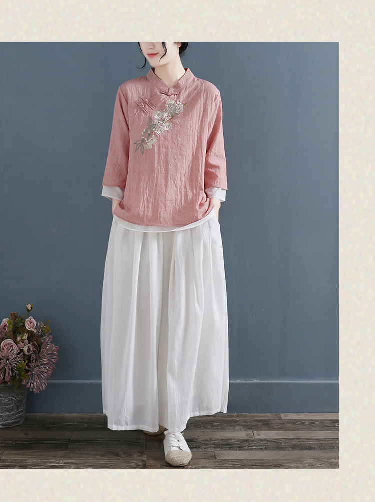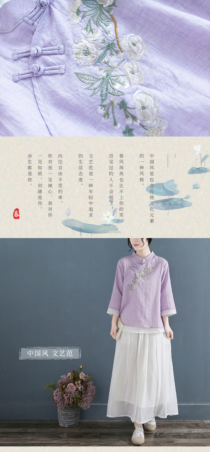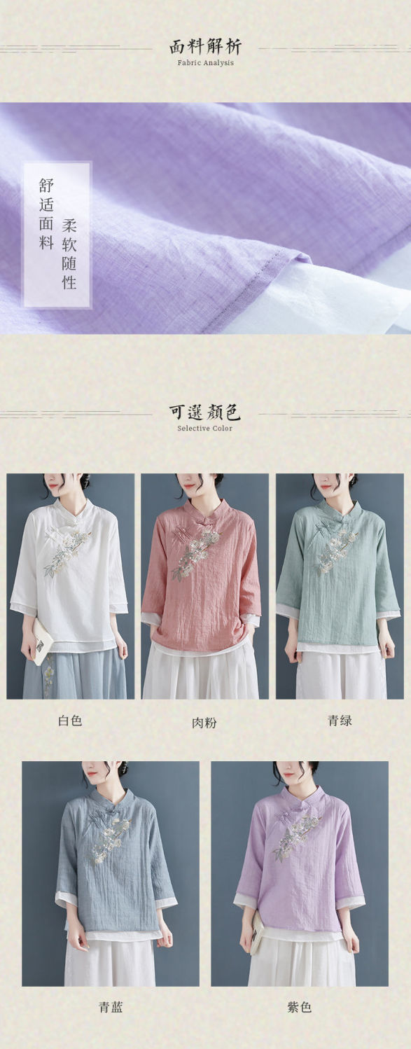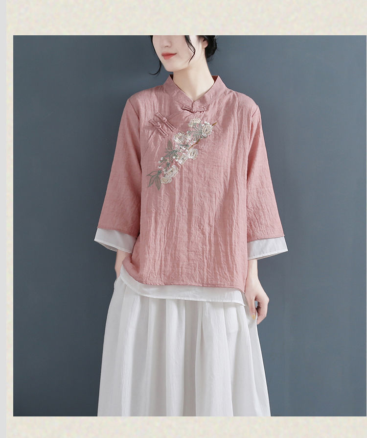 Женская рубашка с вышивкой из хлопка и льна 2024, весна и осень, новый стиль, литературный большой размер, закрывающий живот, повседневный пуловер с рукавами три четверти, футболка с круглым вырезом