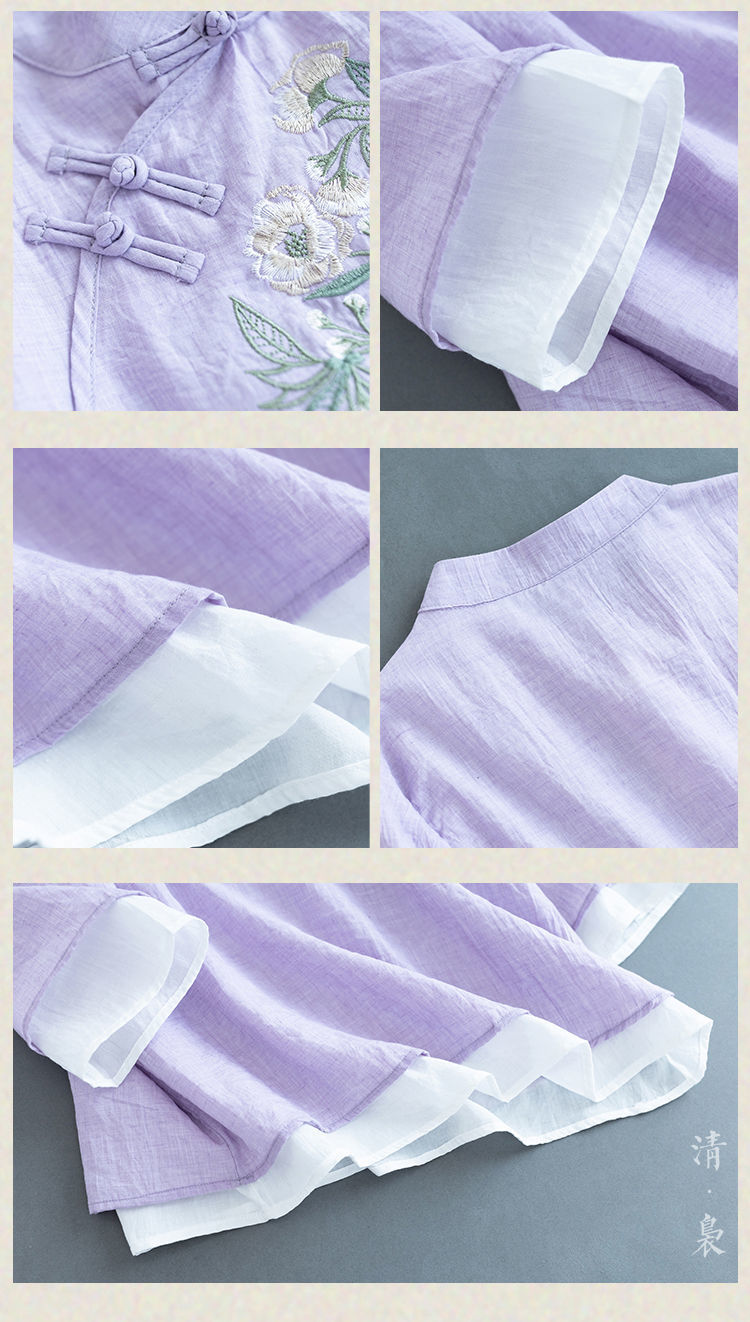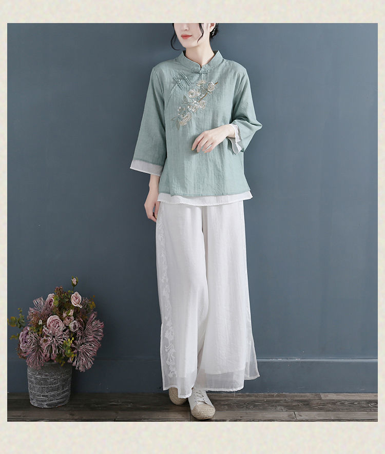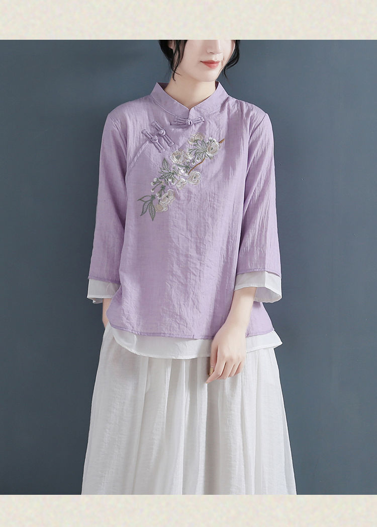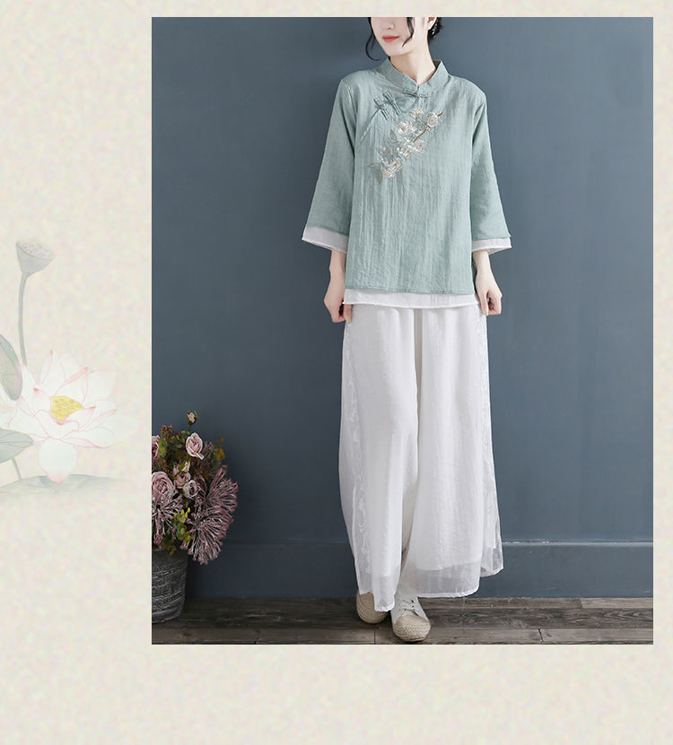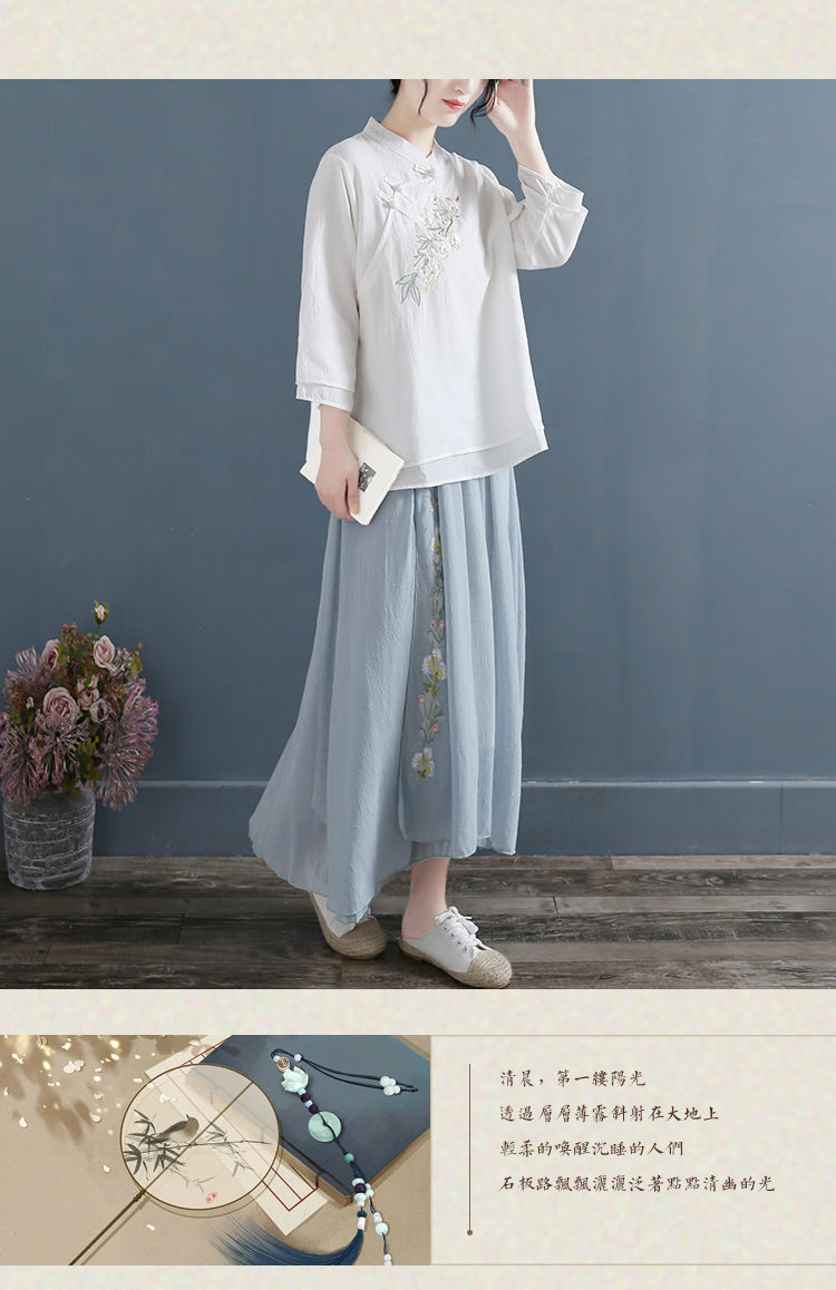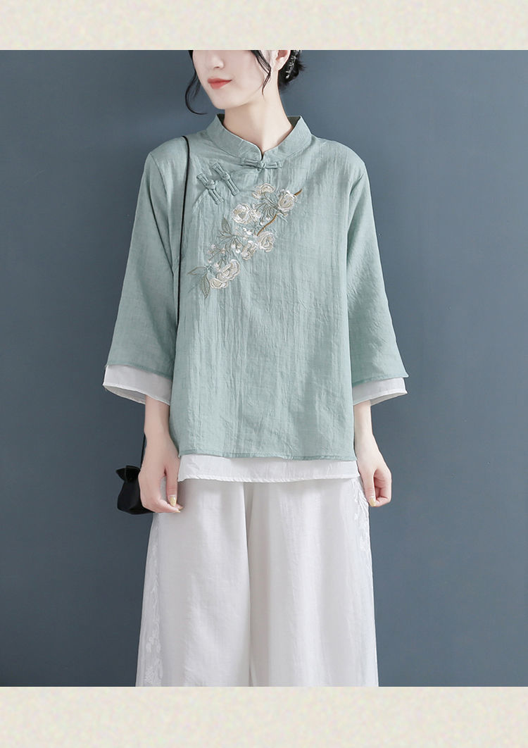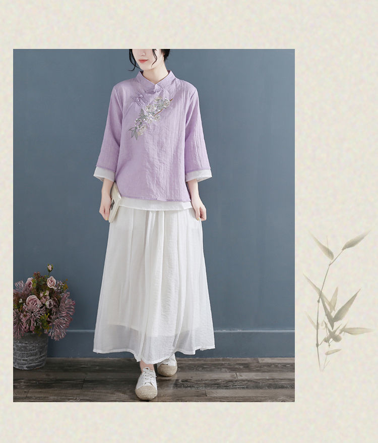 Женская рубашка с вышивкой из хлопка и льна 2024, весна и осень, новый стиль, литературный большой размер, закрывающий живот, повседневный пуловер с рукавами три четверти, футболка с круглым вырезом