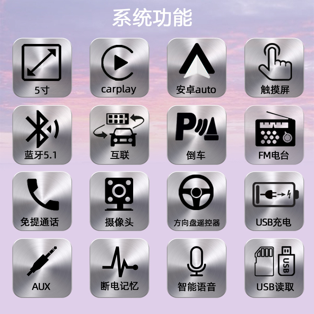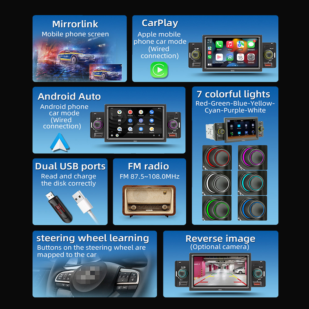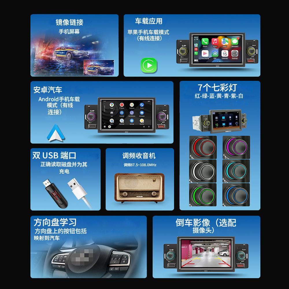 主要功能卖点:支持手机互联、carplay、安卓auto;蓝牙5.1;USB充电;七彩按键灯光、TF卡/U盘