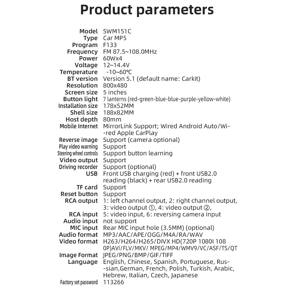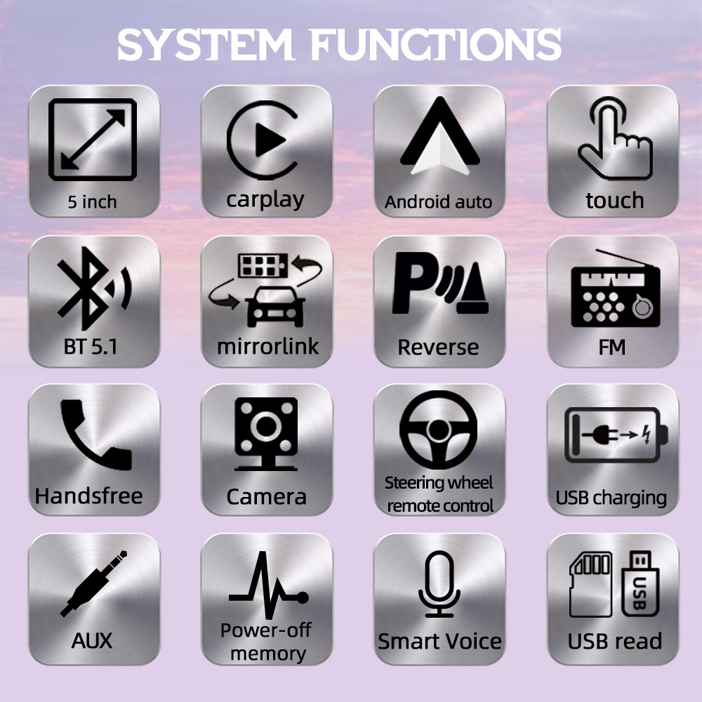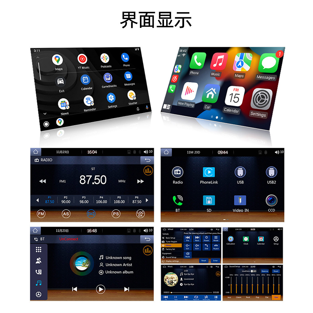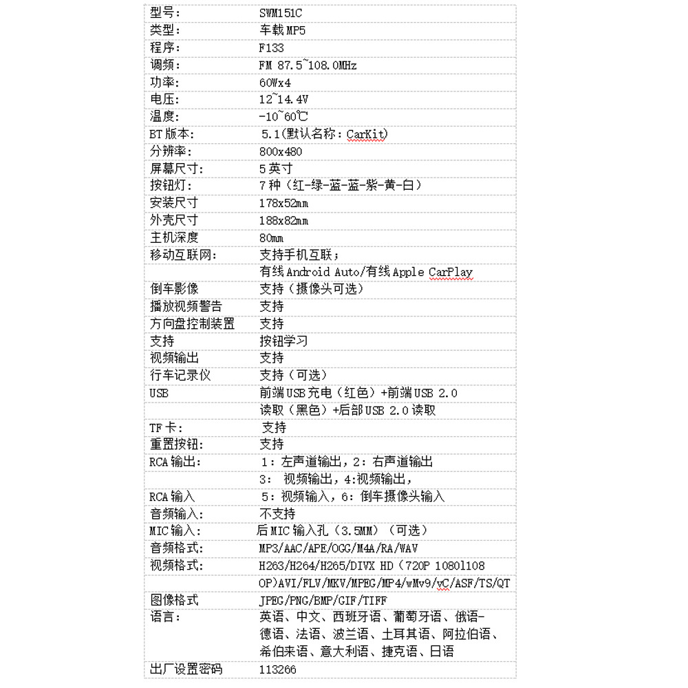 主要功能卖点:支持手机互联、carplay、安卓auto;蓝牙5.1;USB充电;七彩按键灯光、TF卡/U盘