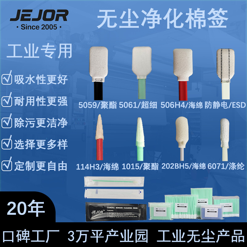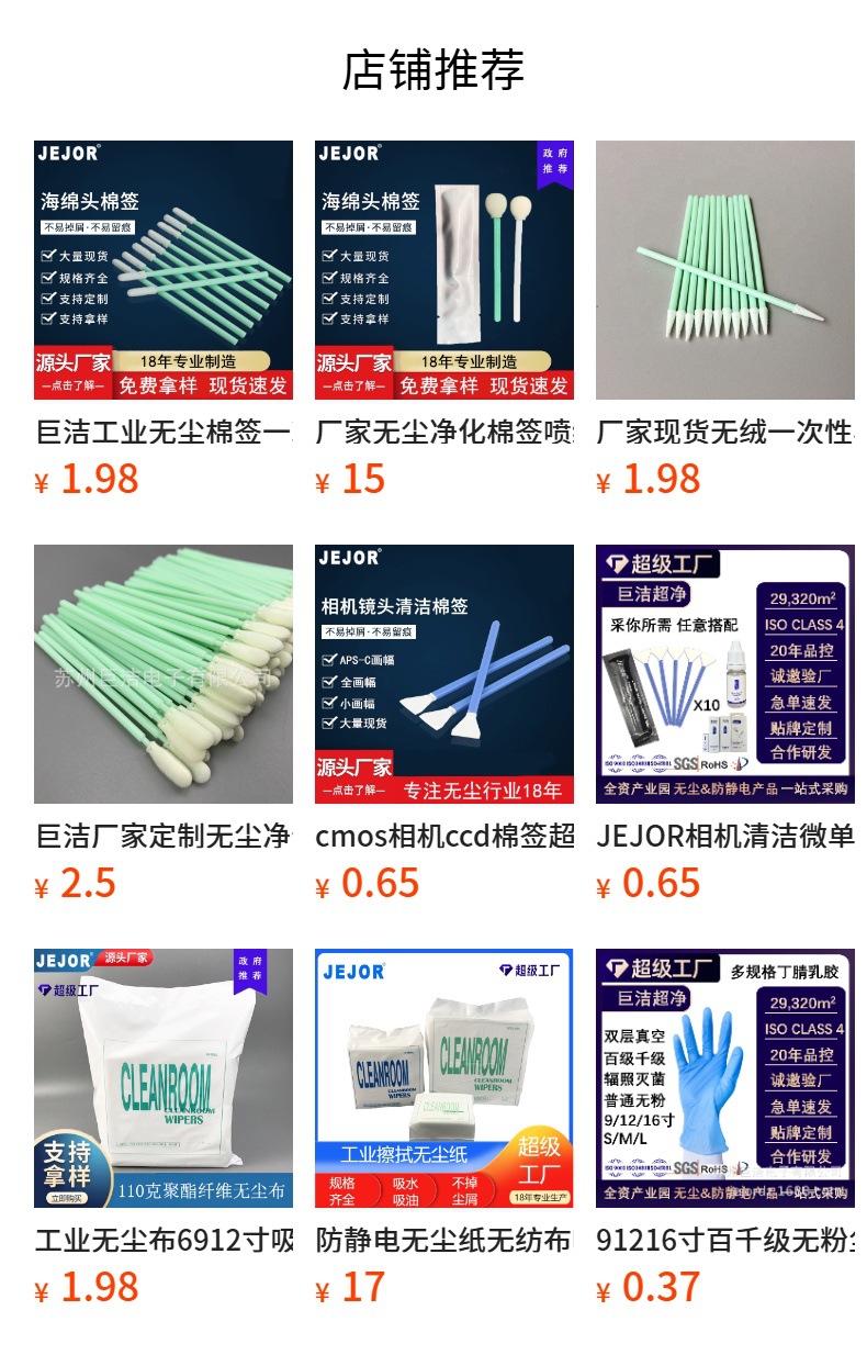 巨洁工业棉签可替换杆部材质细分有15+种,头部材质细分有100+种,但为了保证使用效果(包含但不限于掉屑率,吸液率,可擦拭次数等),所以暂不会提供过低价位的工业棉签现货。如您需要更低价格的棉签,可与小姐姐沟通是否能够定制和拼单。