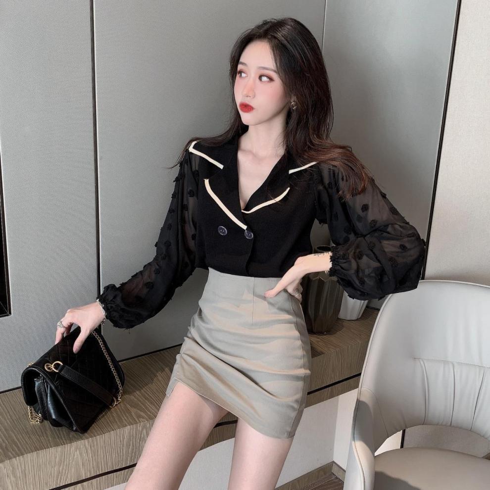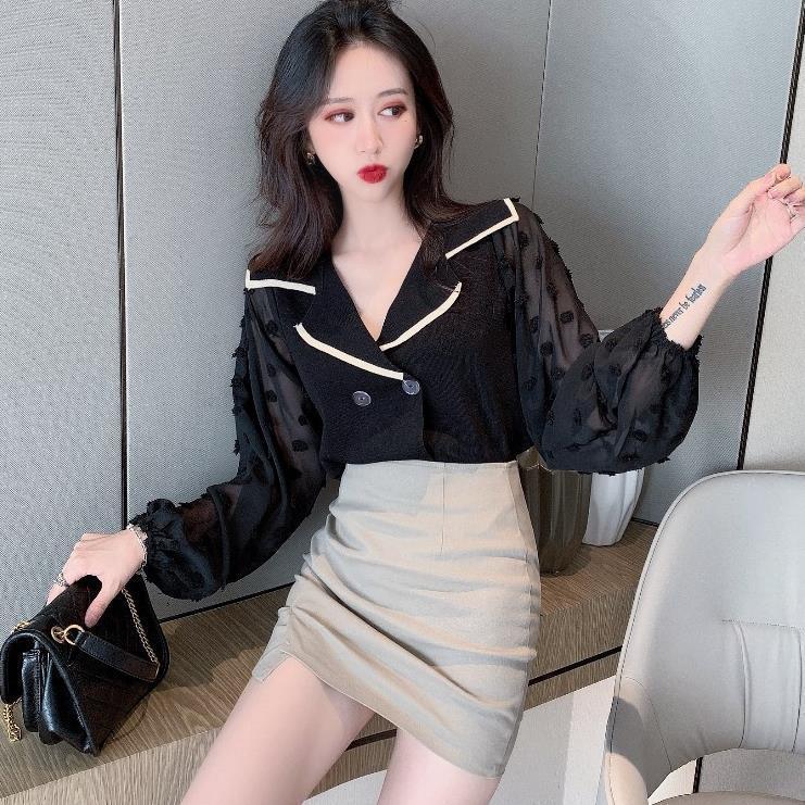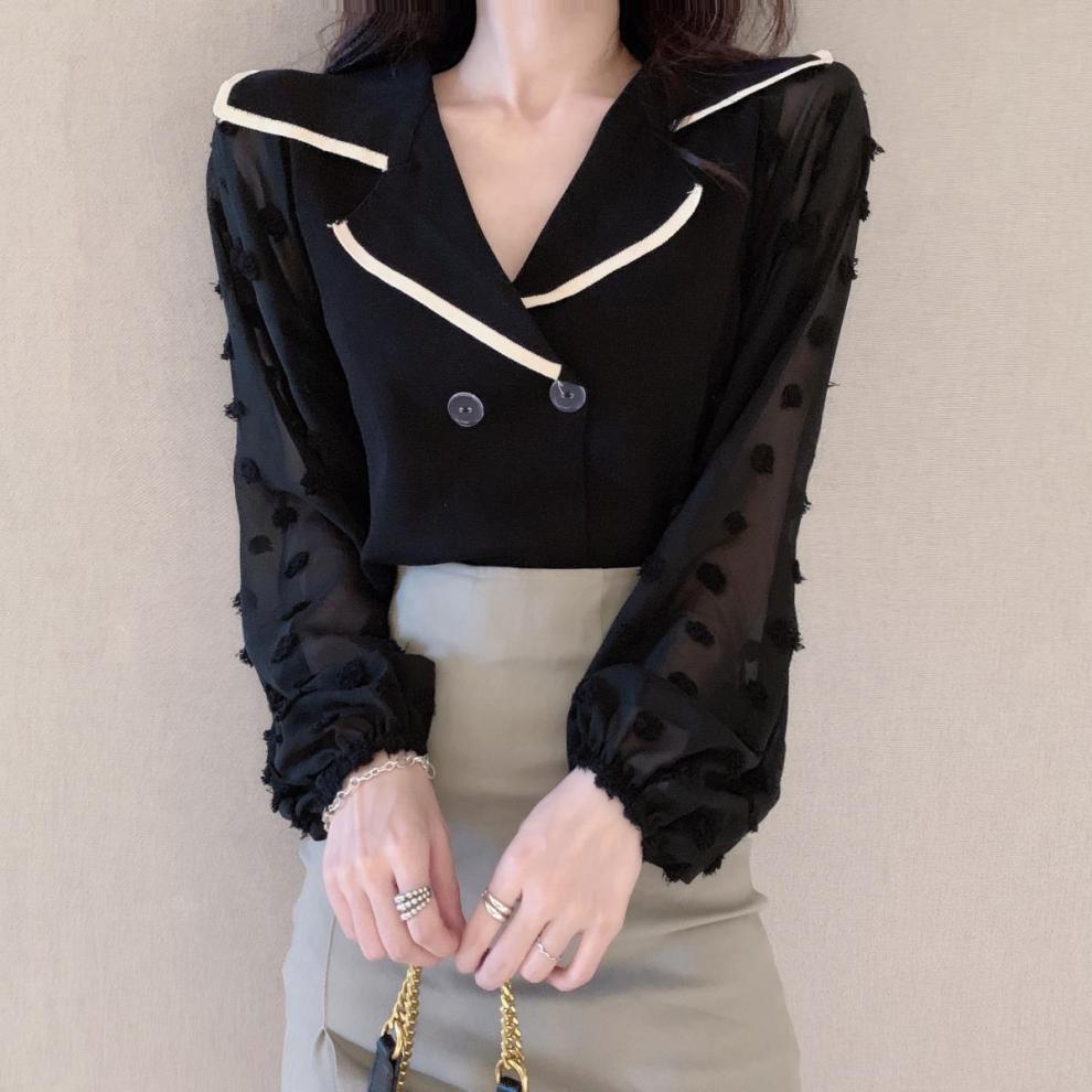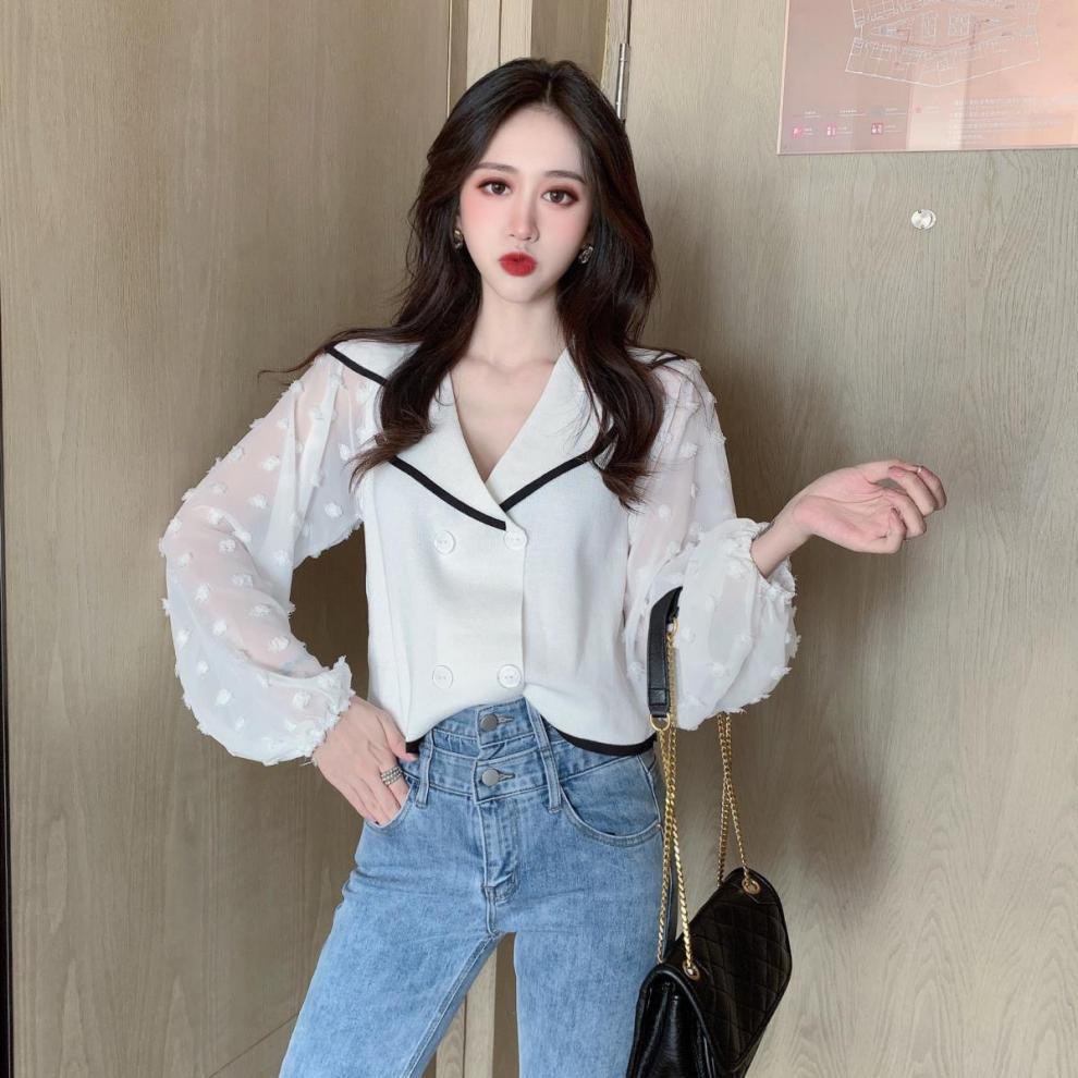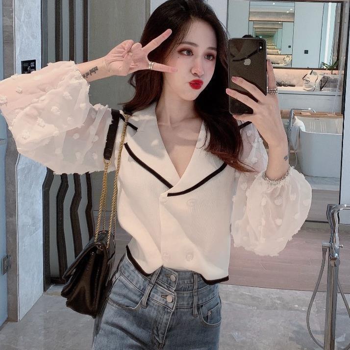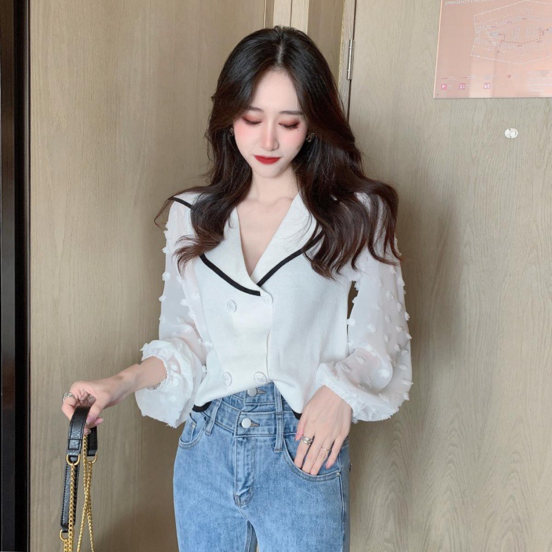 Шифоновый вязаный топ в стиле пэчворк с пышными рукавами
