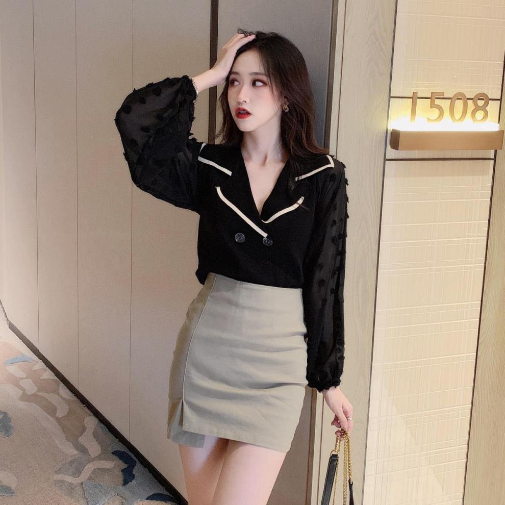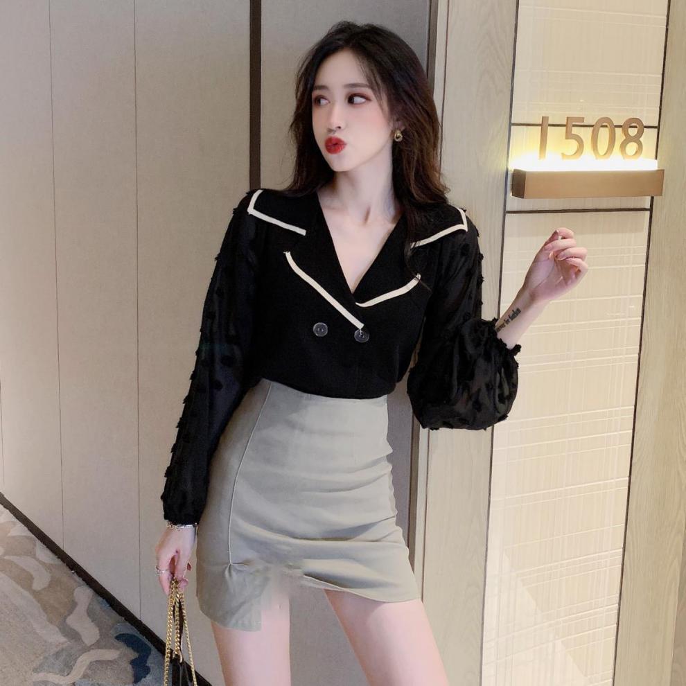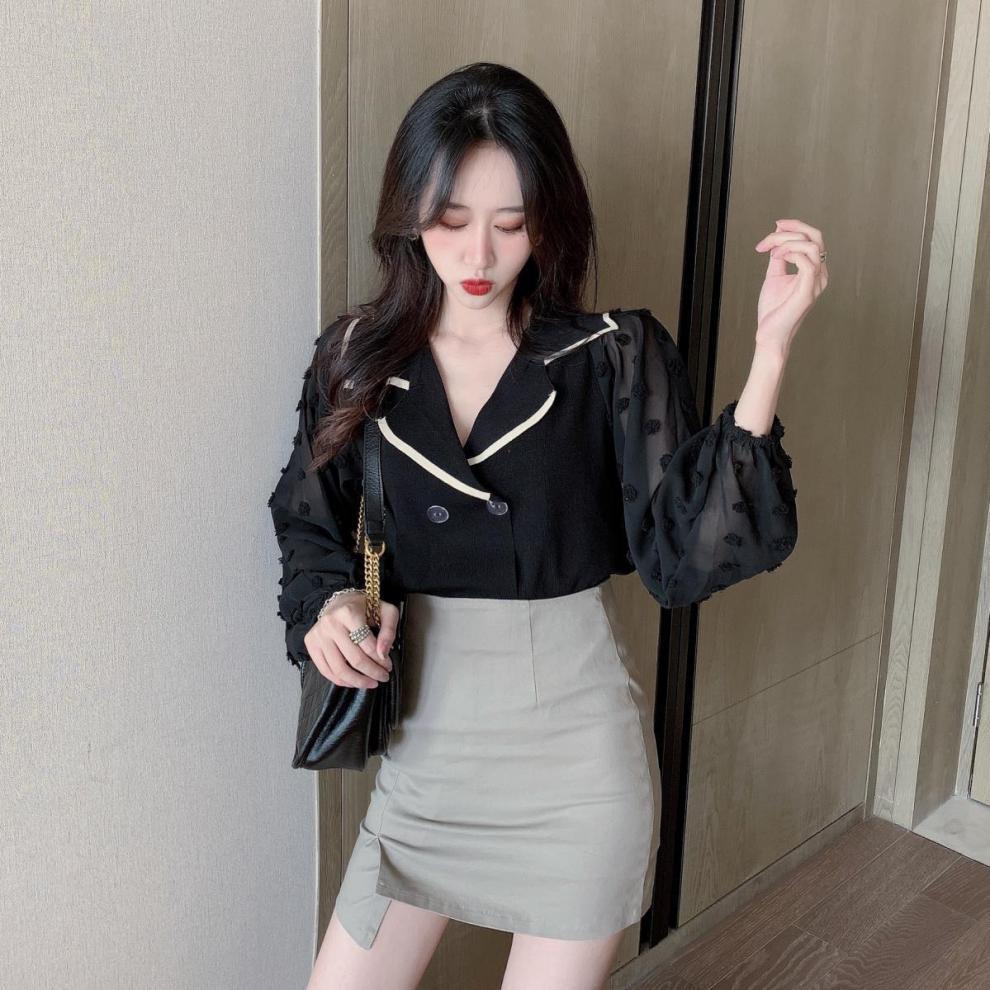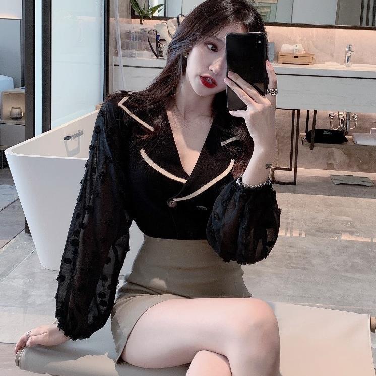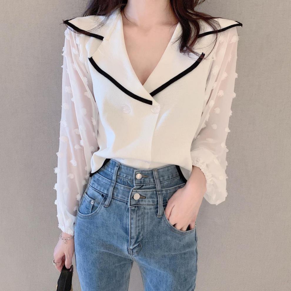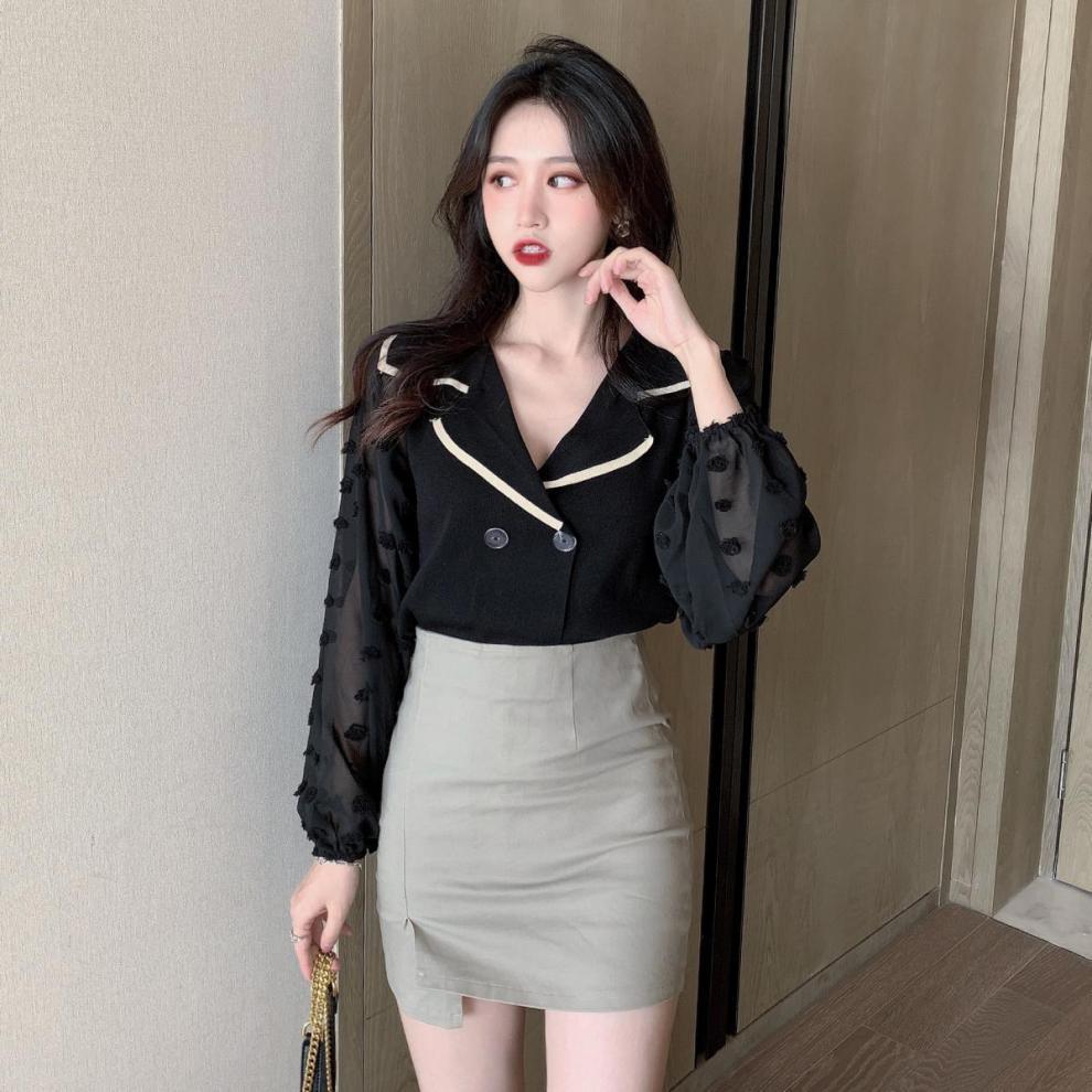 Шифоновый вязаный топ в стиле пэчворк с пышными рукавами