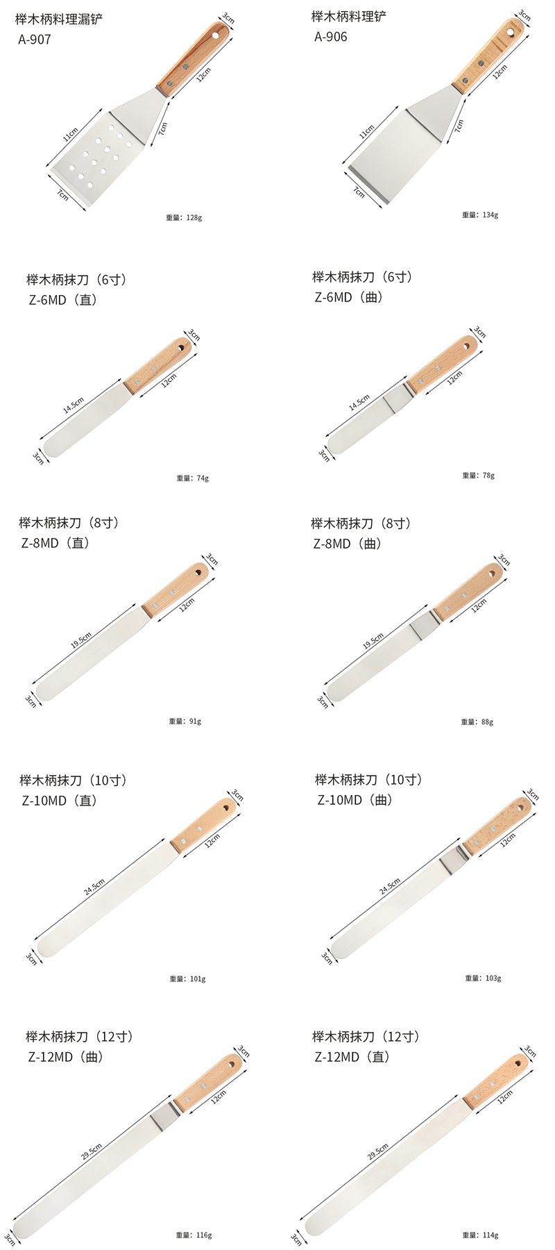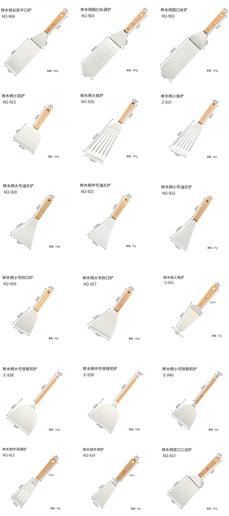 Лопата трехсторонняя с широким лезвием и рукояткой из бука, модель M2-913; Лопатка для готовки с ручкой из бука A-906; Лопатка для готовки с деревянной ручкой из бука A-907; Лопатка для стейка с ручкой из бука M2-910; Лопатка для стейка с ручкой из бука M2-911; Треугольная лопата с ручкой из бука.; Лопатка для жарки с бука, железная пластина, большой размер, модель E-938; Железная лопатка для жарки с ручкой из бука, средний размер, модель E-939; Лопатка для жарки с бука, железная пластина, маленький размер, модель E-940; Маленький широкий лопатка с ручкой из бука M2-915; Лопата скошенная с ручкой из бука, большой размер M2-917; Лопата скошенная с рукояткой из бука, малый размер M2-919; Шпатель с буковой ручкой, большой размер M2-920; Шпатель с деревянной ручкой из бука, средний размер M2-921; Шпатель с ручкой из бука, небольшой размер M2-922; Лопата для рыбы с ручкой из бука, большой размер M7-935; Лопатка для рыбы с ручкой из бука, маленький размер, модель Z-937; Ручка из бука, круглая лопата с длинным лезвием, модель M2-902; Ручка из бука, круглая горловина, длинная протекающая лопата M2-903; Ручка из бука, длинная плоская лопата M2-904; Вилка для гриля с ручкой из бука Z-942; Шпатель с ручкой из бука (6inch) прямой; Шпатель с ручкой из бука (6inch); Шпатель с ручкой из бука (8inch) прямой; Шпатель с ручкой из бука (8inch); Шпатель с ручкой из бука (10inch) прямой; Шпатель с ручкой из бука (10inch); Шпатель с ручкой из бука (12inch) прямой; Шпатель с ручкой из бука (12inch); Дубовая ручка квадратной огранки; Ручка из дуба полукруглой огранки; Дубовая ручка волнистого среза; Зажим для еды с ручкой из бука - 12inch большой; Зажим для еды с ручкой из бука - 9inch маленький