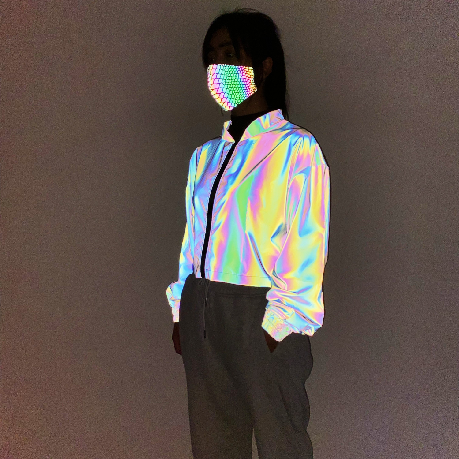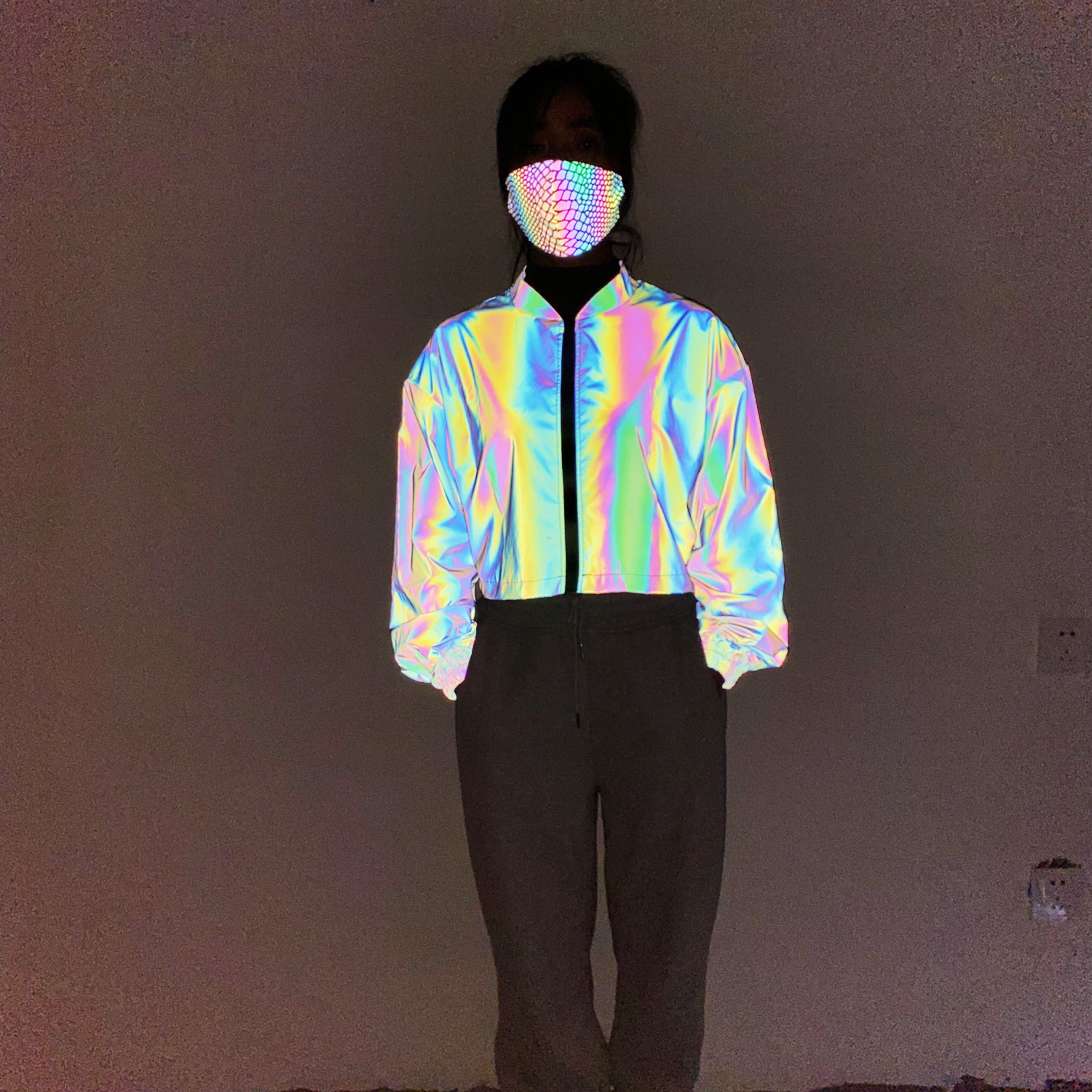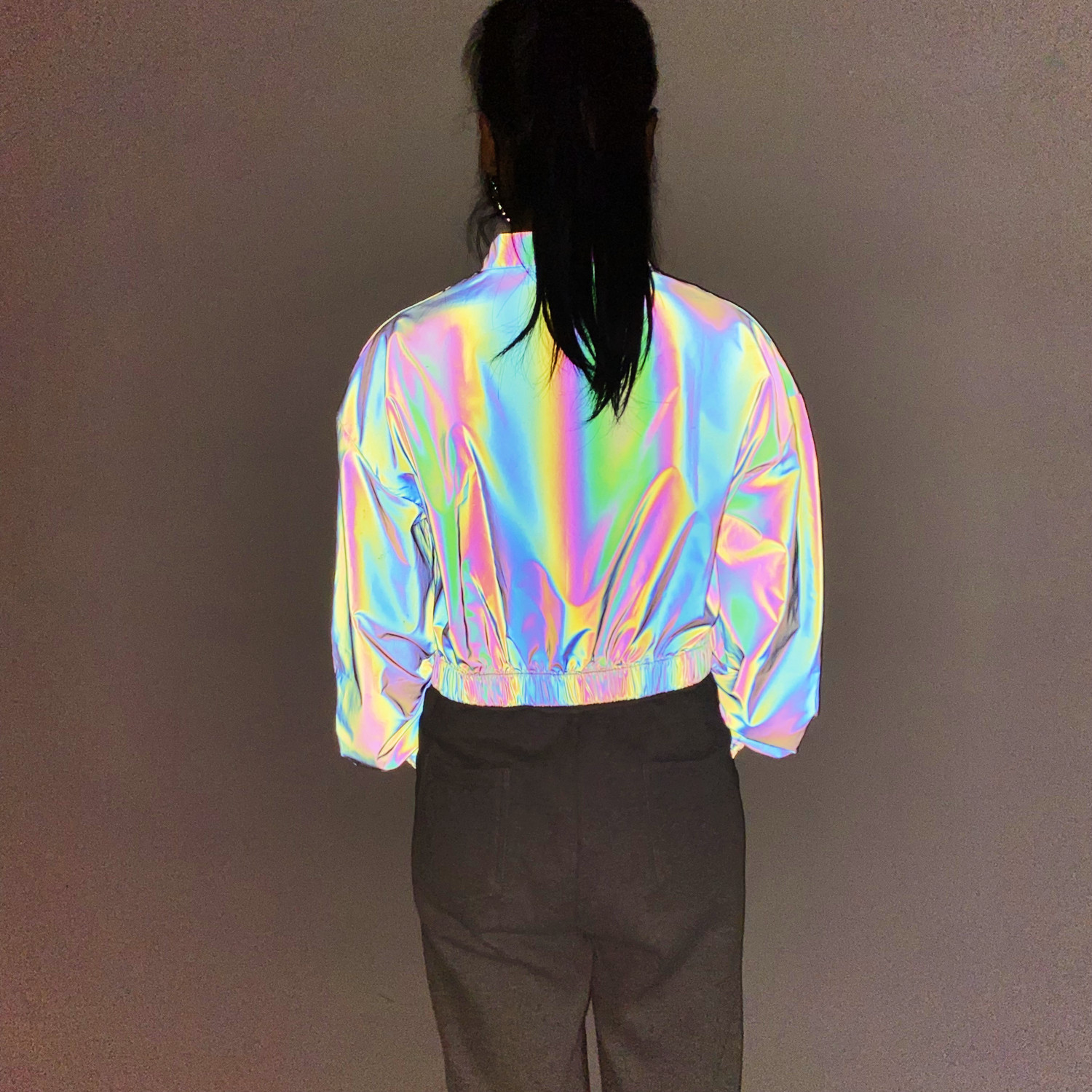 Весна и осень 2024, европейская и американская мода, короткая красочная светоотражающая куртка, женская Ins, свободная короткая куртка с воротником-стойкой, женская одежда больших размеров