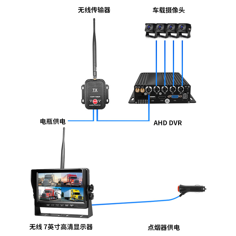 7-дюймовый беспроводной + приемник + 1 камера; 7-дюймовый беспроводной + приемник + видеорегистратор + 4 камеры