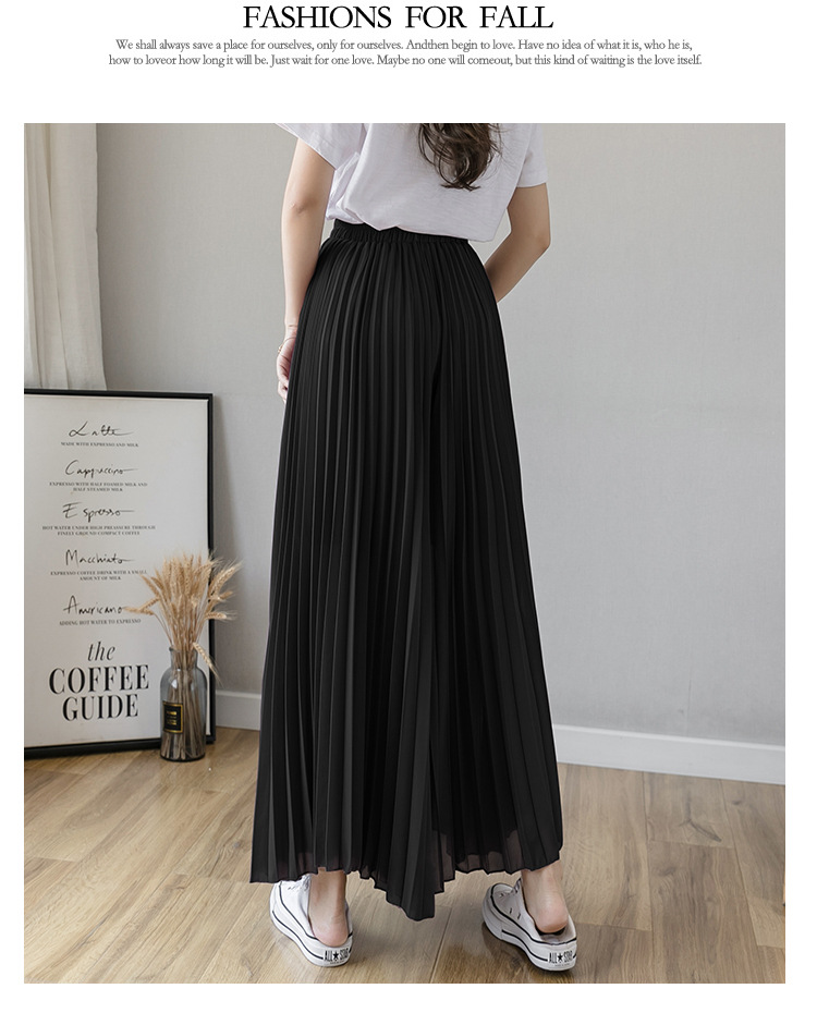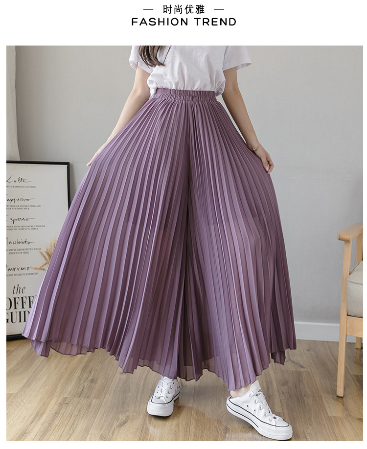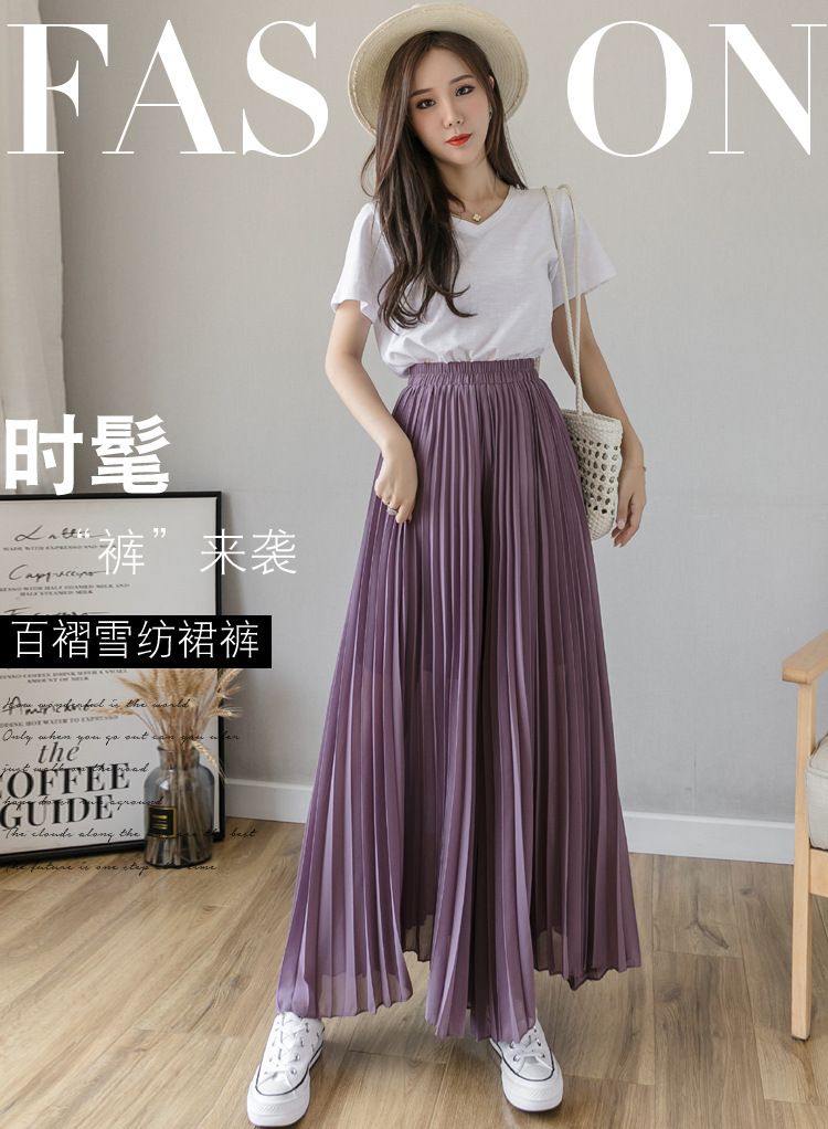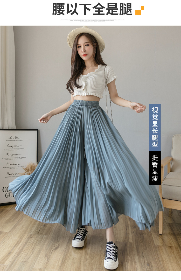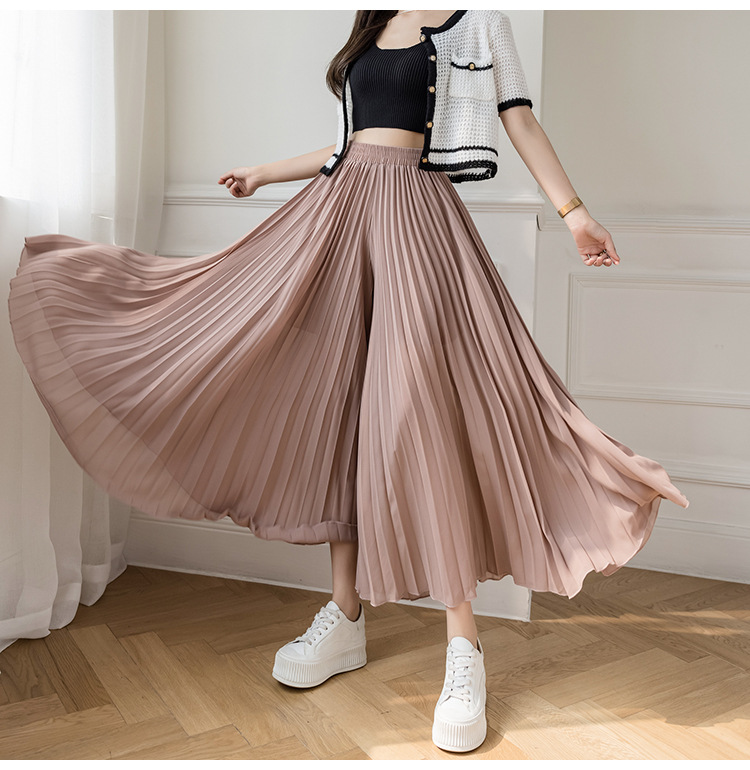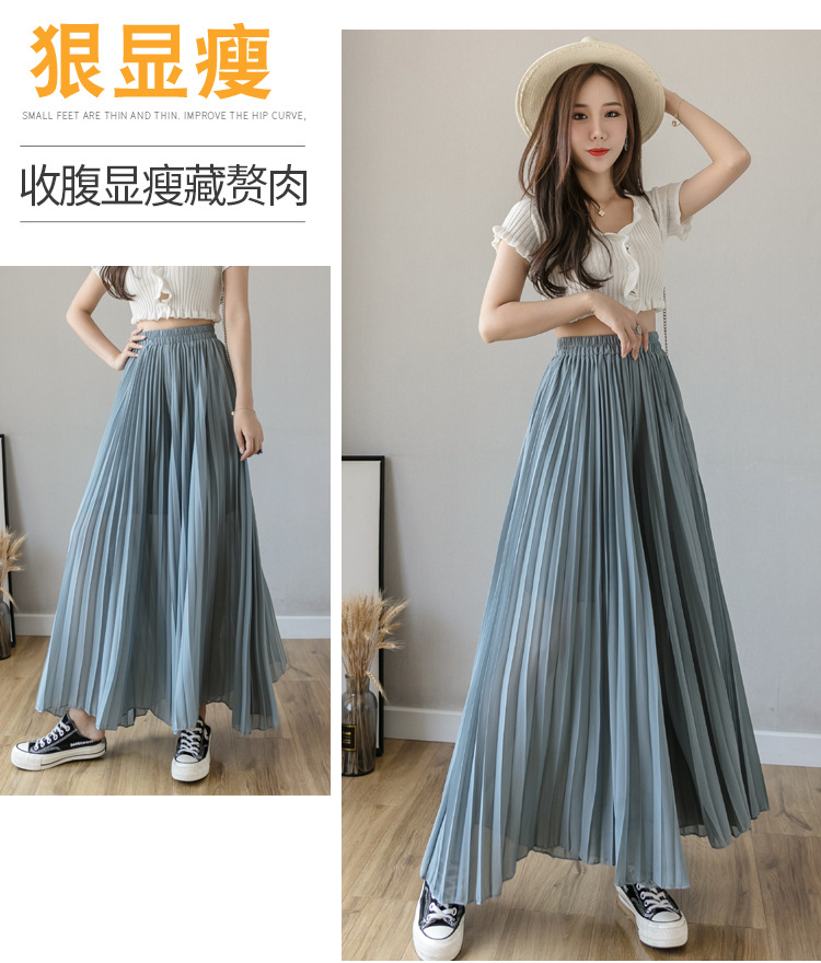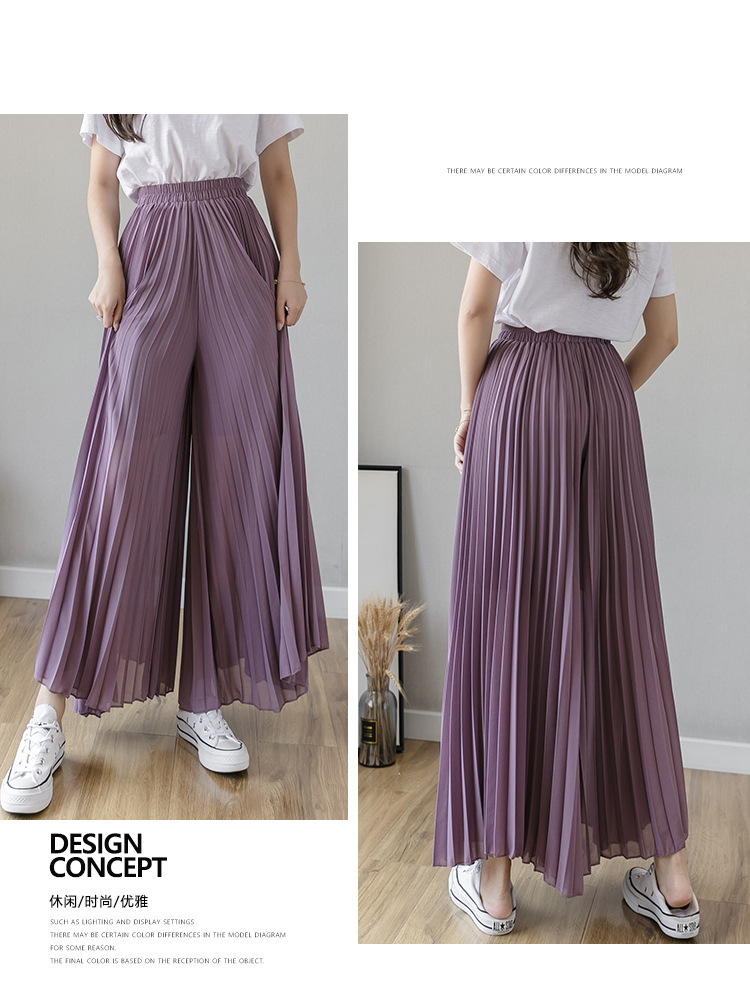Настоящий снимок летних свободных плиссированных шифоновых широких брюк для женщин, брюк с девятью точками, прямых брюк с юбкой с высокой талией