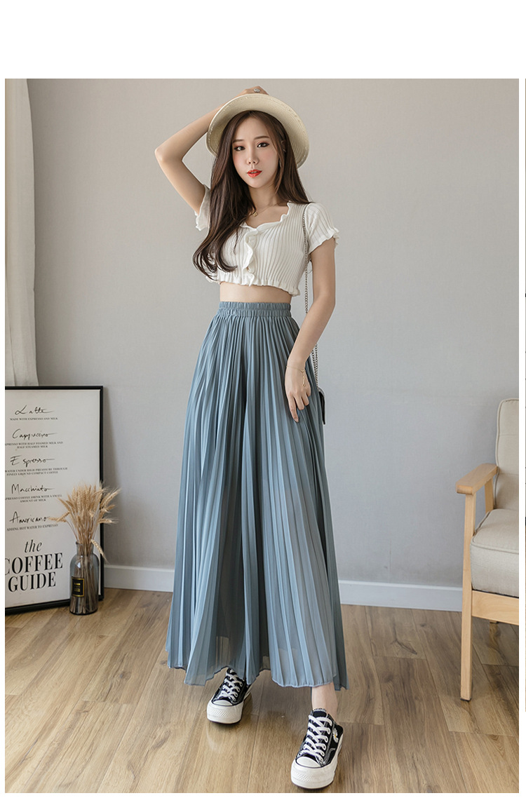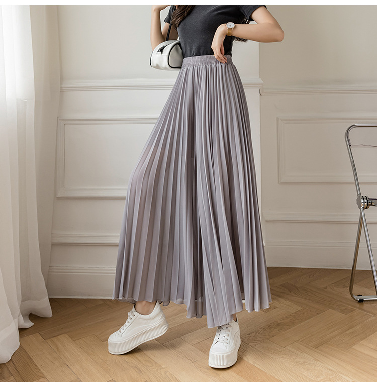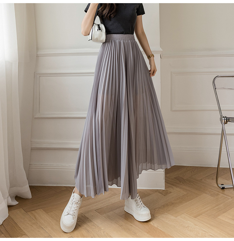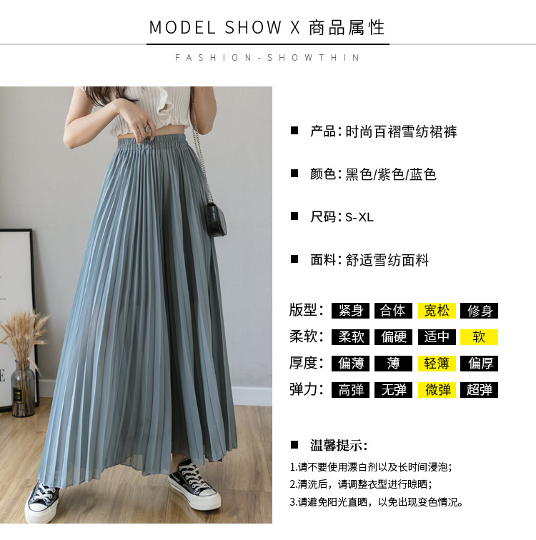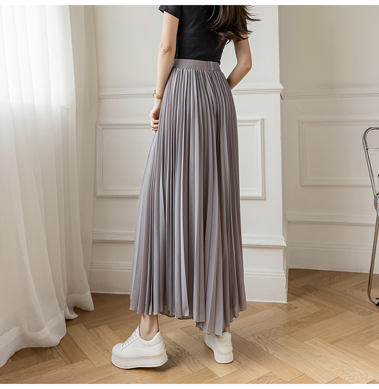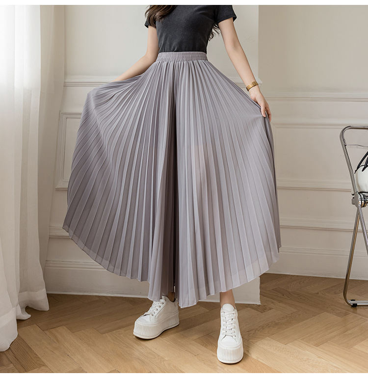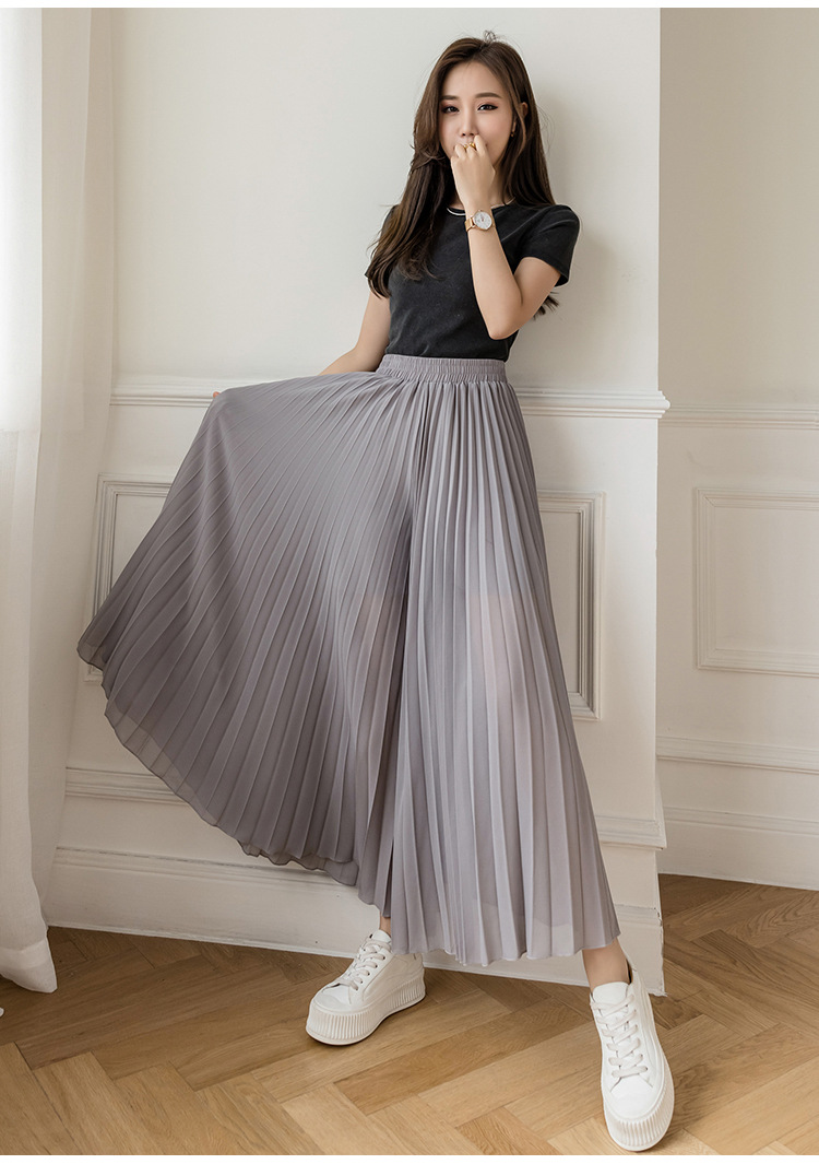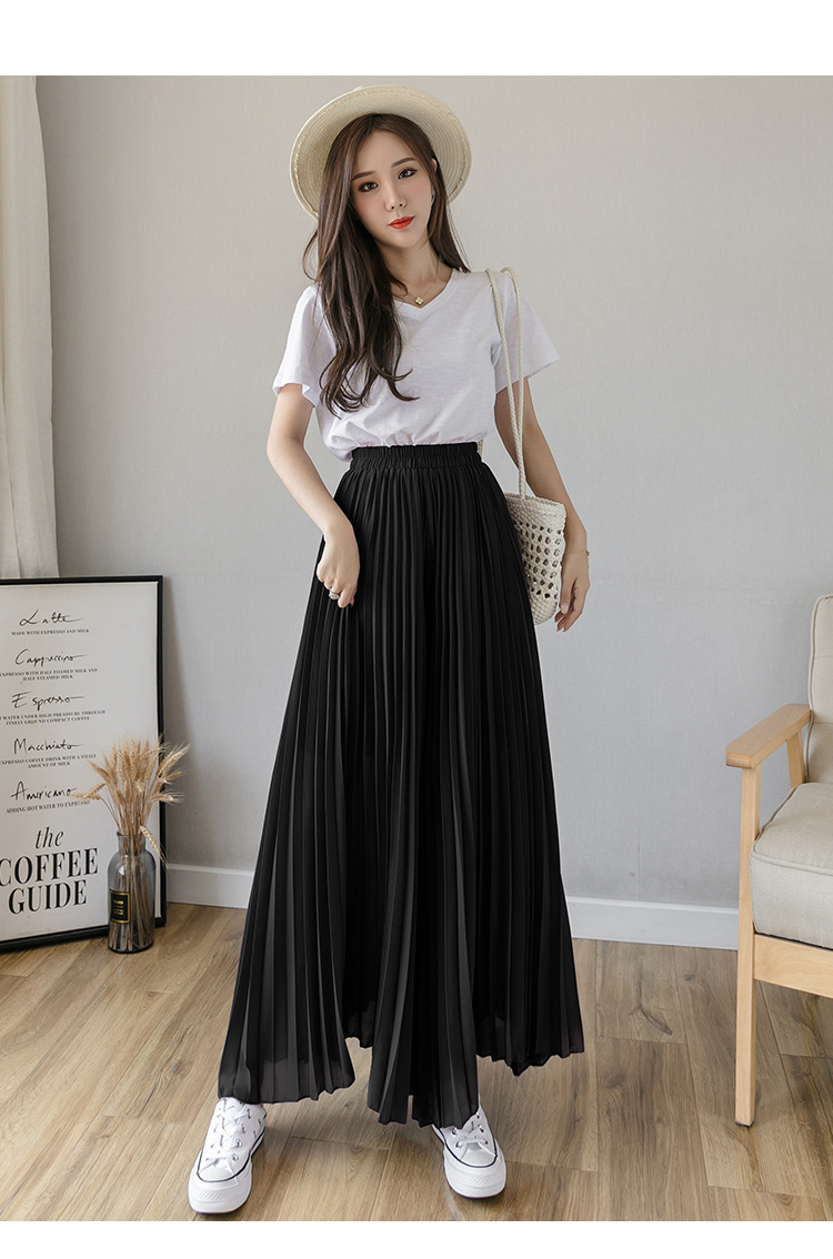 Настоящий снимок летних свободных плиссированных шифоновых широких брюк для женщин, брюк с девятью точками, прямых брюк с юбкой с высокой талией