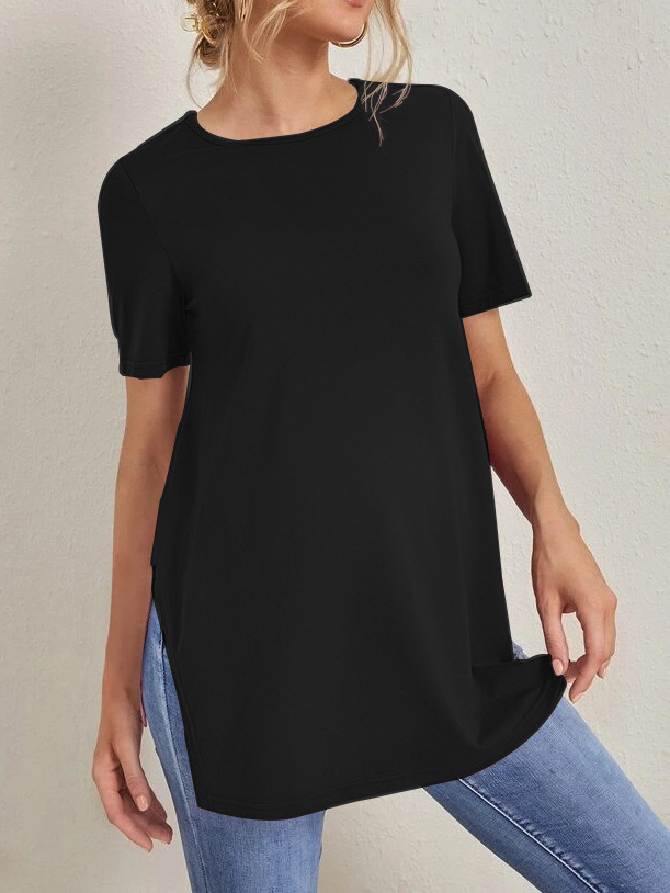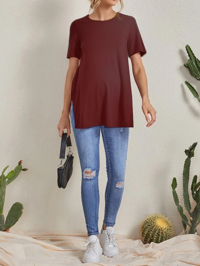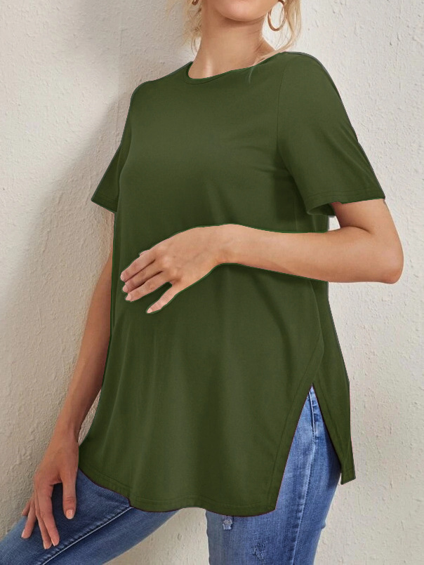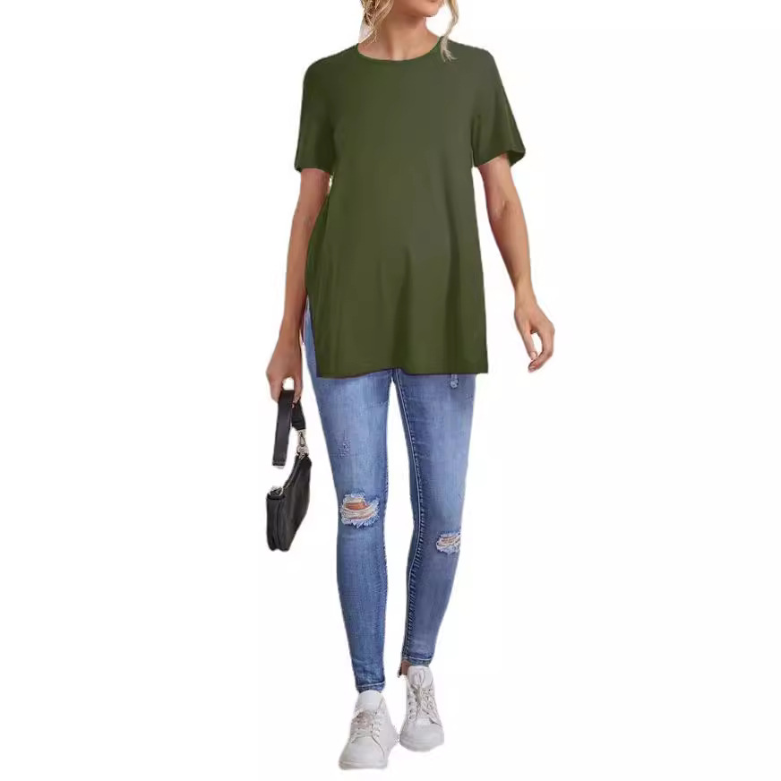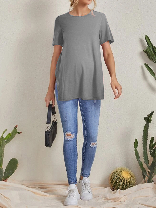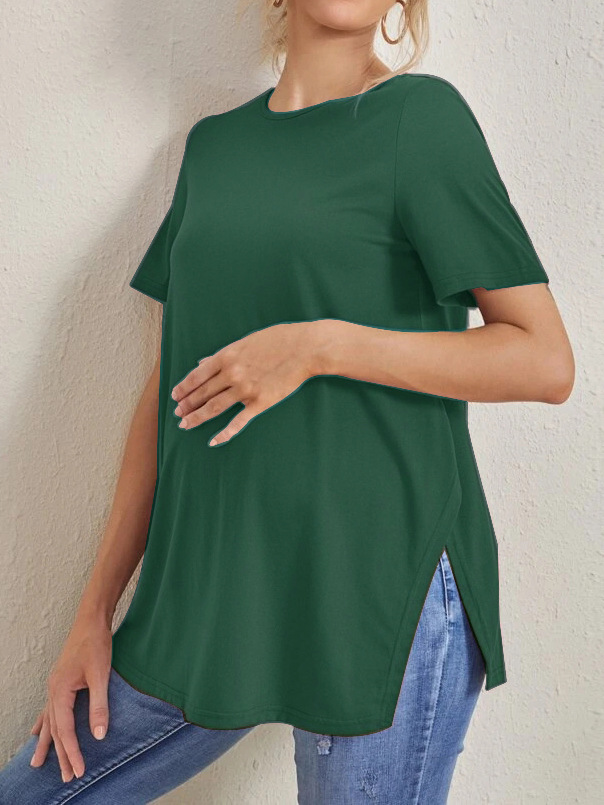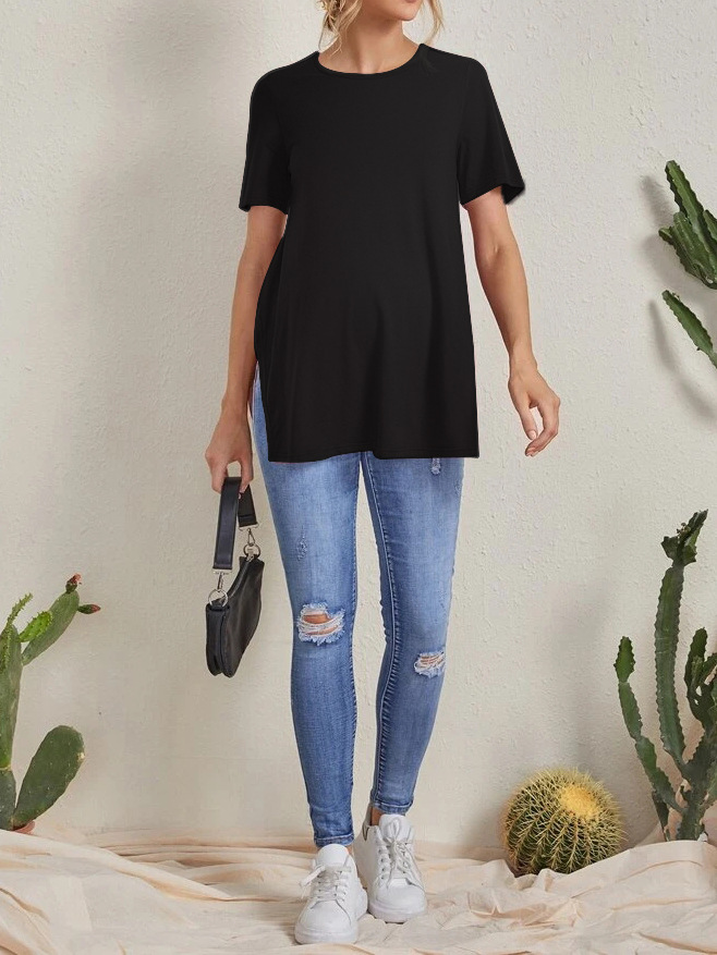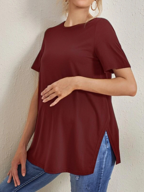 2023 Новый трансграничный модный однотонный топ с круглым вырезом и разрезом Amazon Joker для беременных с короткими рукавами