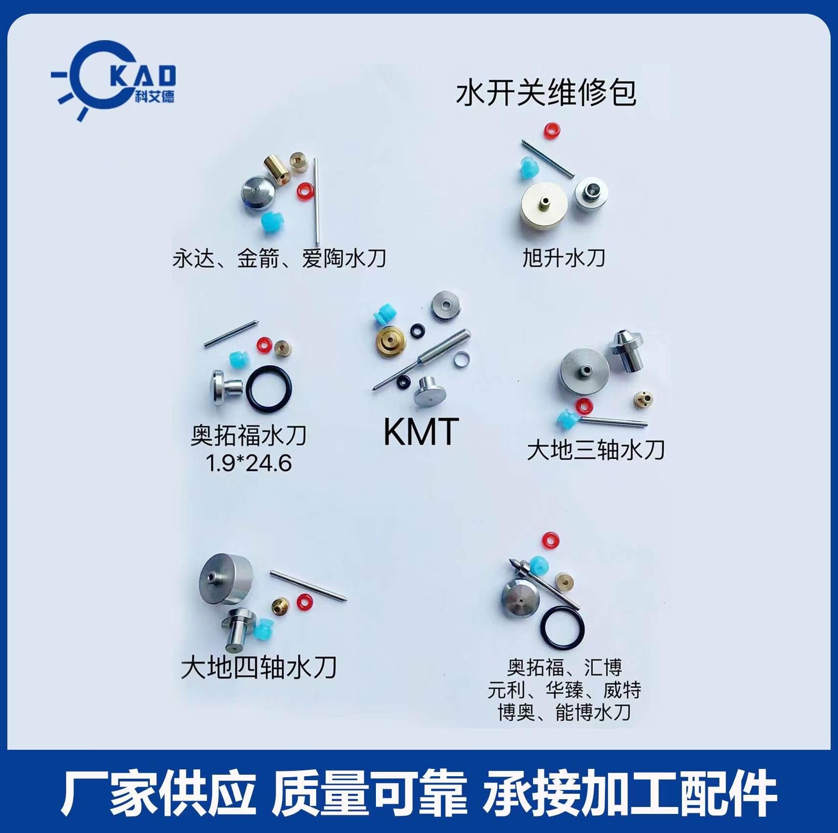 佛山科艾德机械设备有限公司是目前佛山一家专业生产水刀配件,集生产加工、经 销、批发的综合性厂家。水刀增压器总成、刀头总成及各种品牌水刀配件是我公司的主 营产品。公司产品销往国内外知名水射流设备商、各地区设备服务商、贸易商。公司购 入国内外先进的数控设备,拥有生产技术人员,完善的技术指导工程师,专业的售后服 务团队,及先进特别的经营管理模式、全面周到的优化性能,强大客户信息,以敏锐的 市场洞察力,把握市场的先机,致力于追求企业、顾客和其它合作伙伴之间的利益平衡, 亦在同行中赢得了相当高的美誉度和知名度。 我们每一个出售的产品都有专业的质量检测工序,我们坚持让我们的零件成为您可 信赖的产品。