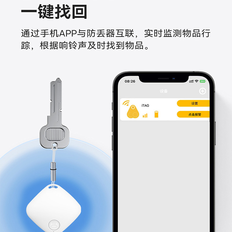 2.双向寻物,手机忘记拿了?边接按两下防丢器,手机报警,钱包忘记哪了?按下手机APP里的呼叫,防丢器报警,顺着声意点找回