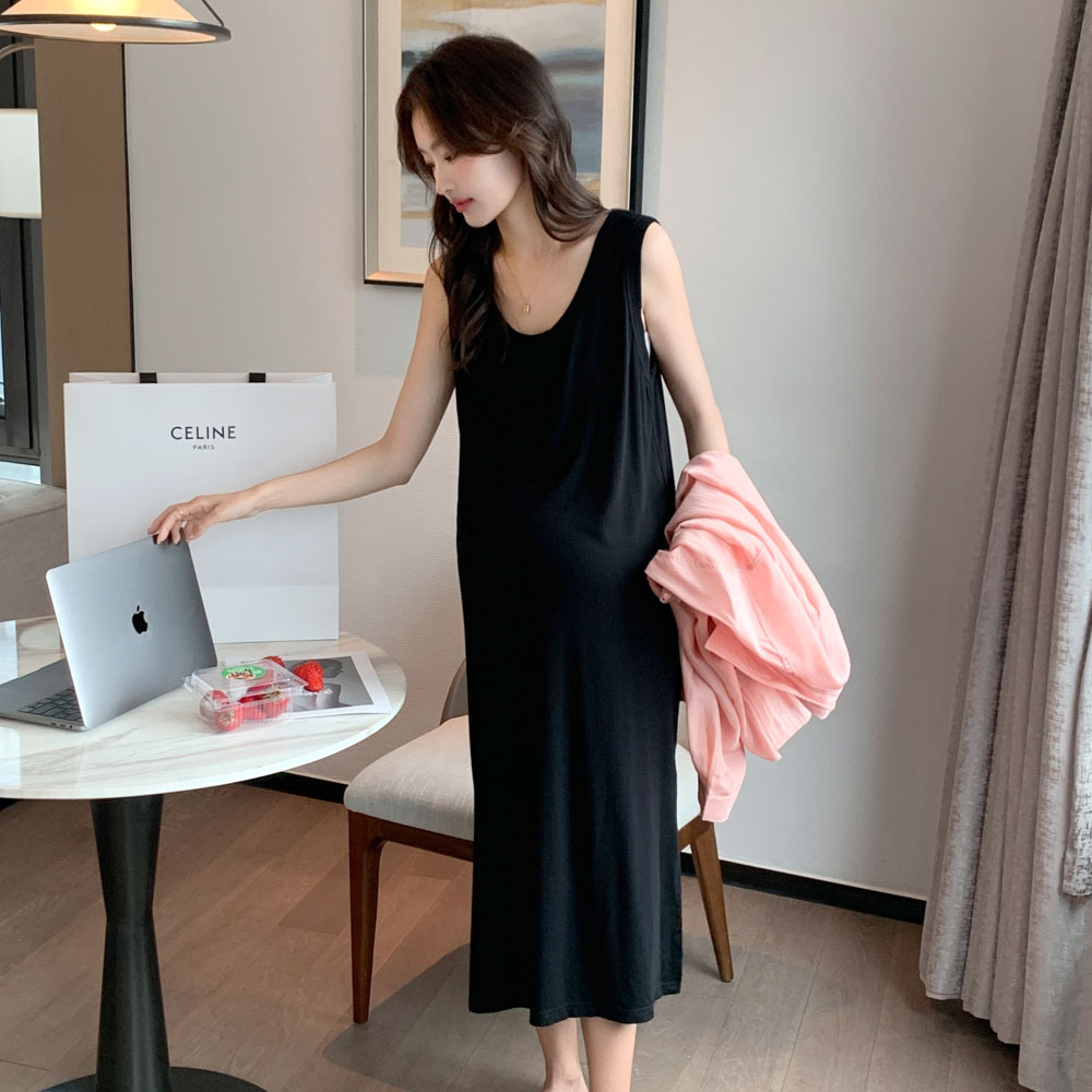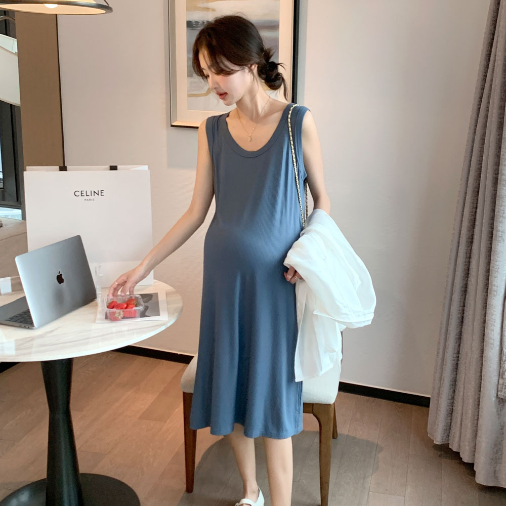 Новое летнее платье для беременных, повседневное эластичное облегающее платье в Корейском стиле с круглым вырезом, модное трикотажное платье без рукавов для мам средней длины