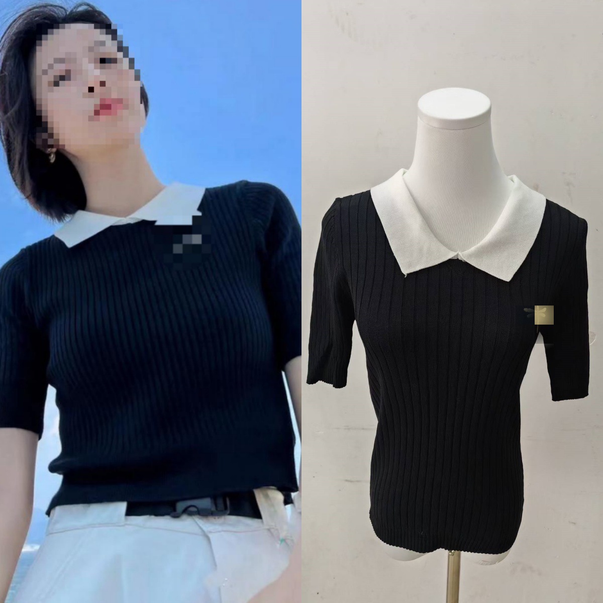 Love Only Liang You An Zhou Yu Tong Тот же стиль Стрекоза вышитая лацканами Вязаный короткий рукав Свободный короткий топ для похудения
