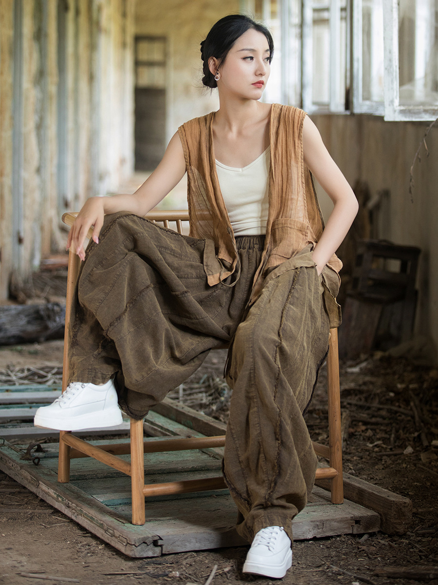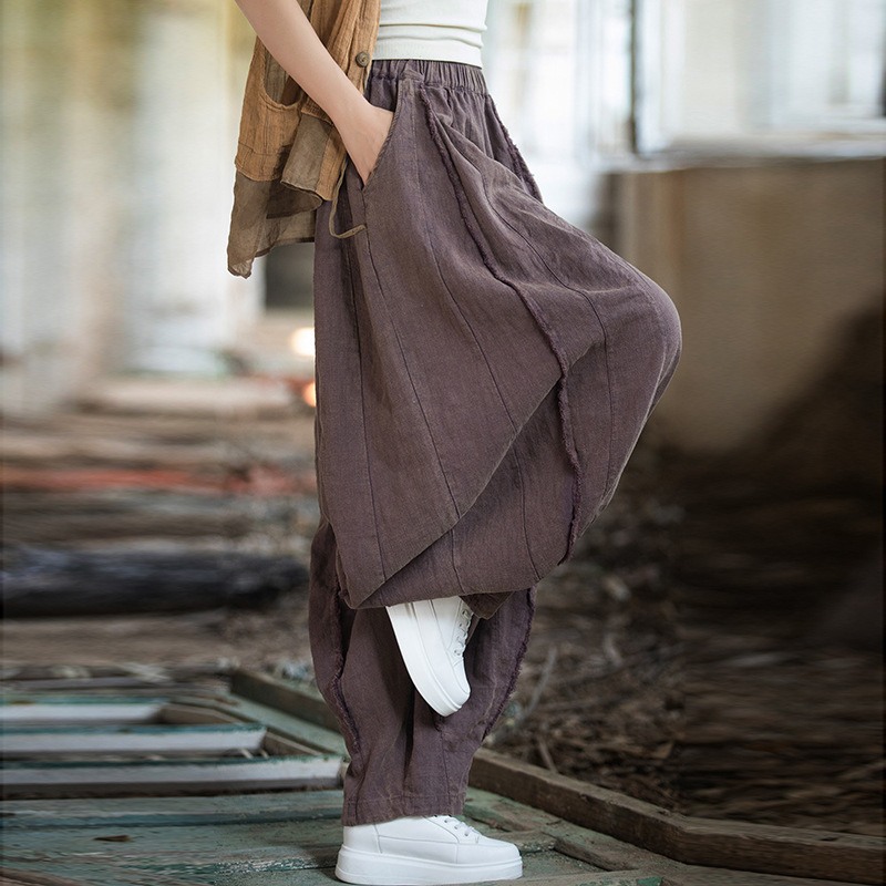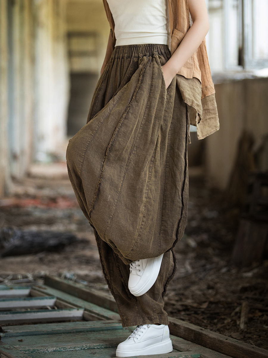 Женские повседневные длинные брюки из хлопка и льна, коллекция Осень/Зима 2025, новинка, с эффектом песочной стирки, начёсом, в стиле пэчворк, с эффектом потертости, 32 элемента, модель «Тыква»