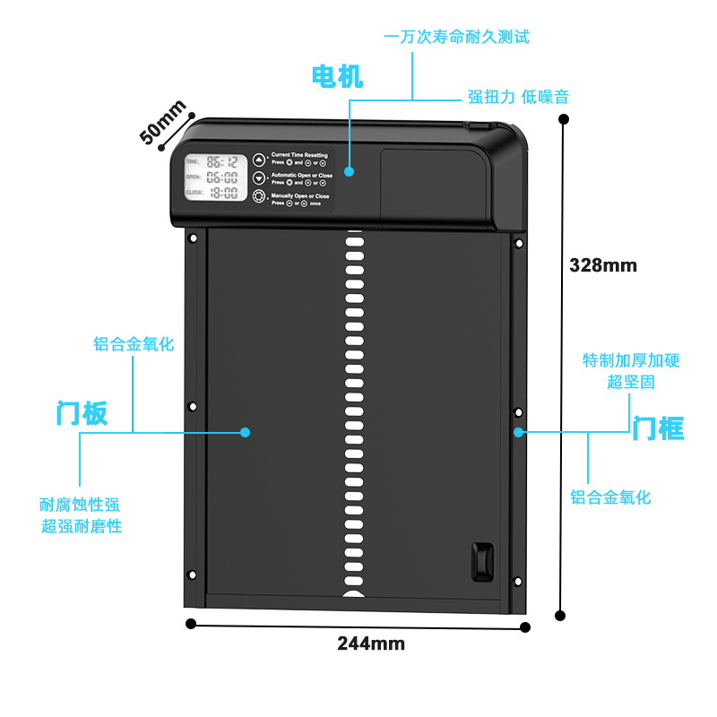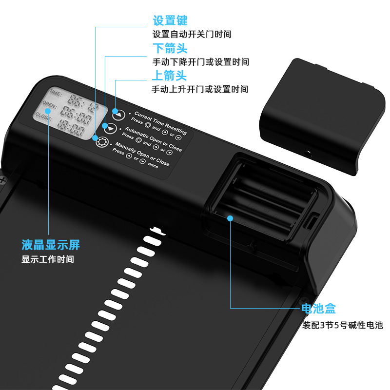 2)2)LED显示屏24H定时器,可自由定制每天开门和关门时间,精确到分。
