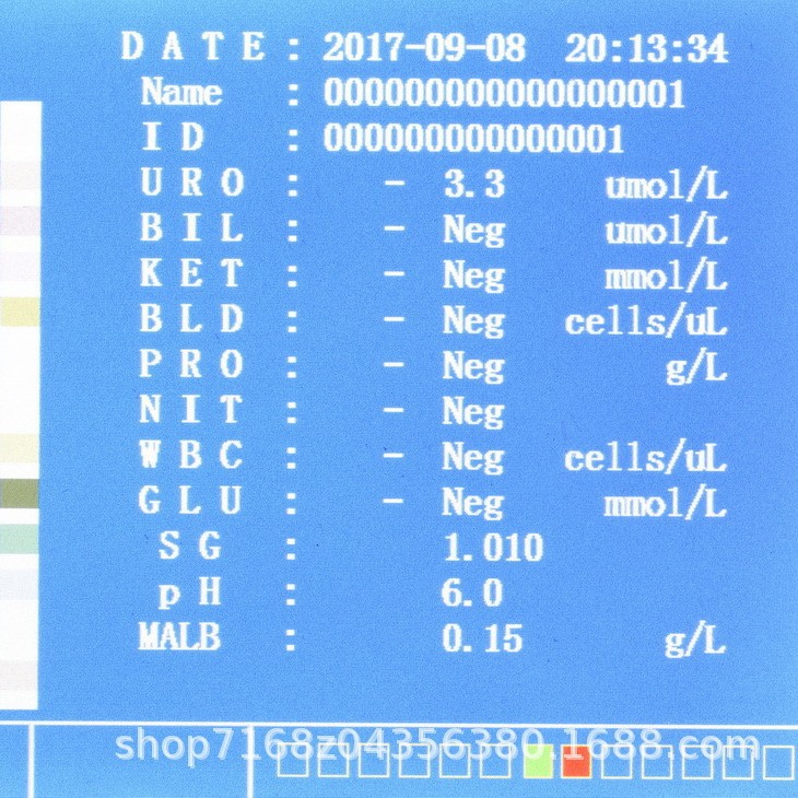 - 检测项目: 白细胞,亚硝酸盐,尿胆原,蛋白质,pH,潜血,比重,酮体,胆红素,葡萄糖, 肌酐,抗坏血酸,微量白蛋白,尿钙