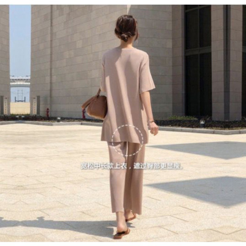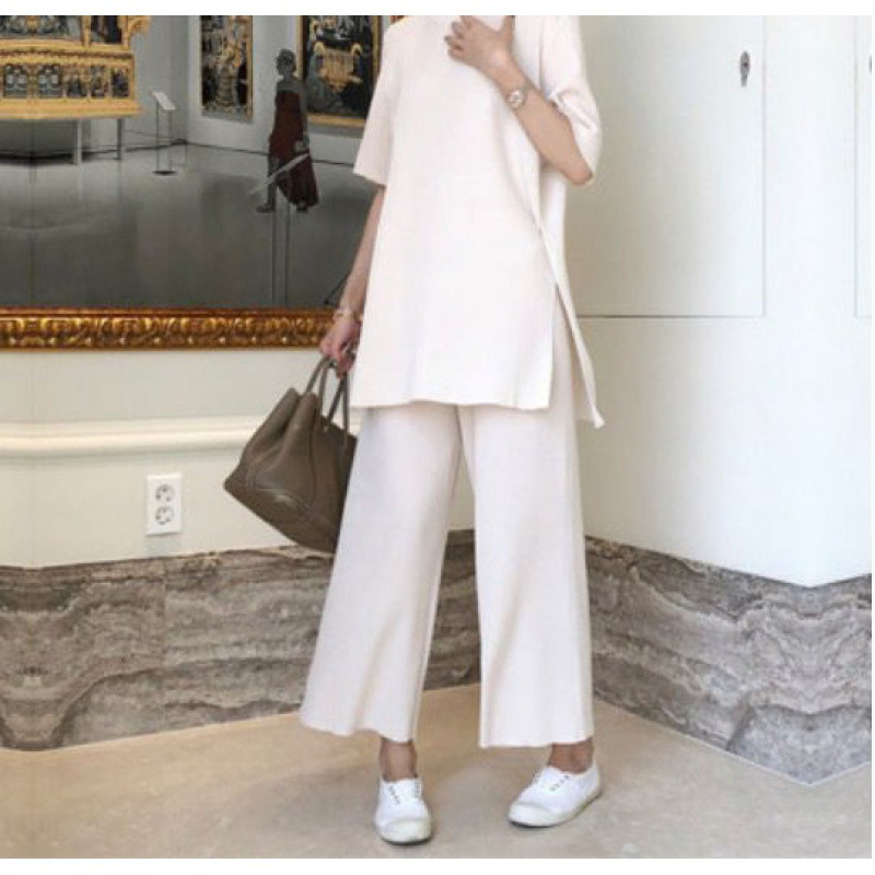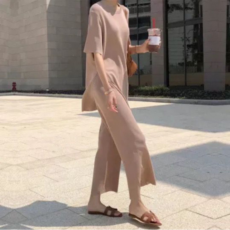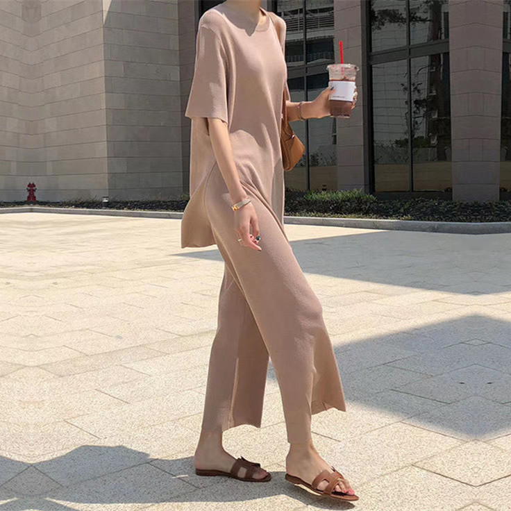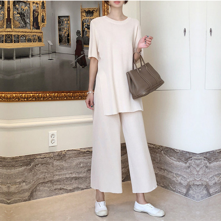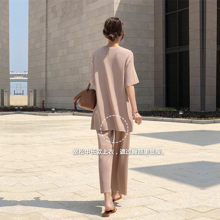 Корейский стиль, модный трикотаж с разрезами, большие размеры, широкие брюки с девятью точками, ленивый повседневный комплект из двух предметов, небольшой ароматный костюм