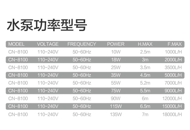 CN-8100-10W; CN-8100-18W; CN-8100-25W; CN-8100-35W; CN-8100-55W; CN-8100-75W; CN-8100-90W; CN-8100-115W; CN-8100-135W