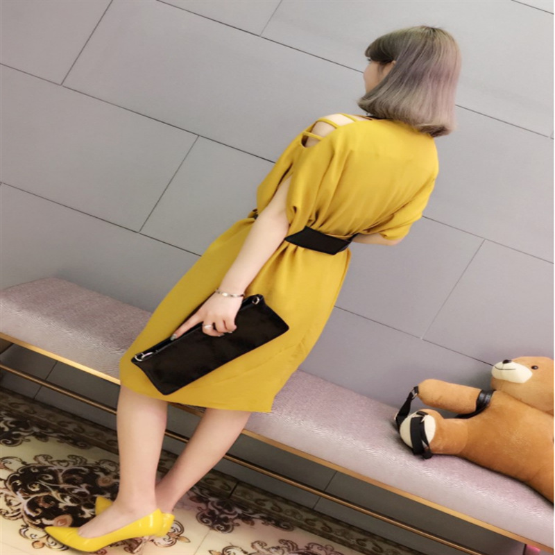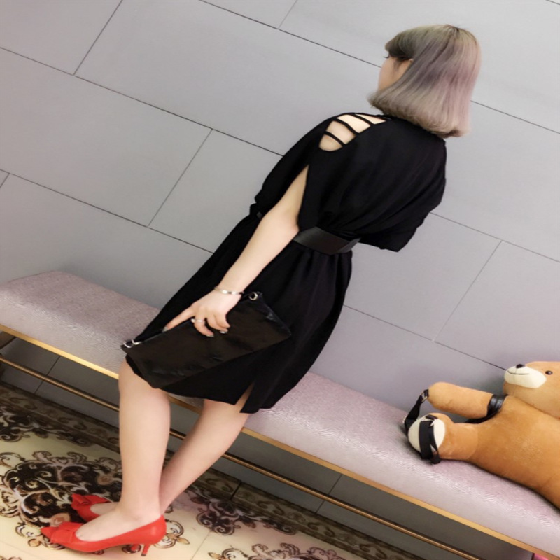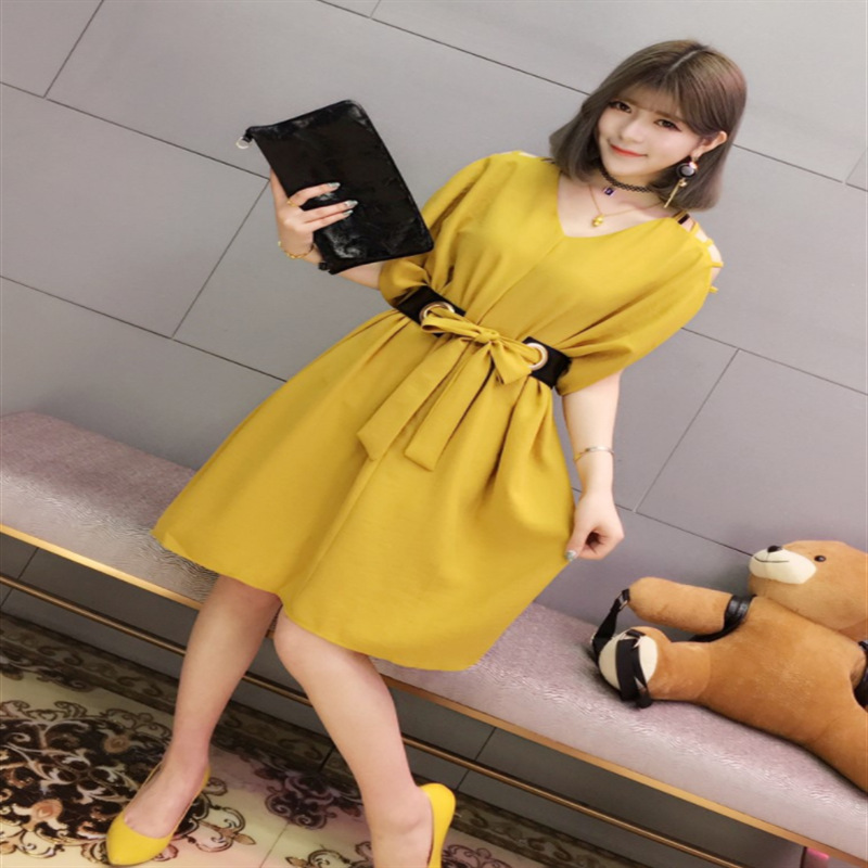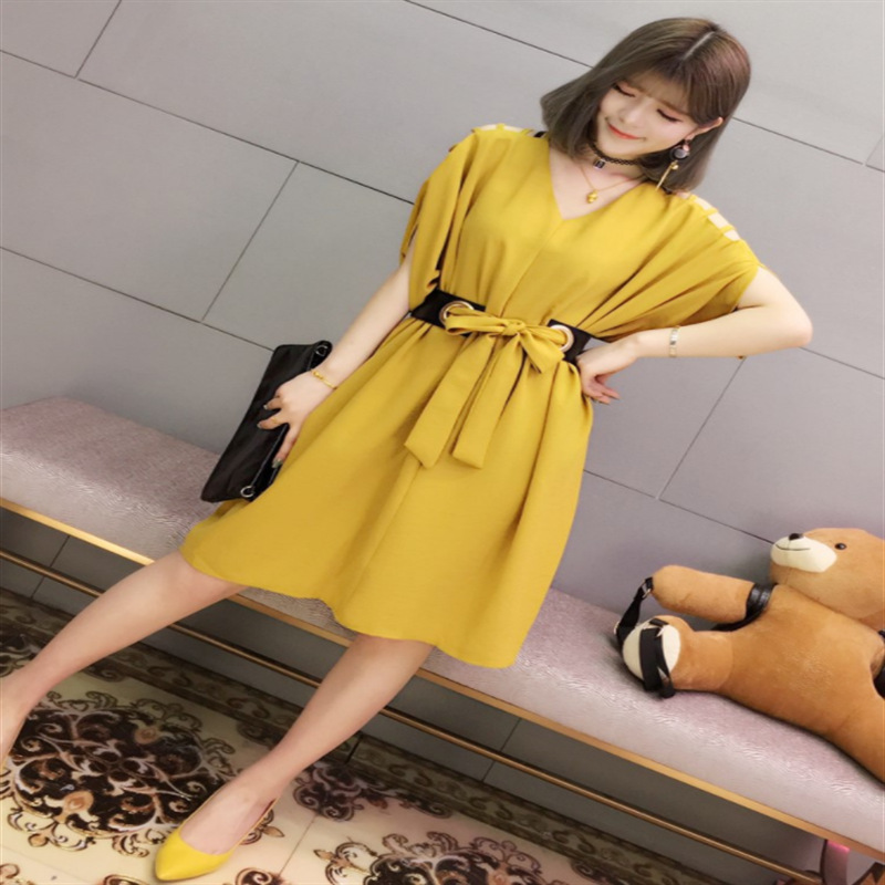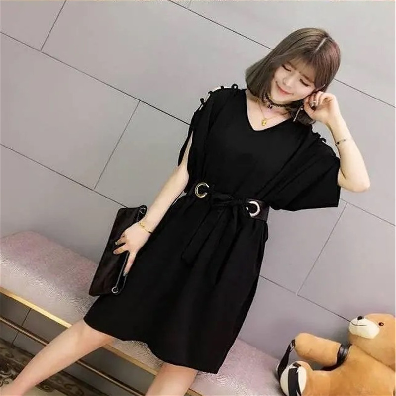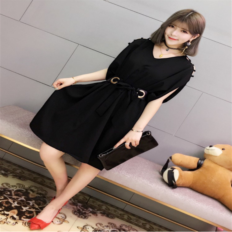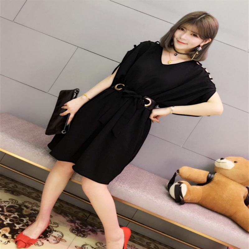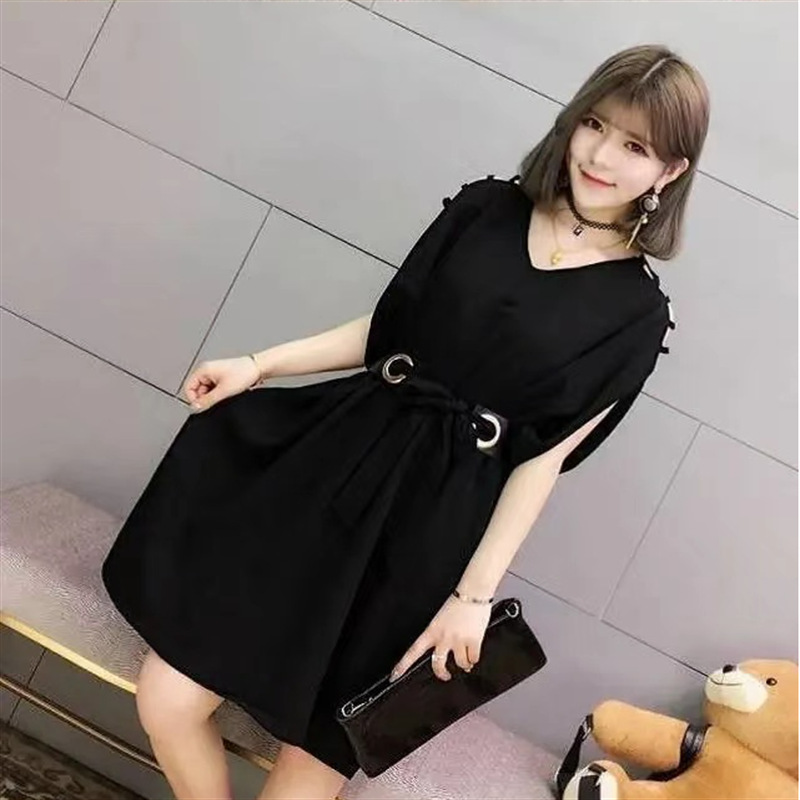 Женское корейское платье с открытыми плечами, лето 2025, новый стиль для девочек больших размеров, с рукавами «летучая мышь» и свободным кроем 100kg