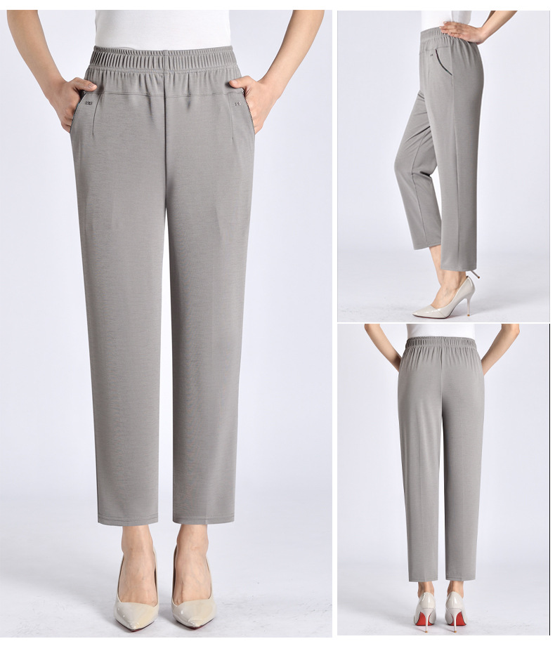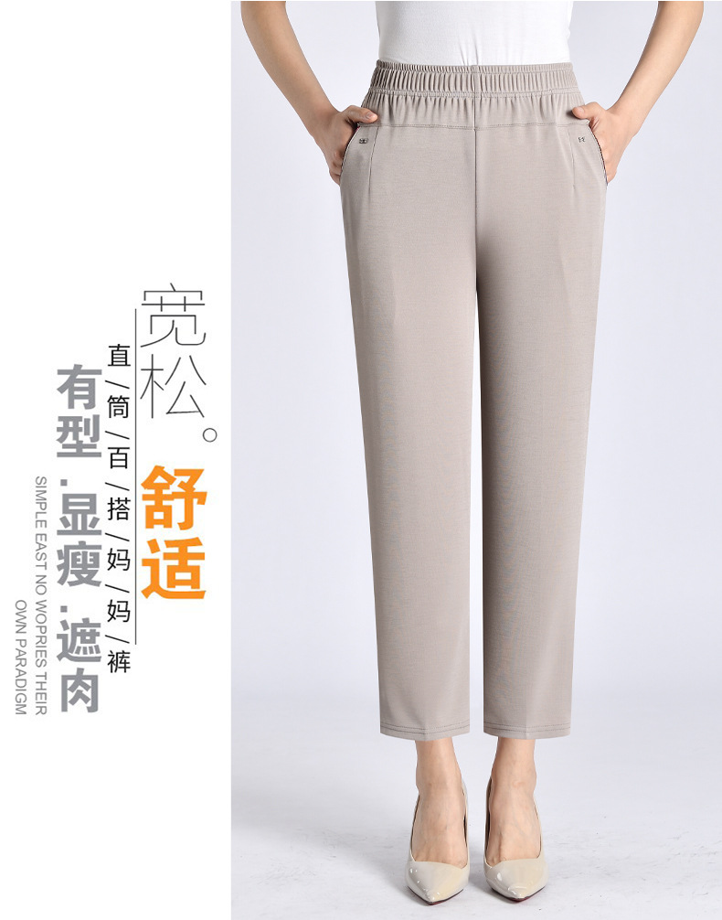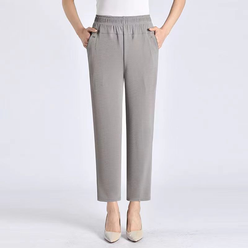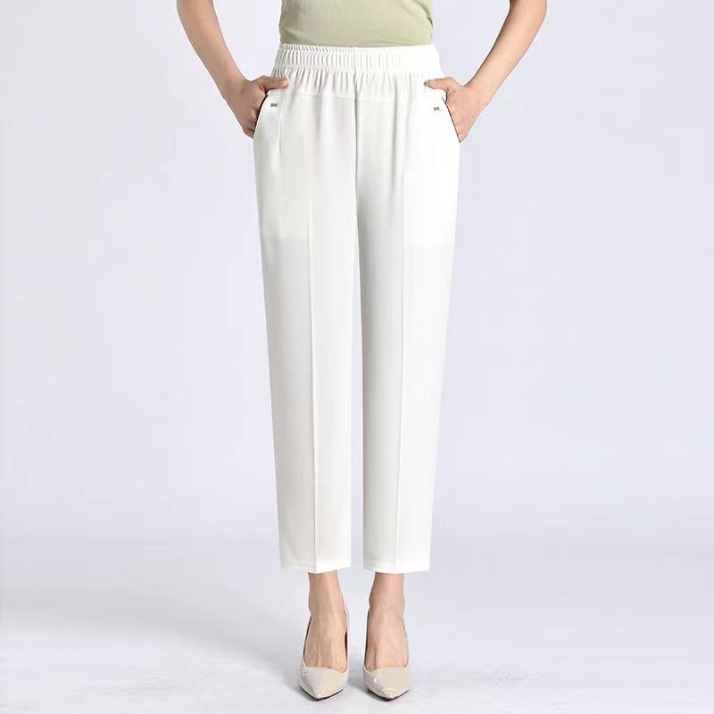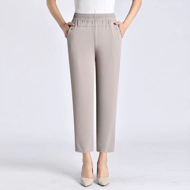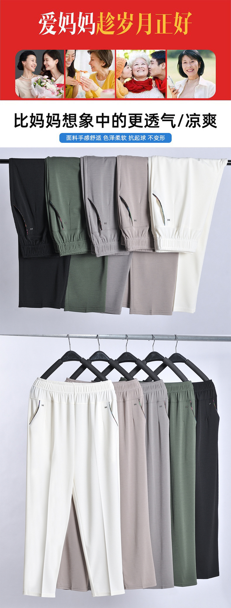 Брюки для мам, летние тонкие укороченные брюки из ледяного шелка для женщин среднего и пожилого возраста, свободные прямые брюки больших размеров для бабушек