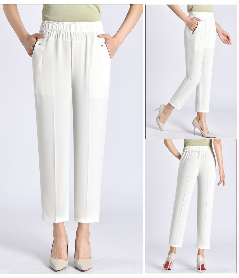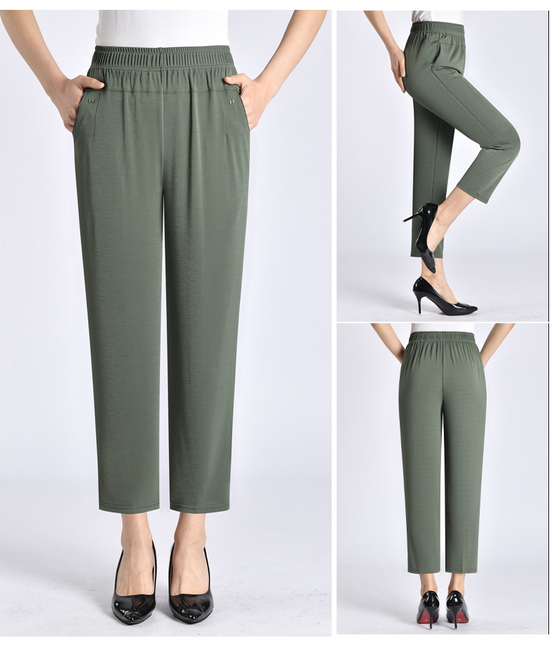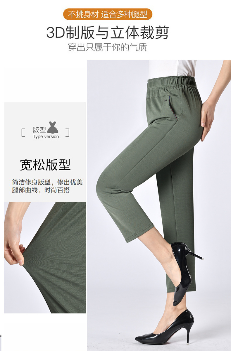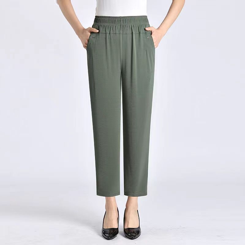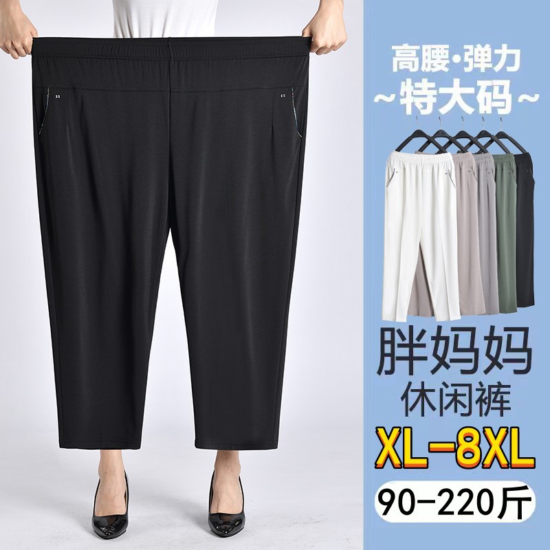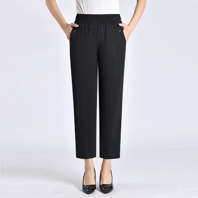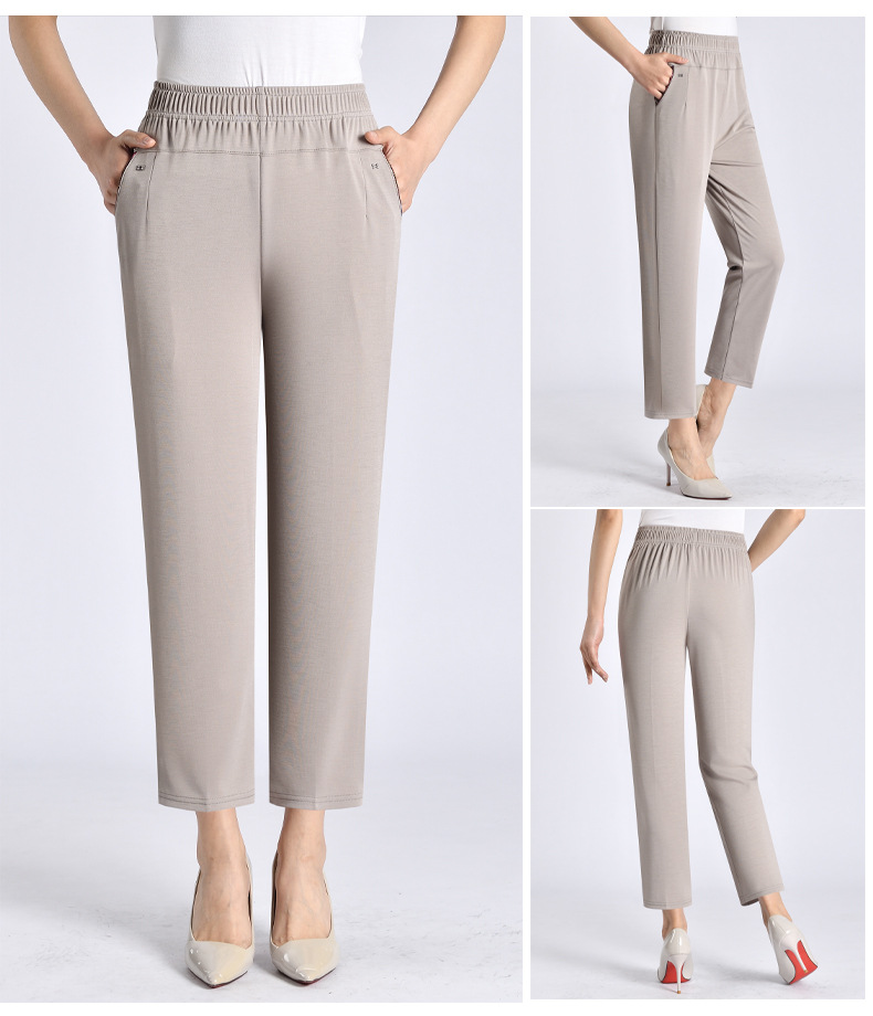 Брюки для мам, летние тонкие укороченные брюки из ледяного шелка для женщин среднего и пожилого возраста, свободные прямые брюки больших размеров для бабушек