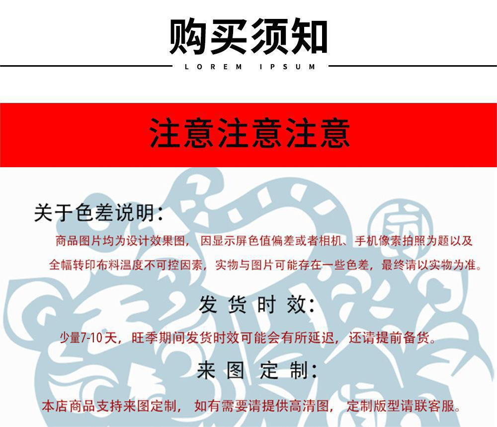 此链接产品均为定制款,按单一单一制作,下单制作后不支持退换,数码印花类 因为显示器以及模特角度不同 实物和效果图可能有轻微色差和细节区别,请仔细阅读详情说明,拒绝以任何工艺理由退款,完美主义或要求过高者请谨慎下单,下单默认认同,谢谢!