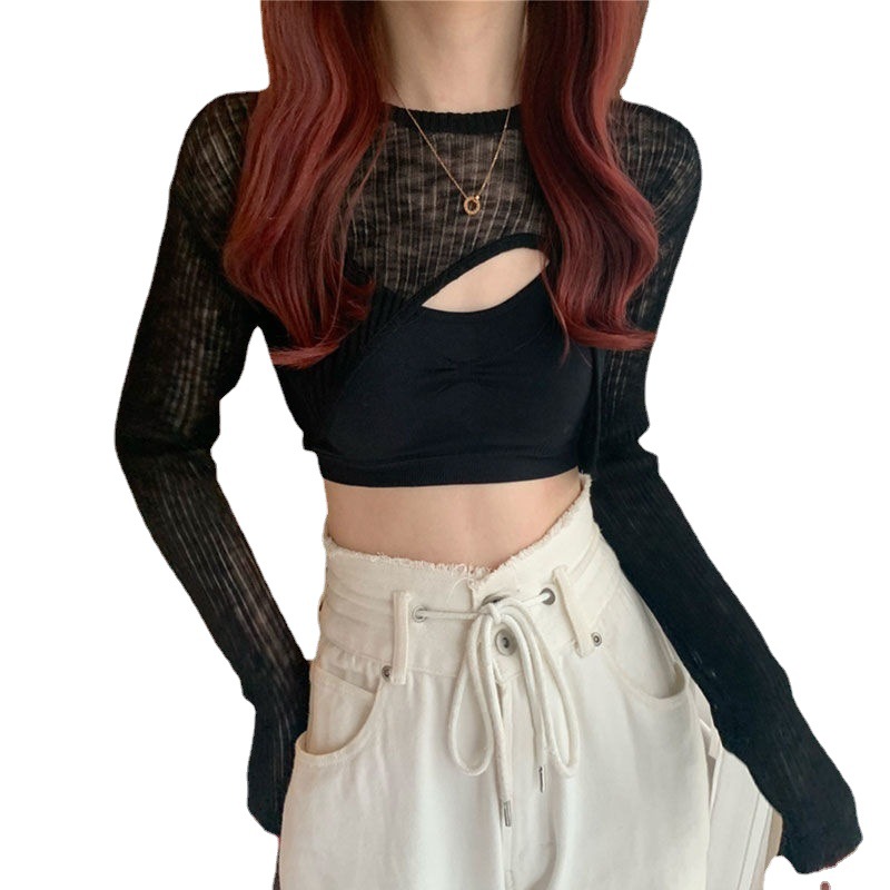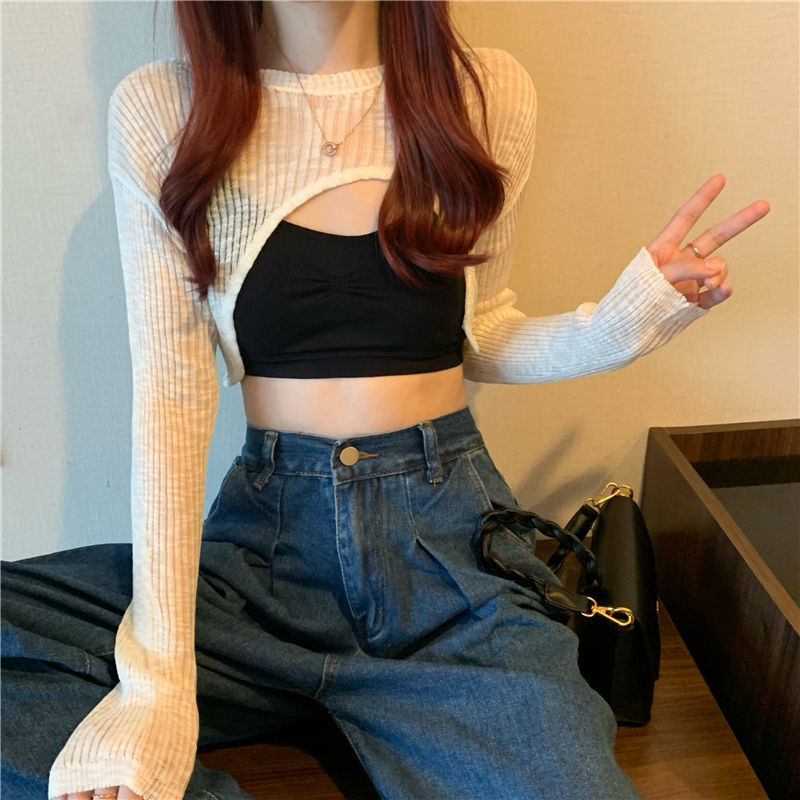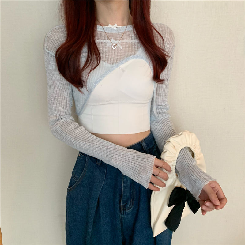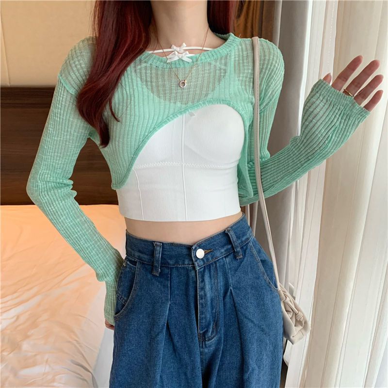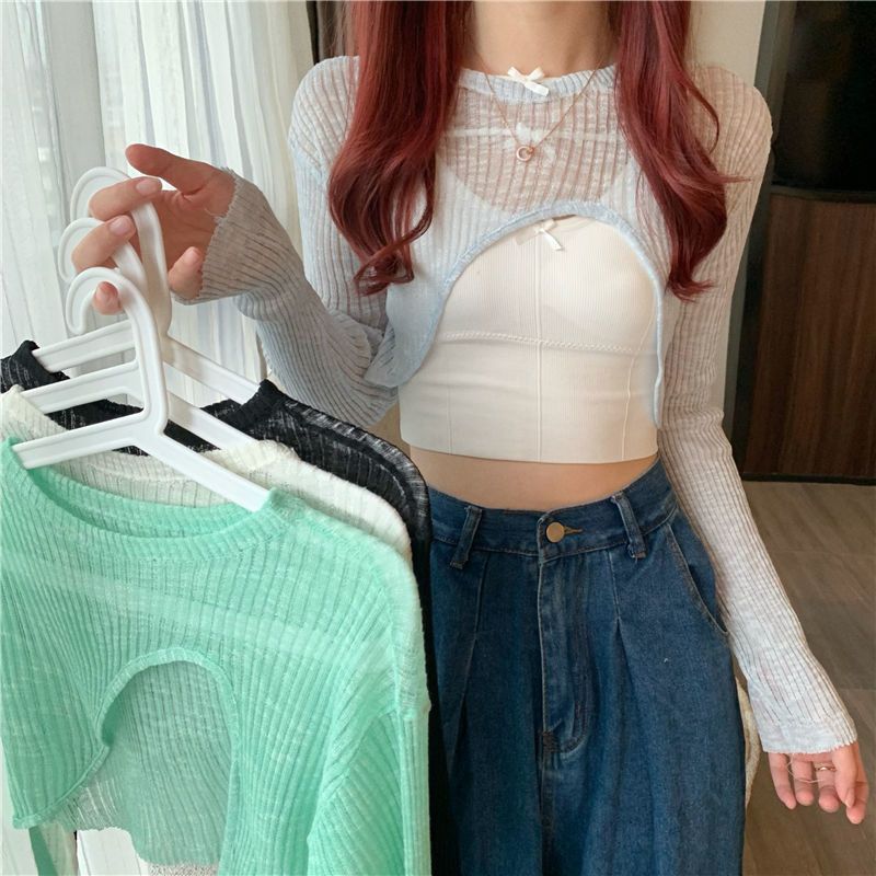 Тонкий укороченный свитер с длинным рукавом Солнцезащитная одежда для женщин 2023 Летний Новый Ультра короткий топ однотонная блузка кондиционер
