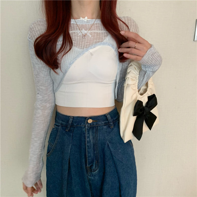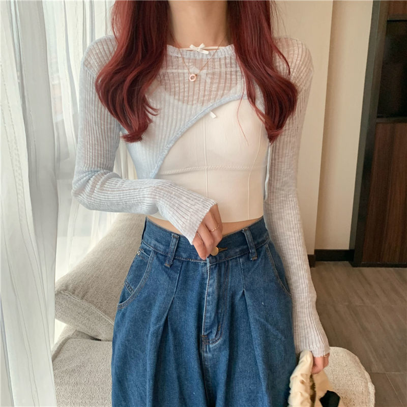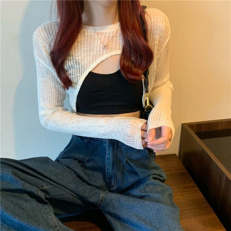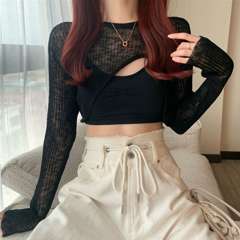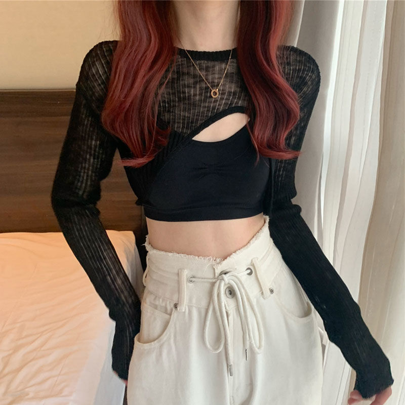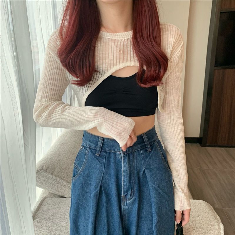 Тонкий укороченный свитер с длинным рукавом Солнцезащитная одежда для женщин 2023 Летний Новый Ультра короткий топ однотонная блузка кондиционер